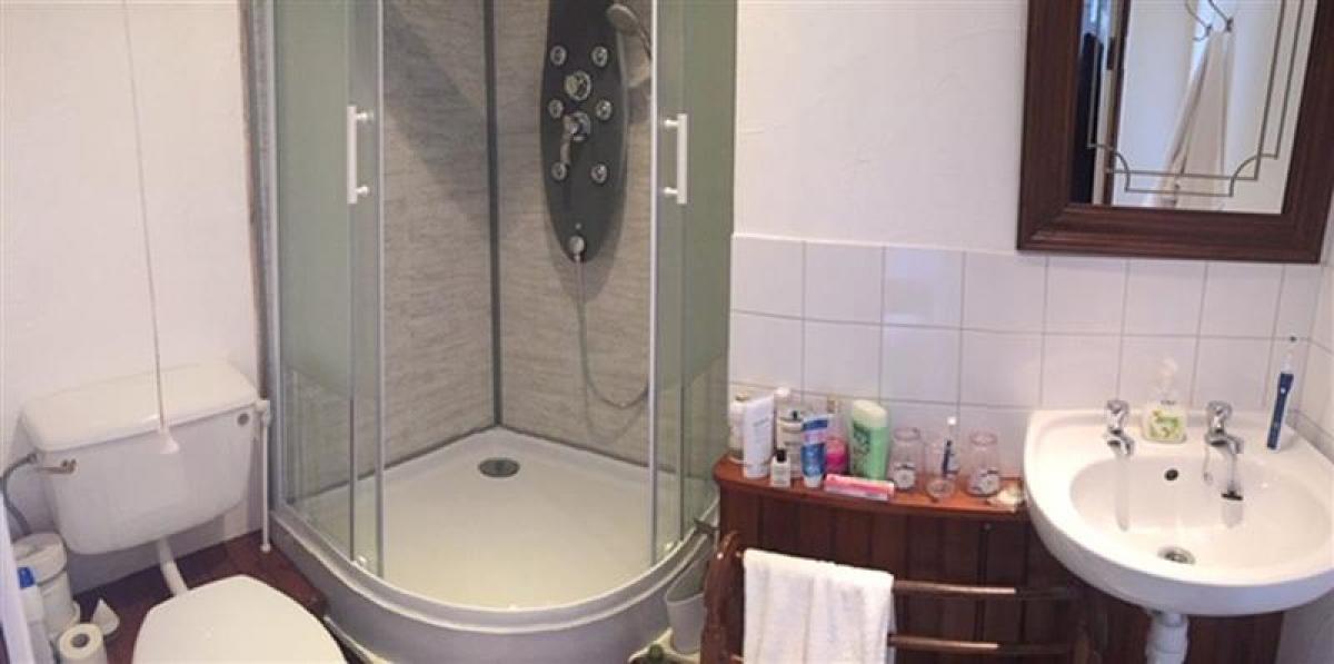 Shower room: velux window to rear, shower with new tray (May 2019), hand basin, toilet, access to eaves storage. Down lights, electric heater, shaver socket, mirror.