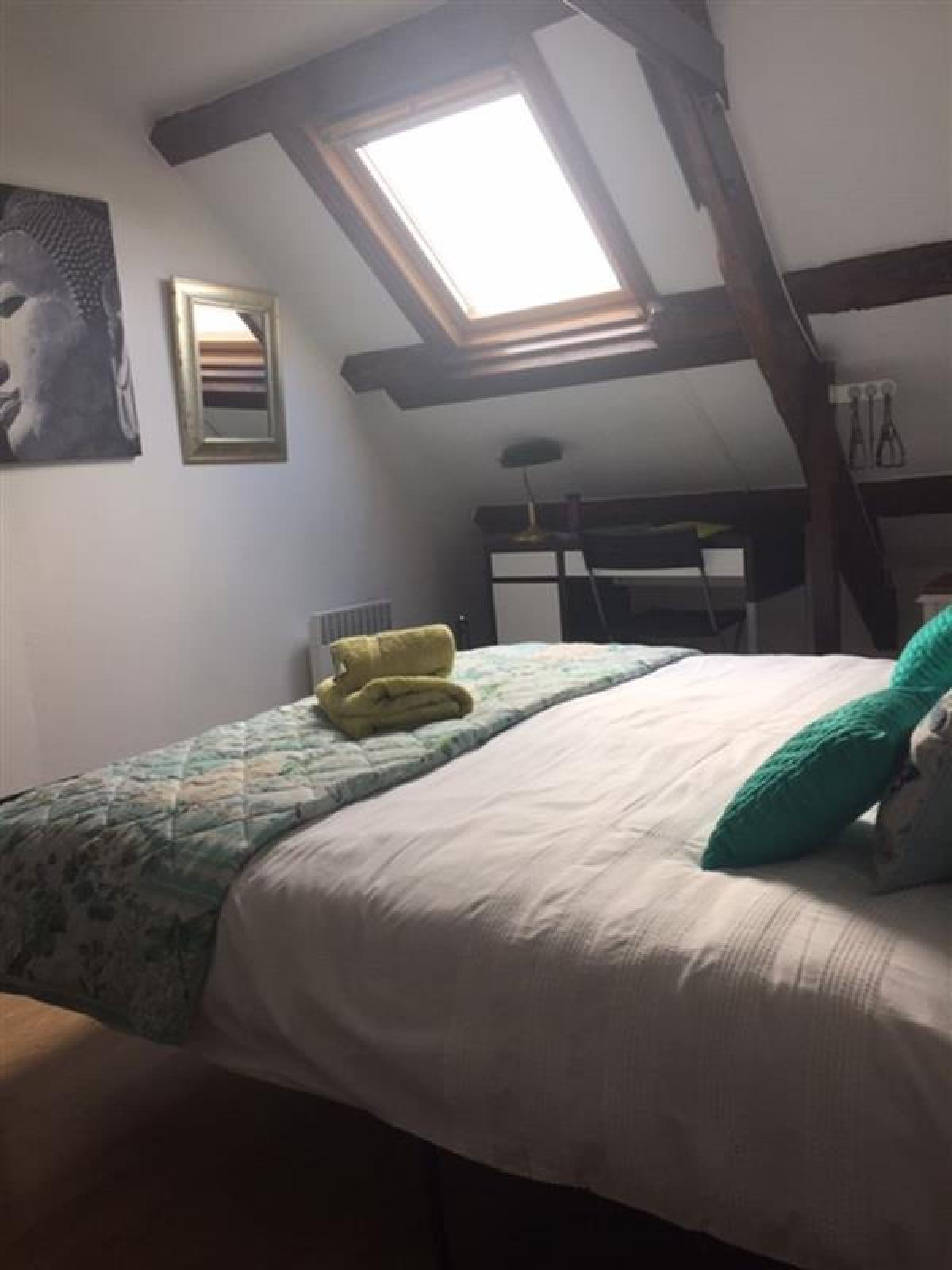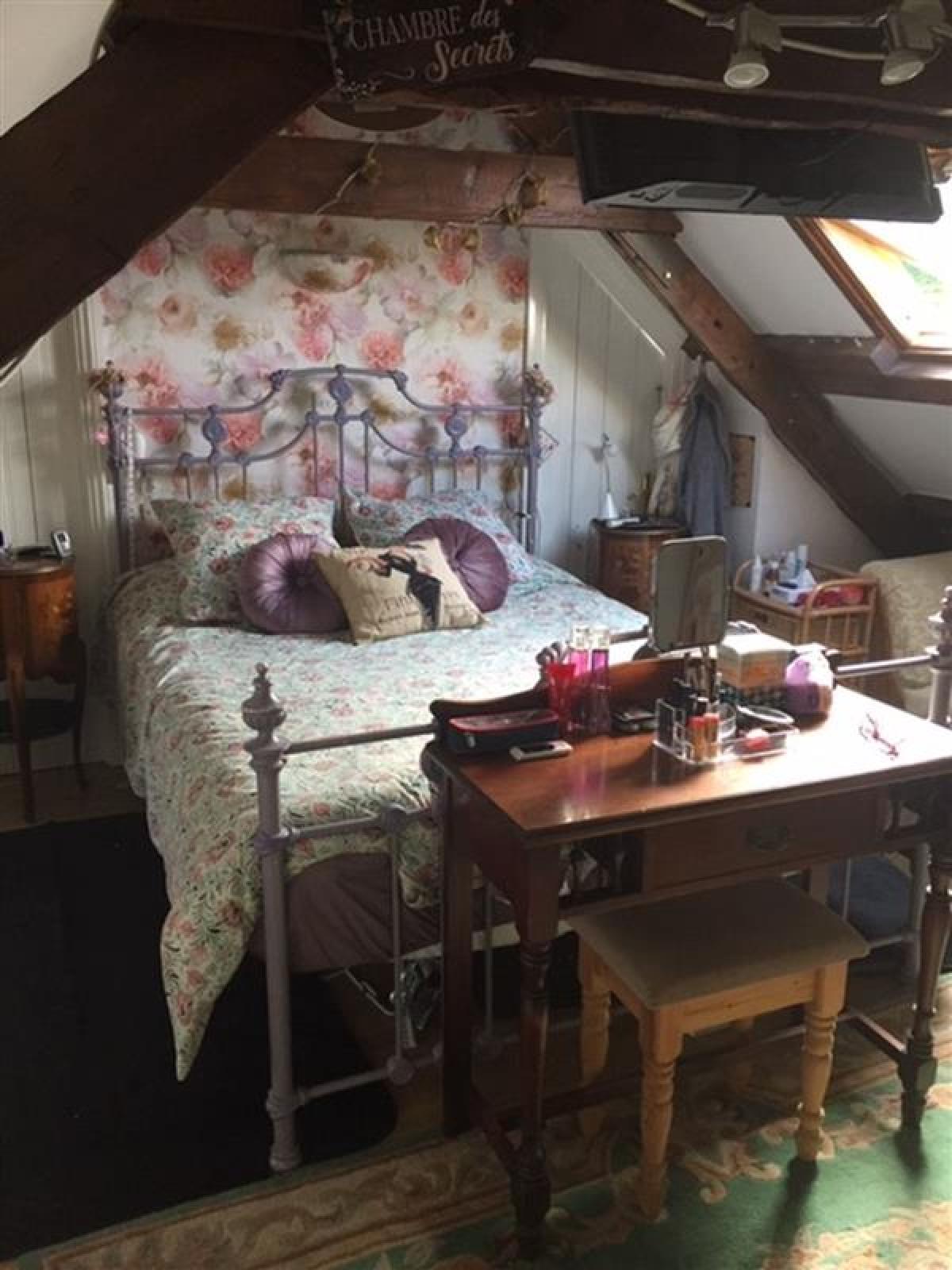 Bed 5: Attic room with sloping ceiling and original beams. Velux window with blind, & views of garden and countryside beyond. Laminate flooring, electrical sockets. Electric heater.