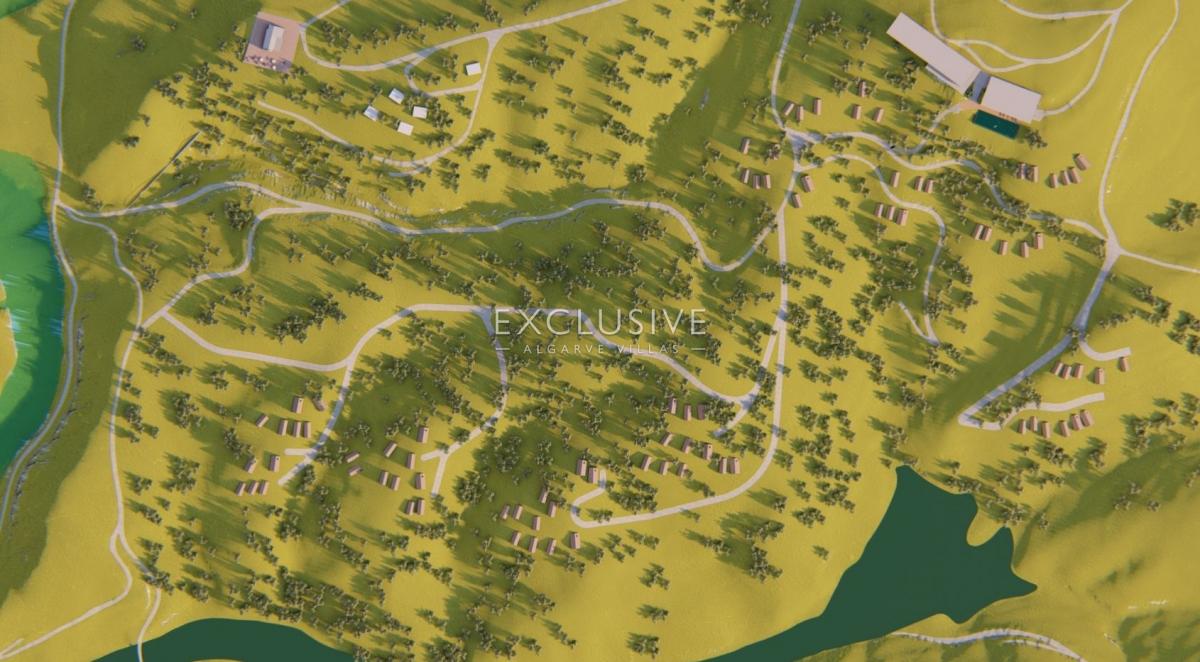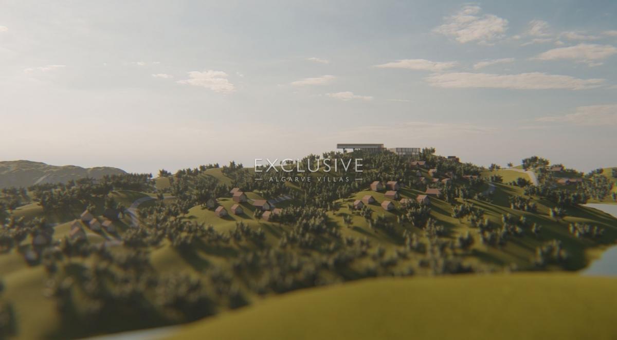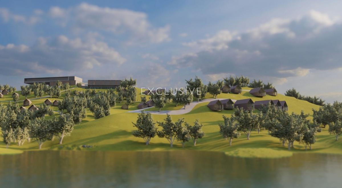 This large plot of land is near the Dam of Funcho, in Silves, has various mountains, lakes, electricity, and fantastic country views. It has viability for construction of a touristic resort, hotel, or other nature tourism type of development. It has various lakes, electricity and great accesses from either the IC1 from Lisbon, Messines or Silves. The current Project is for a hotel with swimming pool, restaurante/bar with terrace, a group of bungalows of various sizes, and a leisure área along the water for sport activities and leisure, plantation and farming áreas for the consumption of the hotel guests. The hotel is in two blocks. One of them has the reception, backoffice, meeting and conference rooms, and 19 suites. The second block, the restaurant, kitchen, Bar, gym, SPA, change rooms, swimming pool, and leisure área with panoramic views. There is two types of bungalows, both in wooden structure. One group of one bedroom units, with kitchenette, bathroom and one bedroom, with corten steal exterior. The rest are one bedrooms, 1+ mezzaninne, and two bedroom units with a unique roof inclination and balconies. The entire complex has leisure áreas, trails, lakes, swimming pool and green áreas.