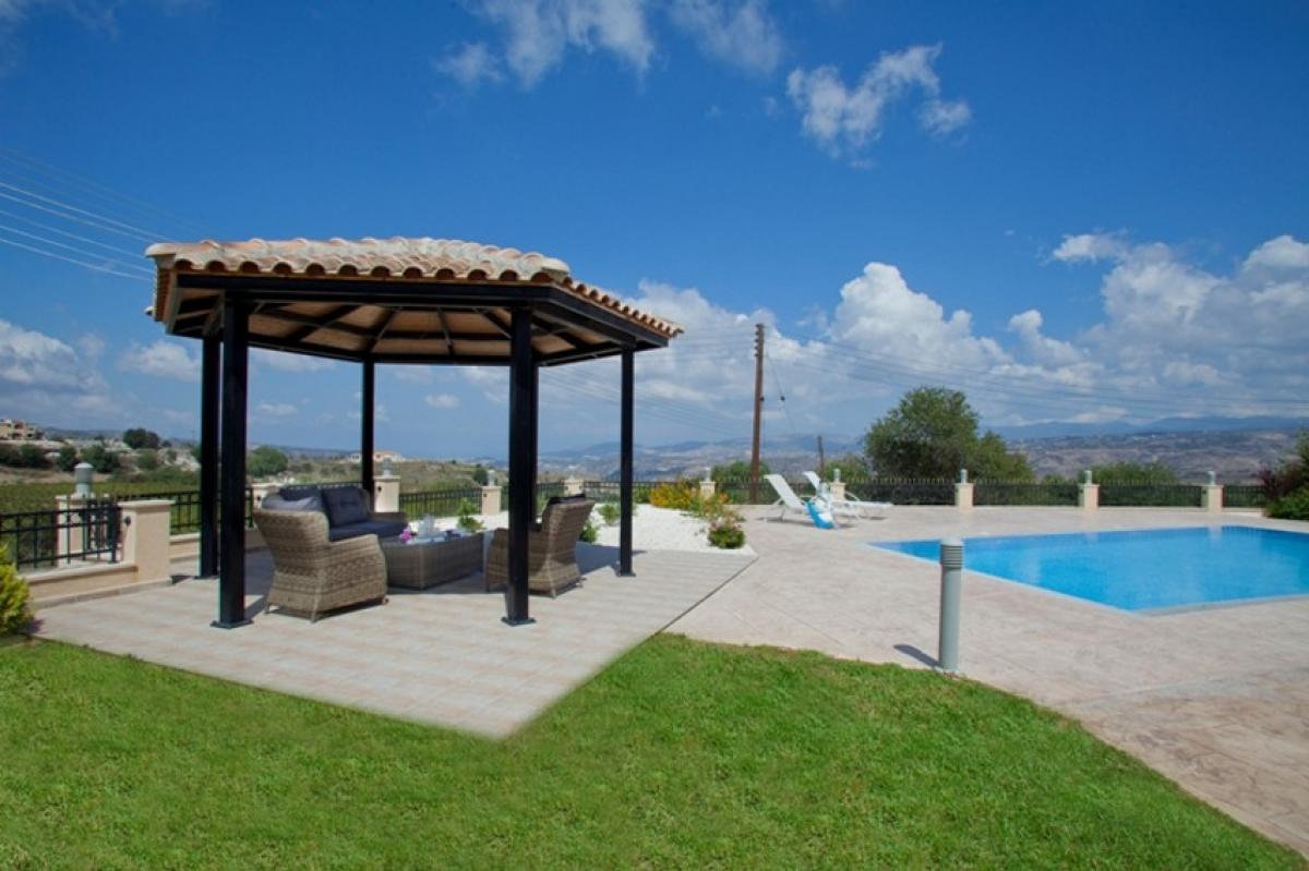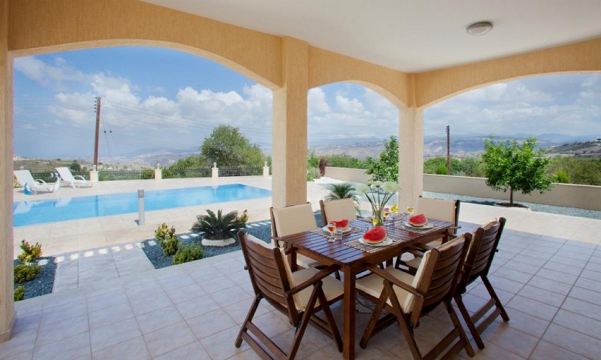 This Luxury villa is situated on the outskirts of Stroumbi Village, and offers the utmost in country living. It sits on a plot of 1,350 m2 with Private Swimming Pool, Beautifully maintained Lawns, Tiled Patios and Landscaped Mature Gardens which provide total comfort, beauty, privacy and offering plenty of space for entertaining. Upon entering the property is the spacious living area which is an open plan to the fully equipped Kitchen. The Wood Burning Fireplace with stone cladding surrounds makes this area nice and cosy giving off plenty of heat in the cooler winter months. The french doors from the living area lead out to the covered veranda offering a beautiful seating area with endless Mountain Views. Also on the ground floor there is one double bedroom with fitted wardrobes and an ensuit shower room. On the first floor there are three double bedrooms, all with en-suite bathrooms and fitted wardrobes. Next door to one bedroom there is a fully equipped utility room. The main bedroom has an easy access to the large balcony offering simply stunning unobstructed mountains views.