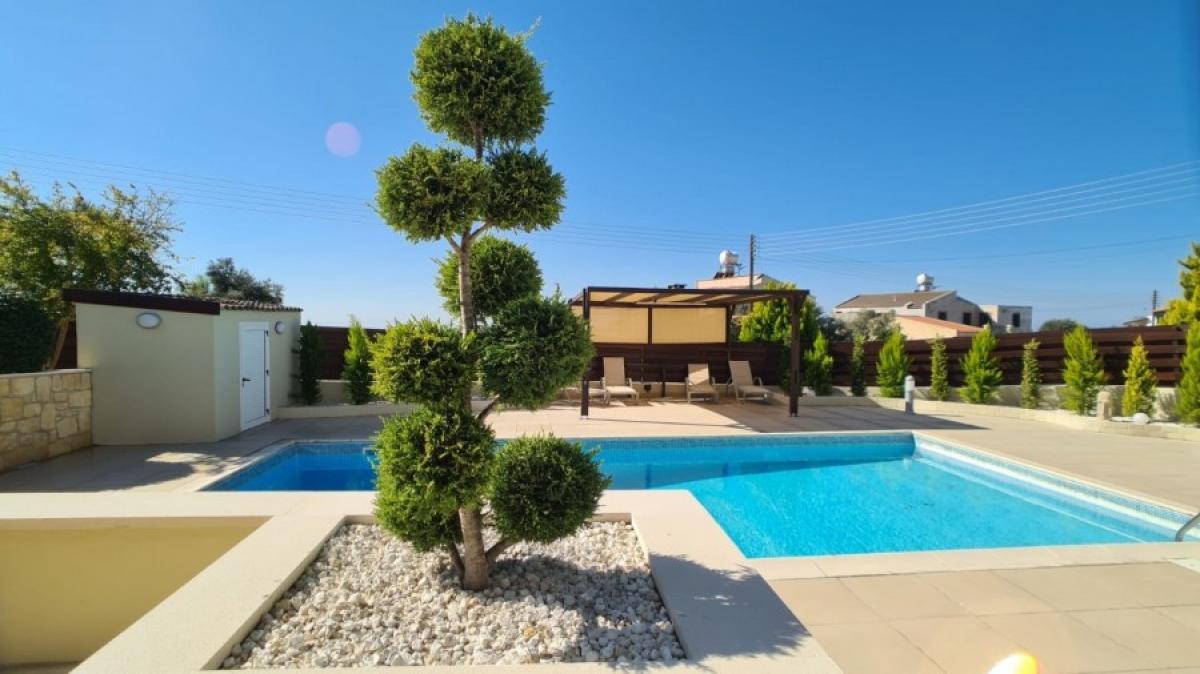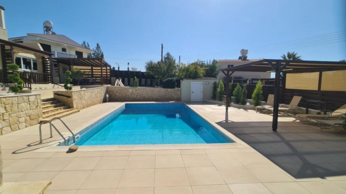 Villa with 4 nice size bedrooms and 3 beautiful bathrooms. This villa is located in a quiet area of Tala with outstanding sea views, close to main roads, shops and schools. The plot is 970 sqm where you will find a large swimming pool, spacious outdoor kitchen, beautifully and large landscaped garden and a playground for your children. The house is spacious with covered and uncovered seating areas, a place for BBQ and other extras. Ideally suited for working from home with the possibility of an office room.