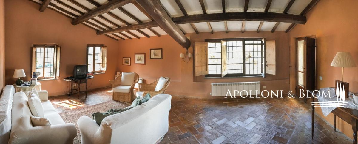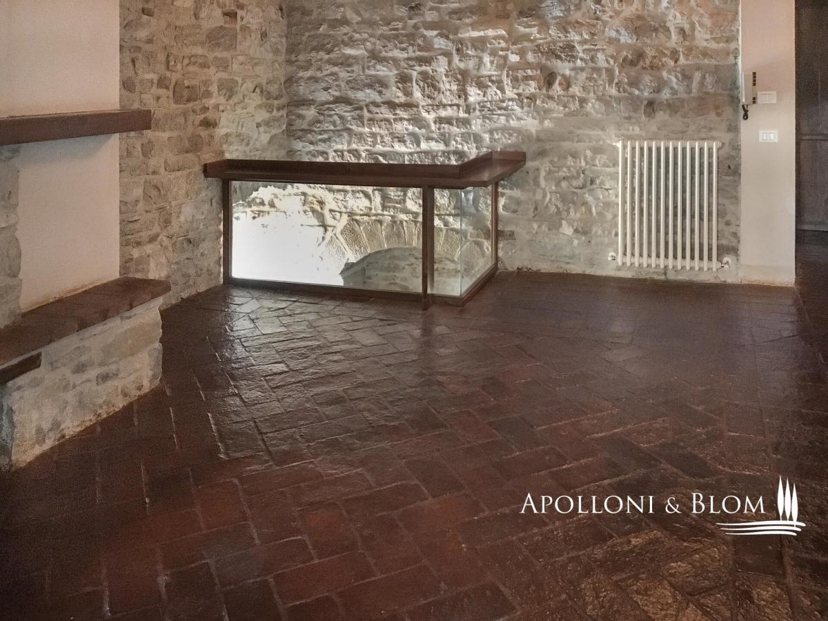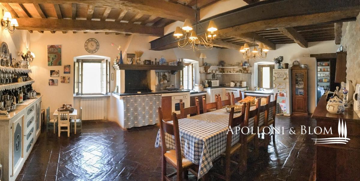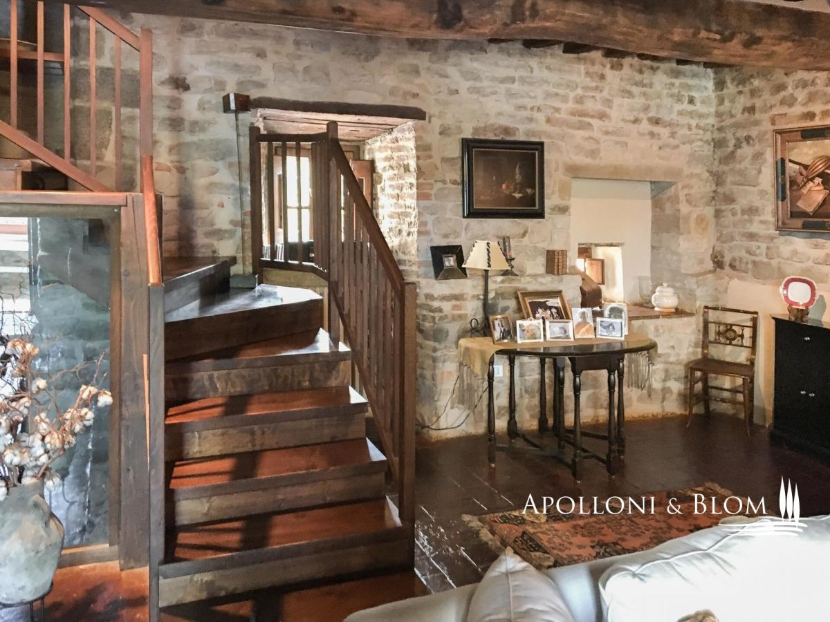 Historic Country Estate with three-story stone villa, guest cottage, annex, panoramic pool, park and land for sale in Umbertide, east from Perugia. Commanding a privileged hilltop position in the green heart of Umbria, this historic country estate ois surrounded by 18 hectares of woodland and pasture, it enjoys sweeping views and an atmosphere of peace and timeless charm, yet remains conveniently close to services and key connections. It is accessed via a well-maintained gravel road, which gently winds through the forest and opens to the estate, enhancing the sense of seclusion and arrival. At its centre stands a handsome three-storey stone residence spanning 637 square meters (6856 sq ft) of considerable character, restored with exacting attention to tradition and detail. Original stonework, exposed wooden beams, and handmade terracotta floors anchor the interiors in the region’s rural vernacular, while thoughtful restoration has introduced understated elegance and comfort throughout. The atmosphere is one of warmth, authenticity, and quiet sophistication. On the ground floor, generous living spaces flow naturally from room to room, including a sitting area with fireplace, a second reception space, two bedrooms, a bathroom, and a cellar. One wing of the house features a private entrance from the garden and is currently used as a wine cellar and storage area. A separate self-contained apartment is also located on this level, perfect for guests or staff, arranged over two floors with a cosy living space, kitchenette, bathroom, and mezzanine sleeping area. The first floor is centred around a luminous salon with a grand stone fireplace, leading into a spacious country kitchen and an additional lounge. Two bedrooms and a bathroom complete this level, with internal and external access allowing privacy and flexibility of use. The top floor offers a particularly charming living room with a fireplace, two bedrooms, both with double windows framing panoramic views of the valley, and a bathroom, creating a peaceful and private space ideal for owners or premium guests. Complementing the main house are two annexes: a two-level 1-bedroom guesthouse full of rustic charm, and a more recent structure designed for service use, complete with a kitchen and utility spaces, and fronted by a beautiful portico with arches—perfect for future conversion or expansion of hospitality services. A panoramic swimming pool, set in a quiet and sheltered spot within the grounds, offers an idyllic place to relax while enjoying unobstructed views. A significant country estate that combines historic character with architectural integrity and outstanding development potential, whether as an elegant private home, boutique accommodation, or luxury rural retreat in one of Italy’s most authentic and scenic regions. PROPERTY Ref: PER2349 Location: Umbertide, Province: Perugia, Region: Umbria. Type: 1160 sqm/12486 sqft estate consisting of a 637 sqm/6856 sqft three-story stone house, park with swimming pool, a 70 sq m/753 sq ft guest cottage on two levels, 86 sq m/925 sq ft annex + porch of 60 sq m/645 sq ft; 307 gross sq m/3304 sq ft tool shed, agricultural land Land: approx. 18 hectares/44,5 acres, of which 1,5 ha of pasture and the rest of woodland Swimming pool: panoramic and private, 6x12 mt Utilities: Fixed telephone network: available Wi-Fi: available Heating: autonomous, there are three gas condensing boilers Water: city water network Electricity: active Automatic gate Distance from services: 2.6 km Distance from main airports: Perugia 41 km, Florence 157 km Layout: Country House: Ground Floor: living room, another living area, 2 bedrooms, bathroom, cellar, closet First Floor, with access from both the outside and the inside: central living room with large fireplace, kitchen, additional living room with stone fireplace. 2 bedrooms, bathroom Second Floor: living room with fireplace, 2 bedrooms, both with double window openings with panoramic views and ceilings with wooden trusses, bathroom Independent apartment on the ground floor of the country house, 50 sqm: Ground Floor: living room with bathroom and kitchenette Mezzanine Floor: bedroom Guest House - 70 gross sqm/753 sqft: Ground floor: entrance porch with stone columns and wooden truss, living room with fireplace, kitchenette, bathroom First floor: double bedroom Annexes: toolshed of 307 gross sq m/ 3304 sq ft, main annex of 86 gross sq m/925 sq ft + porch of 60 gross sq m/645sq ft- garden