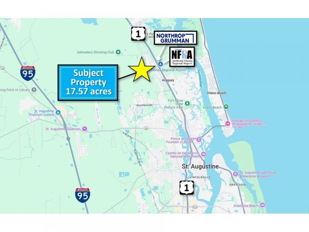 Prime 17+ Acre Industrial Parcel Located Just West Of Us-1 In The Fast Growing North St. Augustine Area. This Expansive Property Offers Unmatched Potential For Development,Strategically Positioned Near The St. Augustine Regional Airport And Northrop Grumman Aeronautic Systems. With Convenient Access To Major Transportation Routes Such As Us 1 And I-95 Its A Location Within A Rapidly Growing Economic Hub. This Site Is Ideal For Manufacturing,Warehousing,Or Logistics,This Parcel Provides An Unparalleled Opportunity To Capitalize On The Arearsquo;s Growth. Some Civil Engineering Work Has Already Been Done At This Property And Is Available For A Review. Seller Will Provide A $300,000 Credit At Closing Towards The Road Extension And Utilities. Donrsquo;t Miss Your Chance To Secure A Premier Industrial Development Site In The Heart Of North St. Augustine.