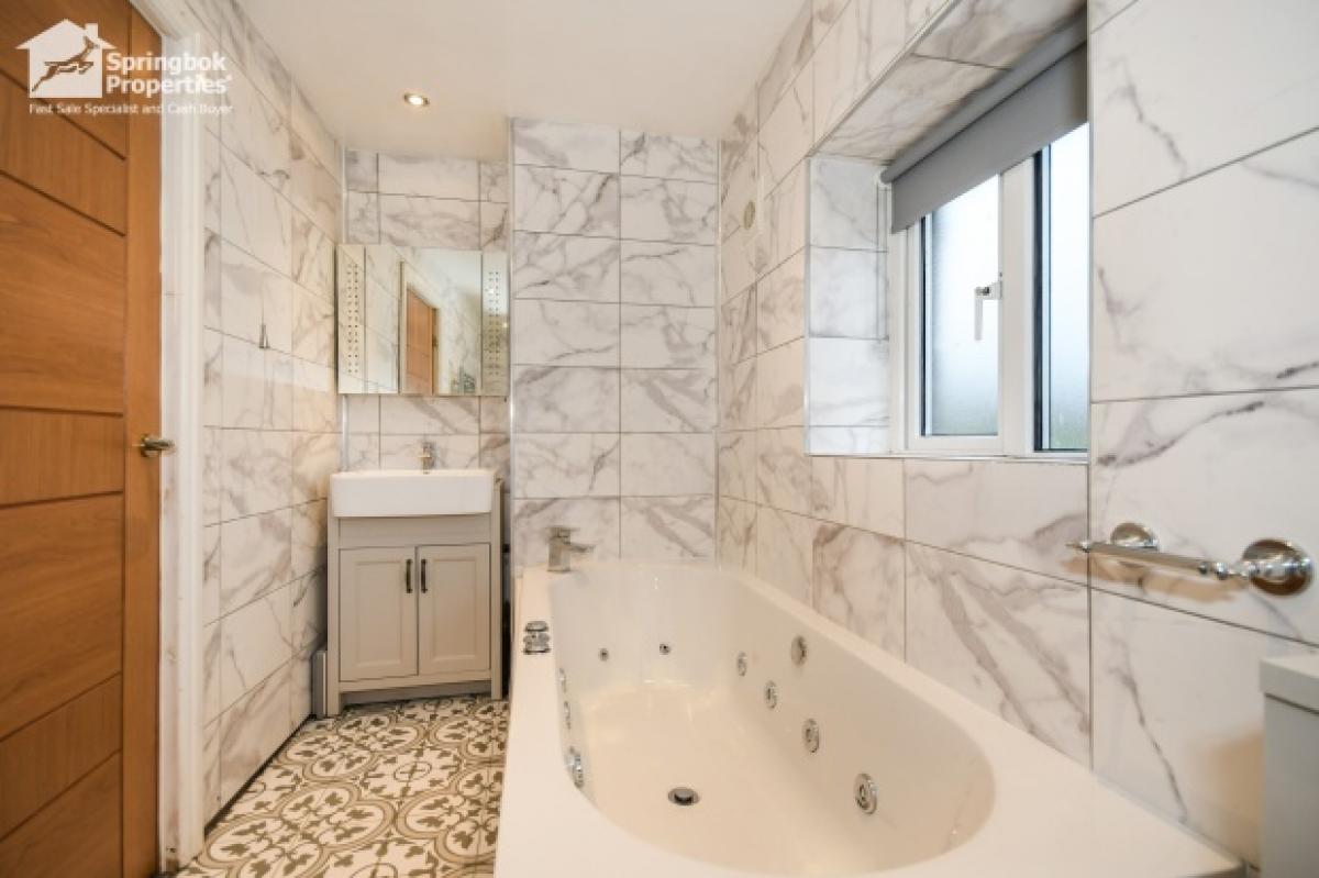 Upstairs, three generously sized bedrooms provide restful retreats. The main bedroom enjoys garden views and wall-to-wall bespoke wardrobes, while bedrooms two and three offer flexibility for growing families or home office setups. A luxury family bathroom showcases both a rainfall shower and a jet spa bath with high-end finishes including decorative flooring and marble-effect tiles.