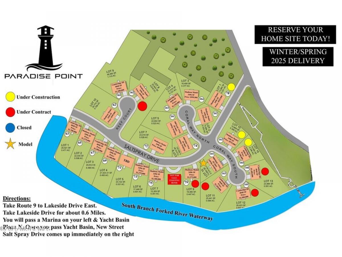 Welcome to Paradise Point! This Brand-New Waterfront Community of 24 Homes is located in the heart of Forked River, NJ by a local/reputable Builder. FINISHED NEW CONSTRUCTION!!!! This Cul-de-sac Lot (0.31 Acres) features the Madison A Model which includes 4 Beds, 2.5 Baths, 2 Car Garage, Walkup Finished Attic is 558sf Additional Living Space, Open Floorplan layout, Engineered Flooring on 1st Flr/2nd Flr Hallway, Custom trim/paint throughout, Large Family Room w/Gas Fireplace. Kitchen boasts Center Island, Quartz tops, Tile backsplash, amp; SS Appliances. Huge Owner#039;s Suite w/2 Walk-in Closets, Exterior Covered Balcony amp; attached Full bath w/Dual Sink Vanities amp; Shower Stall. Located less than 10 mins from GS Pkwy, close to Shopping, Beaches and just 1 block to a marina! ***GPS Address: 423 Wildwood Rd, Forked River which will lead you directly to the project. Route 9 South to Lakeside Drive East to Wildwood Rd (Wildwood Rd at some point will change to Saltspray Drive) ~Or~ Route 9 North to Parkers Point Blvd to right on Saltspray Drive***