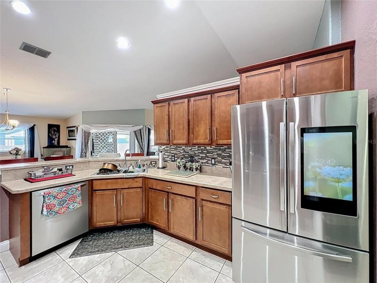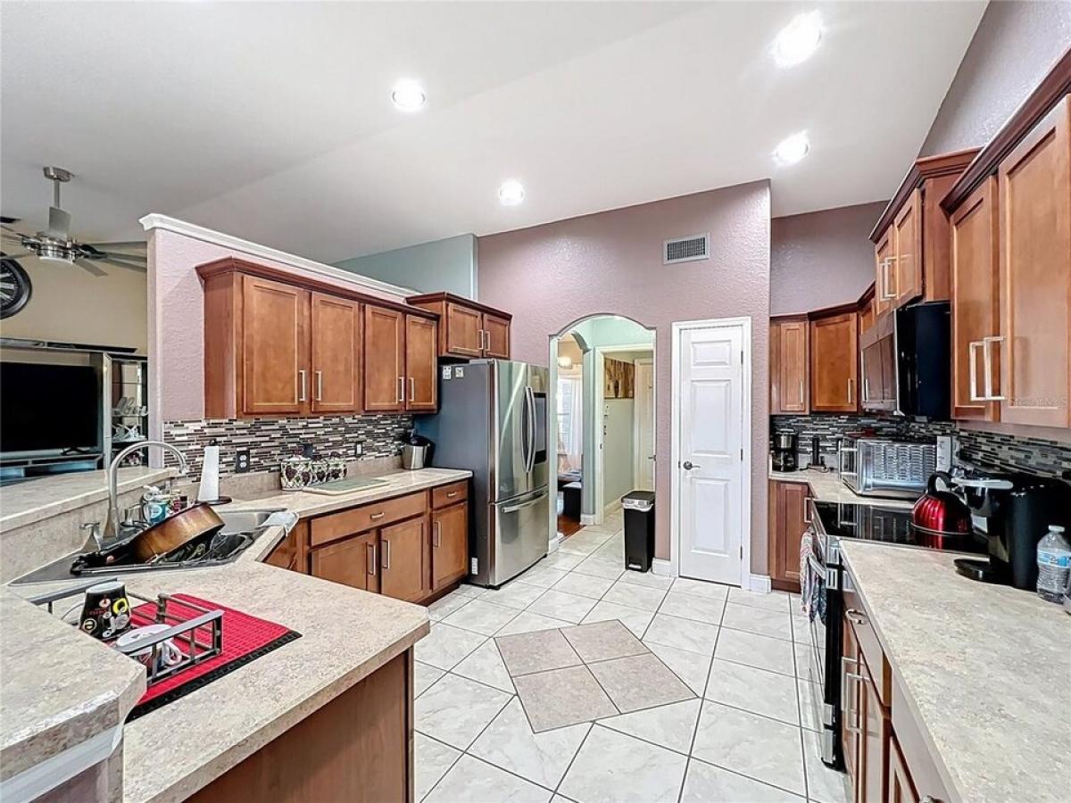 One or more photo(s) has been virtually staged. This beautiful 3-bedroom, 2-bathroom home with a 2-car garage and backyard pool is located on a desirable corner lot in the Bentley Oaks Subdivision. From the moment you pull in to your big circular driveway you#039;ll notice the open covered porches great for morning coffees or relaxing. The home features many upgrades and a spacious layout. Inside, enjoy a welcoming living room with tile floors and vaulted ceilings. The split floor plan includes a luxurious primary suite with trey ceilings, his and her walk-in closets, and an en-suite bathroom with a garden tub, dual sinks, a upgraded walk-in tile shower equipped with a rain showerhead. The kitchen boasts stainless steel appliances, including a smart refrigerator, a tiled backsplash, and plenty of storage as well as a cozy breakfast nook. On the other side of the home, two spacious bedrooms create privacy and comfort, with a guest bathroom conveniently located between them. The 2 car garage has enough room not just for your car but also for your tool or storage needs as well as a door providing access to the backyard. Outside you#039;ll have more than enough space to entertain all your guest either by the big caged in pool perfect for the summer day heat or in the enclosed patio on the other side of the home and allow your animals to roam freely in your vinyl-fenced in yard. This home also has a newer roof replaced in (2022), and ac unit in (oct 2023) which will give you peace of mind. Don#039;t miss out on this Auburndale gem which is only 2 minutes away from the charming and growing downtown Auburndale, close to the only cable water park in polk county, centrally located to schools, shopping centers, and more.