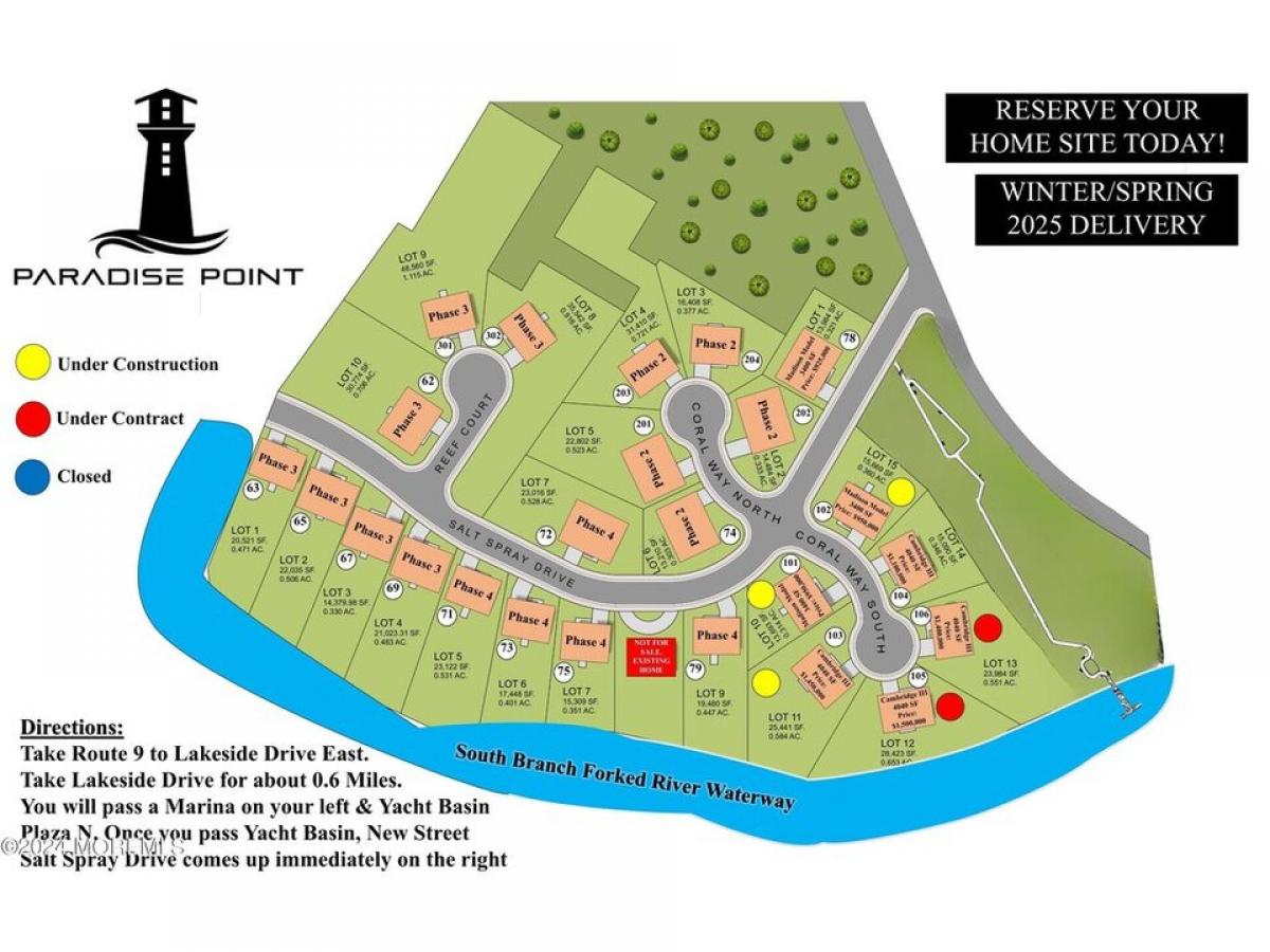 Welcome to Paradise Point! This Brand-New Waterfront Community of 24 Homes is located in the heart of Forked River, NJ being built by a local/reputable Builder. Early 2025 Completion! This Riverfront Cul-de-sac Lot (0.551 Acres) features the Cambridge 3 Model which includes a Dock for your boat, 5 Beds, 4 Full Baths, 2 Car Garage, Walkup Finished Attic (558sf Additional Living Space), Open Floorplan layout, Engineered Flooring on 1st Floor/2nd Floor Hallway, Custom trim/paint throughout, Large Family Room w/Gas Fireplace. Kitchen boasts Center Island, Quartz tops, Tile backsplash, GE Profile Series Appliances including Wall Oven, Cooktop and Vented Hood. Owner#039;s Suite features HUGE Walk-in Closet, Exterior Balcony amp; attached Full bath w/Dual Sink Vanities, Shower Stall, amp; Tub. Located less than 10 mins from GS Pkwy, close to Shopping, Beaches and just 1 block to a marina! ***GPS Address: 423 Wildwood Rd, Forked River which will lead you directly to the project. Route 9 South to Lakeside Drive East to Wildwood Rd (Wildwood Rd at some point will change to Saltspray Drive ~Or~ Route 9 North to Parkers Point Blvd to right on Saltspray Drive***