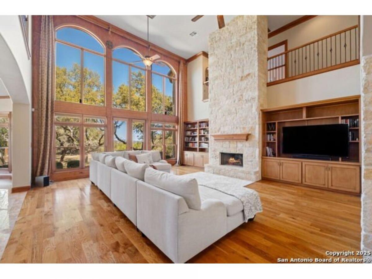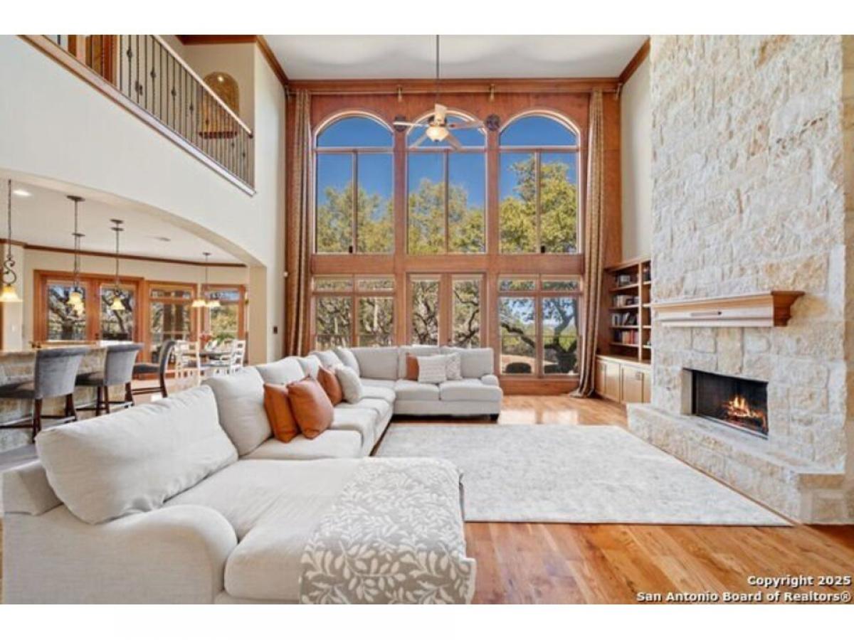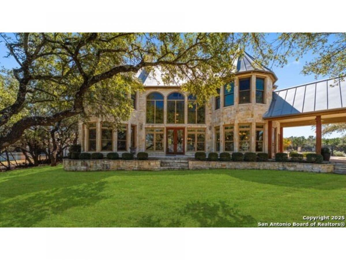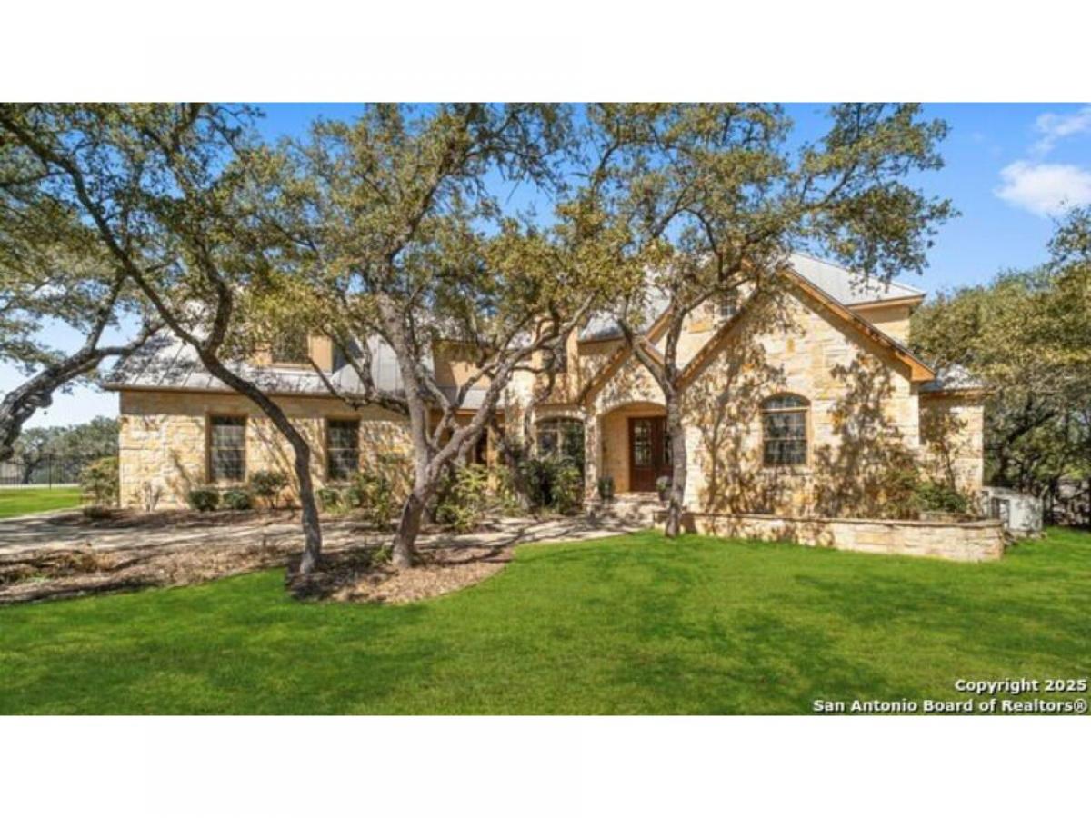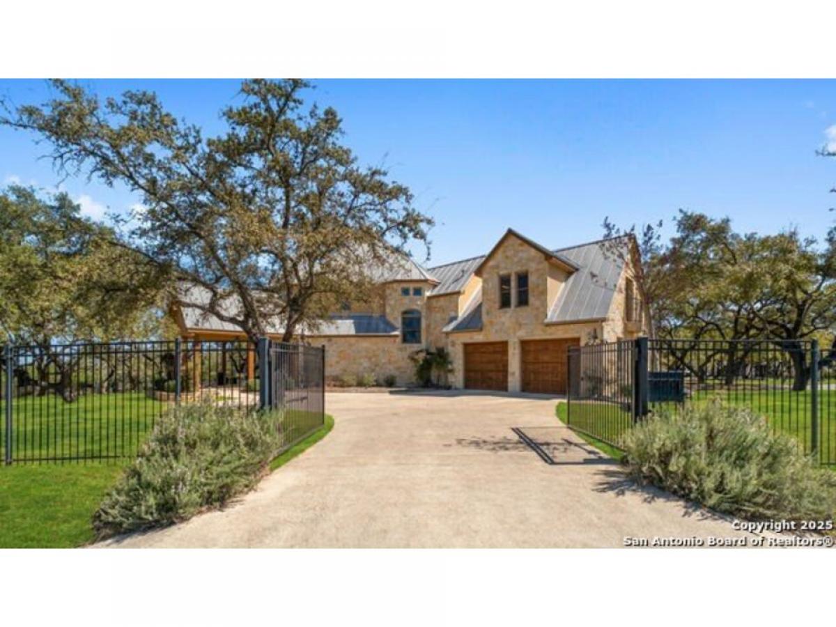 Experience the serenity and luxury of this exceptional 4-bedroom, 4.5-bathroom home in the highly desirable River Crossing subdivision. Spanning 4,907 sq ft, this beautiful residence is designed to offer both comfort and elegance, with soaring ceilings, expansive windows, and stunning stone accents, both inside and out. A grand double-door entry opens to the spacious interior, featuring beautiful wood flooring in the living room and a stunning ceiling-high wood-burning fireplace, creating a warm and inviting ambiance with an open-concept floor plan. The primary suite is conveniently located downstairs, offering a spa-like ensuite with double vanities, a large soaking tub, a separate walk-in shower, and dual walk-in closets. Upstairs, you#039;ll find three spacious bedrooms, two of which showcase tall, beautifully accented wood ceilings and a flex room perfect for a game room, media room, or home office. The wet bar area is also located on the second floor offering additional convenience. The chef#039;s kitchen is a culinary dream, complete with gas cooking, a large island, custom cabinetry, and plenty of counter space for meal prep. Two eating areas provide ample space for dining and entertaining. Step outside to the covered patio or front porch overlooking the one-acre fenced lot with mature trees and gated access, providing privacy and security. Additional features include a separate utility room, hidden storage under the staircase, and an attached two-car garage. Located in the sought-after Smithson Valley High School district, this home is a true Hill Country gem, offering a perfect blend of peaceful living and luxurious amenities.