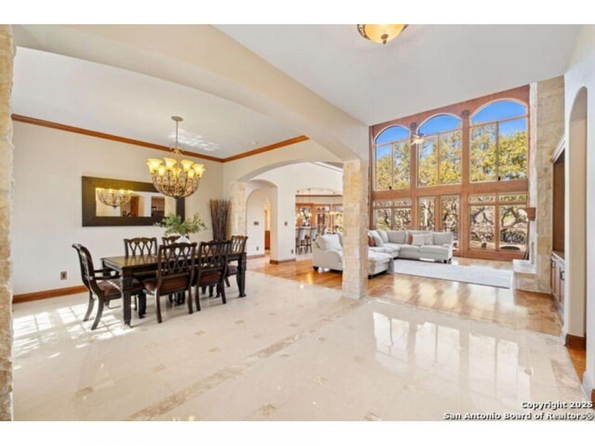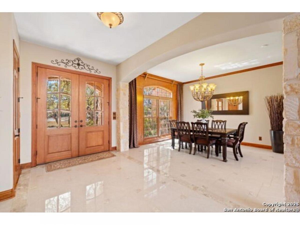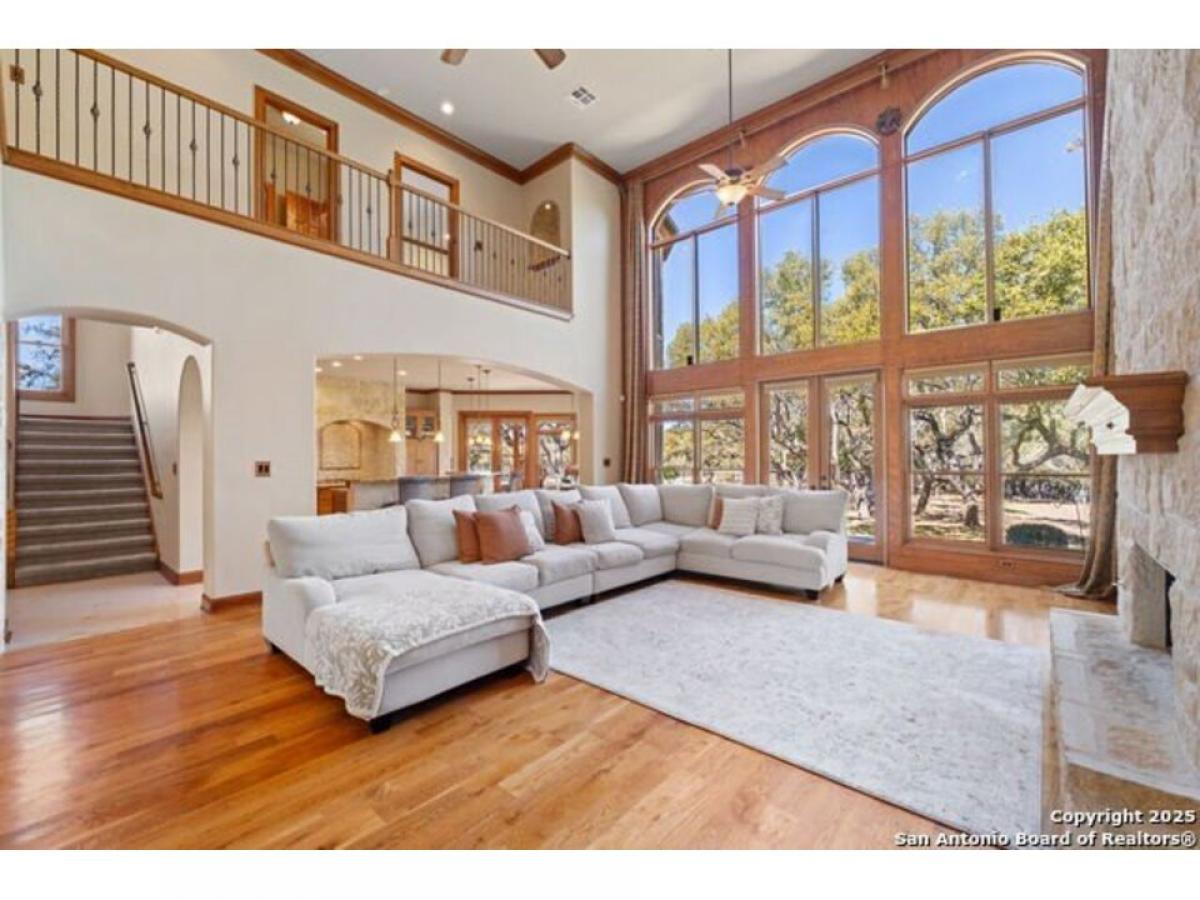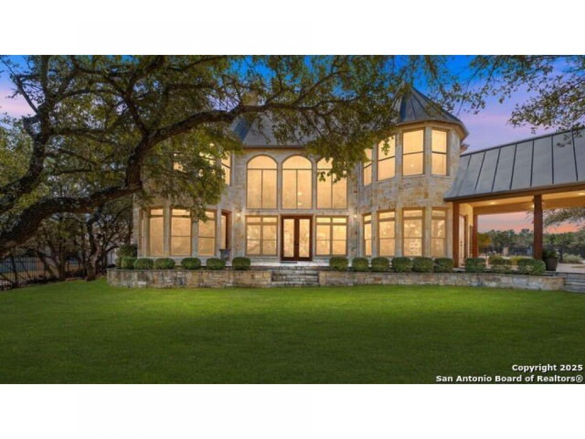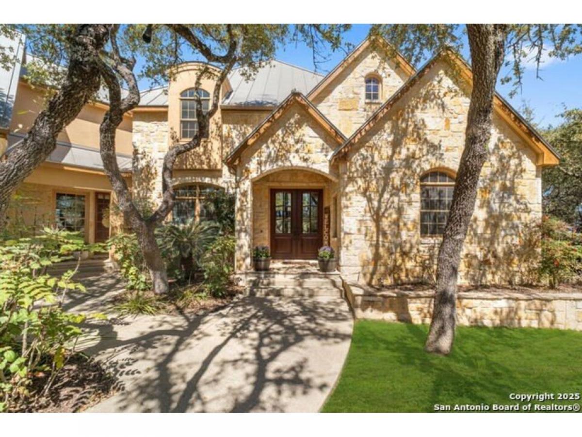 Experience the serenity and luxury of this exceptional 4-bedroom, 4.5-bathroom home in the highly desirable River Crossing subdivision. Spanning 4,907 sq ft, this beautiful residence is designed to offer both comfort and elegance, with soaring ceilings, expansive windows, and stunning stone accents, both inside and out. A grand double-door entry opens to the spacious interior, featuring beautiful wood flooring in the living room and a stunning ceiling-high wood-burning fireplace, creating a warm and inviting ambiance with an open-concept floor plan. The primary suite is conveniently located downstairs, offering a spa-like ensuite with double vanities, a large soaking tub, a separate walk-in shower, and dual walk-in closets. Upstairs, you#039;ll find three spacious bedrooms, two of which showcase tall, beautifully accented wood ceilings and a flex room perfect for a game room, media room, or home office. The wet bar area is also located on the second floor offering additional convenience. The chef#039;s kitchen is a culinary dream, complete with gas cooking, a large island, custom cabinetry, and plenty of counter space for meal prep. Two eating areas provide ample space for dining and entertaining. Step outside to the covered patio or front porch overlooking the one-acre fenced lot with mature trees and gated access, providing privacy and security. Additional features include a separate utility room, hidden storage under the staircase, and an attached two-car garage. Located in the sought-after Smithson Valley High School district, this home is a true Hill Country gem, offering a perfect blend of peaceful living and luxurious amenities.