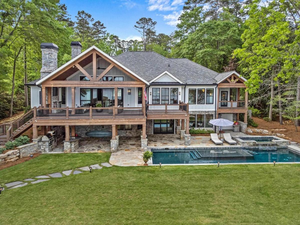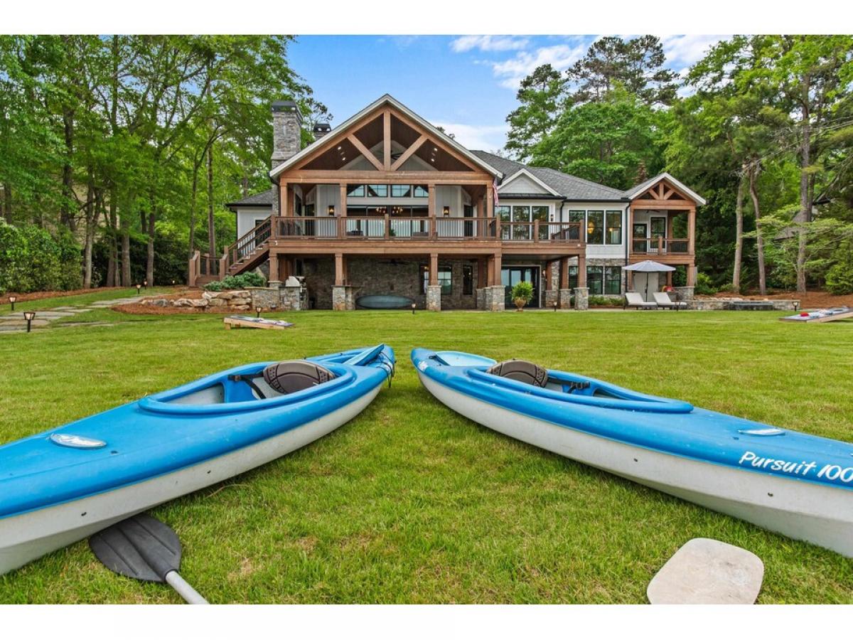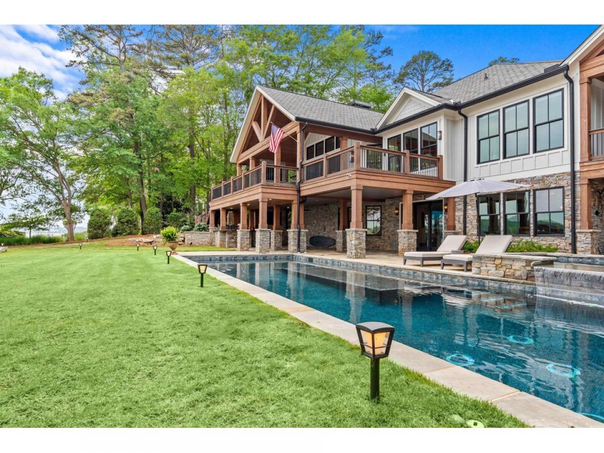 "NEW" COMPLETELY REMODELLED AND RENOVATED LUXURY LAKE HOME WITH PANORAMIC VIEWS in Reynolds Lake Oconee. Situated on a rare sprawling, flat lakeside property, this 9,000 sq ft home offers breathtaking spectacular views of the lake, sunset and golf course vistas, setting the stage for an unparalleled lifestyle. This expansive home has been meticulously gutted and renovated, effectively transforming it into a brand-new residence. The open floor plan greets you with stunning lake views, a grand great room,large porch with fireplace and seamless transitions to the dining area and a state-of-the-art Chef’s kitchen. This brand new kitchen is equipped with top-tier appliances and countertops, custom cabinetry, making it a perfect blend of functionality and style. Built with the entertainer in mind, the home features a striking designer glass wine cellar that enhances the sophisticated ambiance of the living space. The main level boasts a vast master suite complete with a fireplace, sitting area, and awe-inspiring lake views. The opulent master bath is akin to a private spa, adorned with chic designer touches, a luxurious steam shower, and expansive walk-in closets.This level also houses three elegantly appointed guest suites, a bespoke custom office space, and a functional laundry room equipped with a dog shower and custom lockers. Rich, wide-plank hardwood floors throughout lead you to the lower level, accessible by an elevator. The terrace level unfolds into a vast entertainment hub with a large family and game room, a second indoor full kitchen,and a second dining area convenient to the large outdoor kitchen. This level is enriched with another spacious bedroom suite and bath, powder room, a bunk room, a gym, and a flexible bonus room and second laundry room. There is an abundance of storage space for your lake toys. Wired for Smart home technology. Glass doors open to a sprawling outdoor living area, featuring a comprehensive kitchen, a substantial pool with an integrated spa, fire pit, outdoor shower and extensive large landscaped flat backyard that merge seamlessly with the lakefront. Enjoy family barbecues, cornhole, volleyball and endless outdoor activities or simply relax by the water's edge before getting on your boat for a sunset cruise. Welcome to your ultimate lakefront paradise in Reynolds Lake Oconee.This estate offers a lifestyle that epitomizes lake luxury, making every day feel like a vacation.Membership is available.
