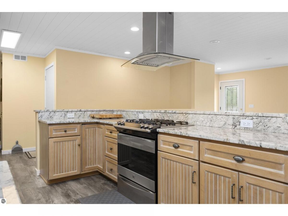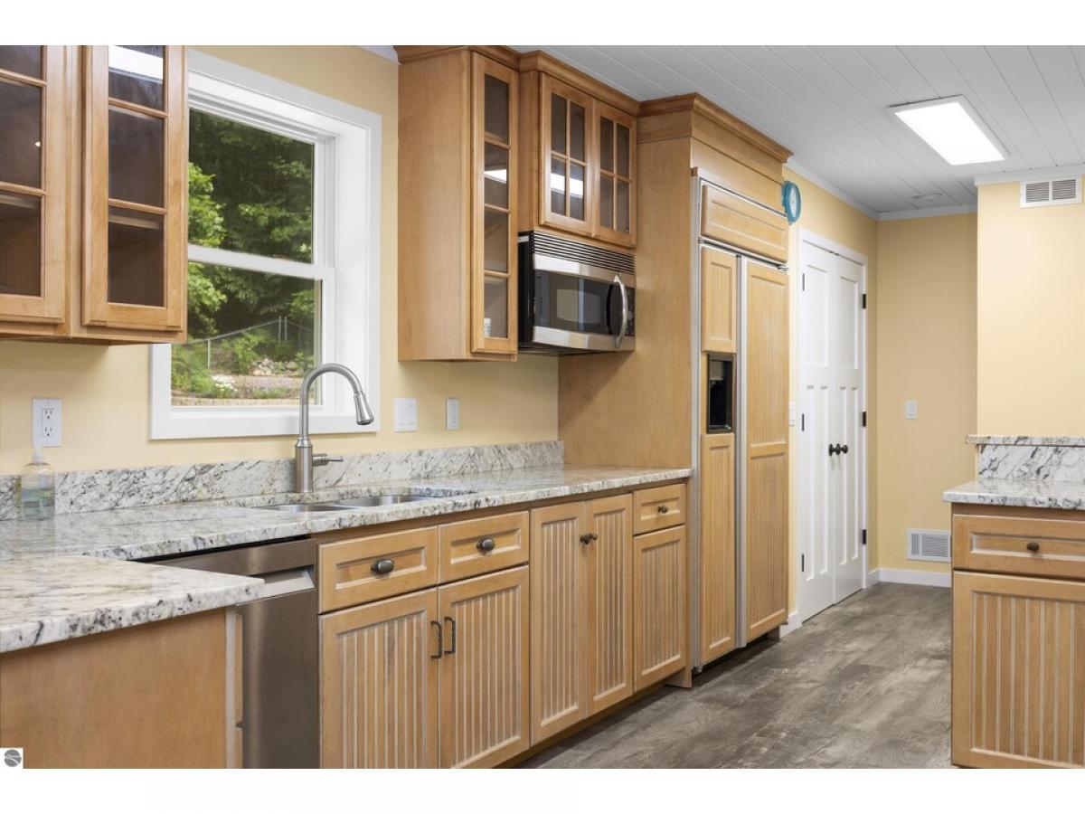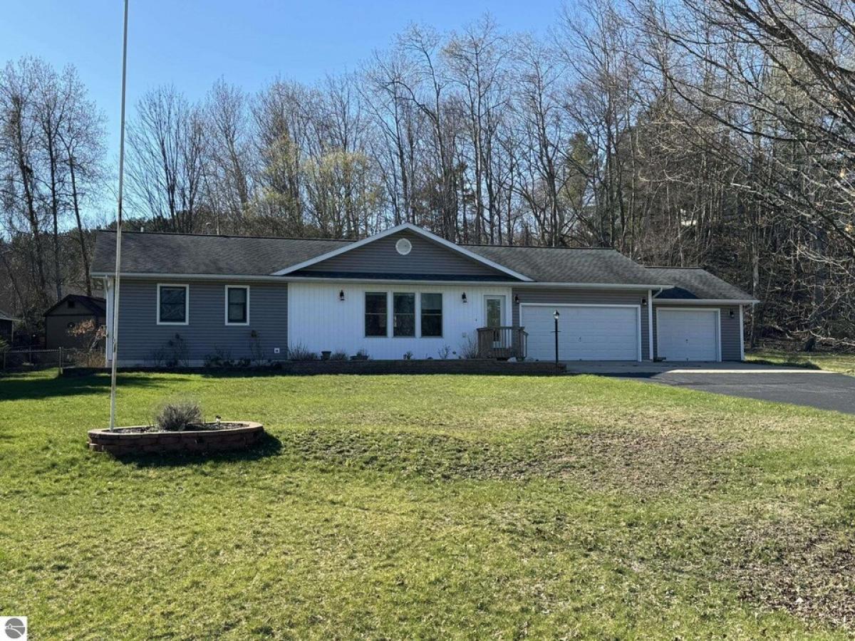 Orchard Hills Living with shared Torch Lake beach front park is offered with this updated 3-bedroom, 2.5-bathroom home. Greeted with the newly updated and remodeled open-concept layout, perfect for both relaxation and entertaining. The spacious kitchen, boasting elegant granite countertops, ample storage with pull-out cabinets and a pantry, complemented by stainless steel appliances including a stove and dishwasher. The kitchen shares the open space with the dining and living room, all adorned with newly remodeled windows, flooring, and doors, creating a great space for gatherings with friends and family. The main floor owner's bedroom, complete with an attached private bathroom featuring a shower. Two additional well-appointed guest bedrooms share a full guest bathroom. Step outside through the sliding glass door off the dining room onto the back deck, where outdoor living awaits. Inside the fenced backyard, you'll find a patio, an outdoor gas fireplace, and a wood-burning fire pit, perfect for cozy evenings under the stars. For those who love the convenience of RVs or extra toys, an additional stone driveway complements the paved driveway and heated, drywalled attached garage. The second garage offers drive-through access to the backyard, making maneuvering a breeze. An storage shed in the backyard for gardening tools. Residents can join the Beach Club for access to a shared beach for a nominal yearly fee. Surrounded by lush greenery near the end of a peaceful cul-de-sac on a paved county-maintained road. Elk Rapids School District. Conveniently located near Torch River, Kewadin and Elk Rapids. Ready for immediate possession, this home presents an opportunity to experience the best of Orchard Hills living.