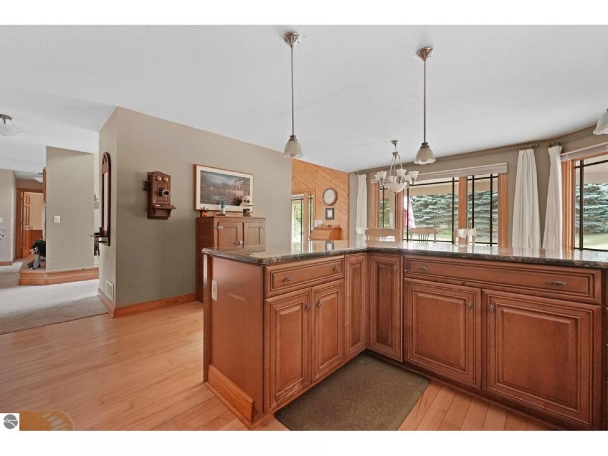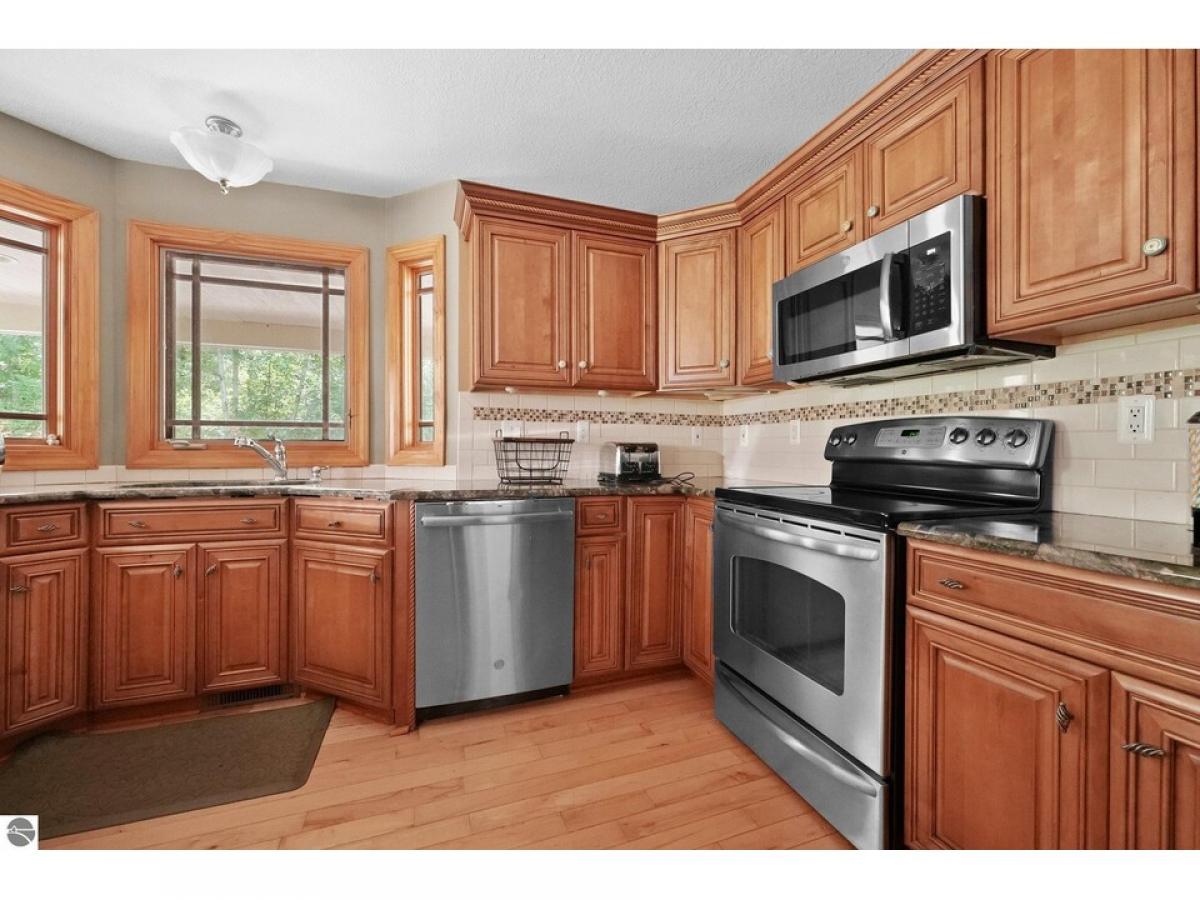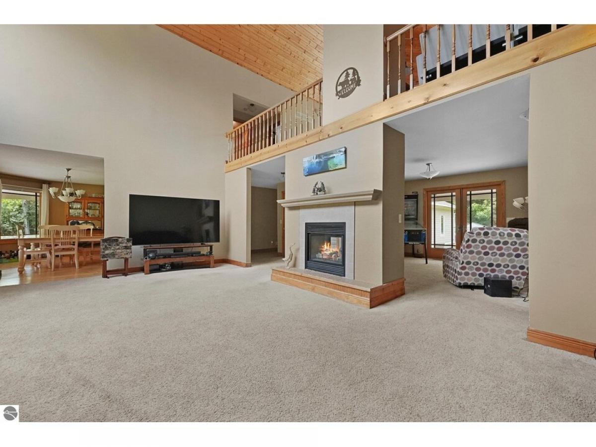 In the quaint little village of Alden sits your new home! This expansive 3 bedroom, 2.5 bath home with over 3,000 square feet of living space is just 3 minutes from downtown, the public beach, and the boat launch to Torch Lake. Outside you’ll enjoy privacy as the home is surrounded by lush greenery with plenty of lawn space on the 2.27 acre piece of land. The wrap around, covered porch allows you to enjoy the scenery, rain or shine! Open the doors and you’re immediately greeted in the great room where you’ll find a towering loft amidst the cathedral ceilings. Cozy up to the fireplace there or in the adjacent den where you can also enjoy that same fireplace. The kitchen and dining area open to the great room and provide ample space with beautiful cabinetry, stainless steel appliances, and granite countertops. Let’s not forget the walk in, lighted pantry! Also on the main floor is the generously sized primary ensuite with a sunken tub, shower, double vanity, and extra large walk-in closet. Upstairs is a large open loft which serves as a nice flex space perfect for crafting, fitness, working from home or extra sleeping quarters for guests. Upstairs you’ll also find a full bath and two large bedrooms. Upgrades to this home include: new furnace (2024), on-demand tankless water heater (5 years), and sump pump (2024). Don't miss the opportunity to make this exceptional home yours and enjoy the idyllic lifestyle that awaits you in the village of Alden.