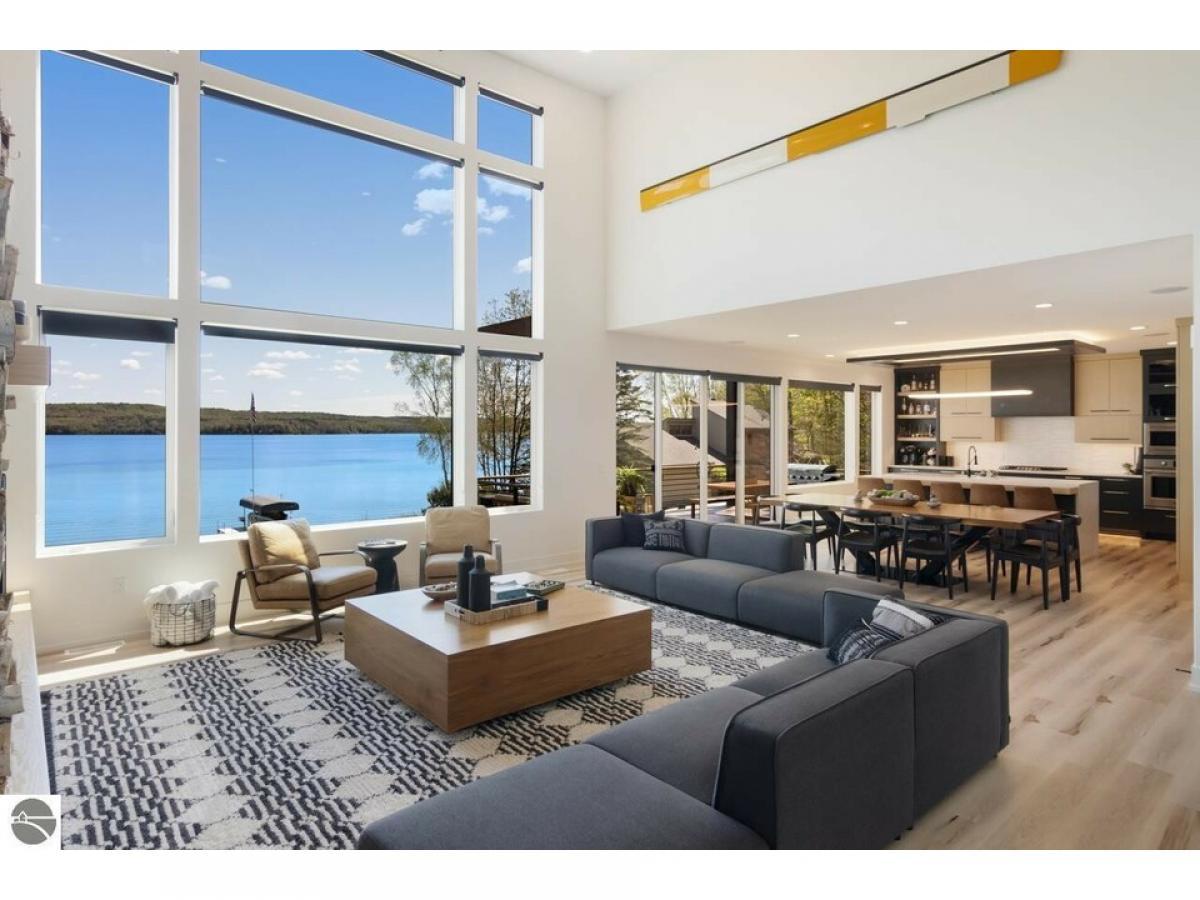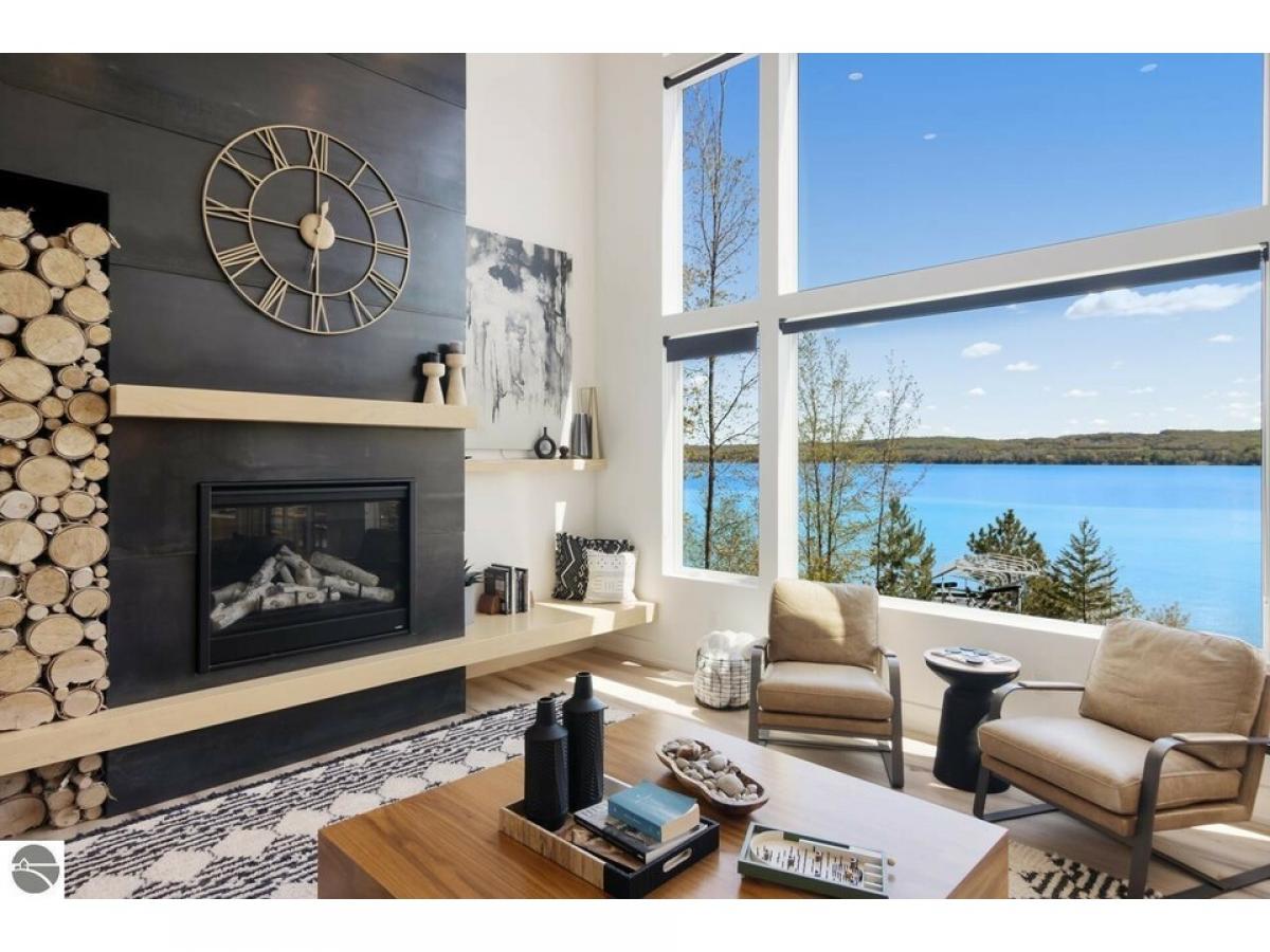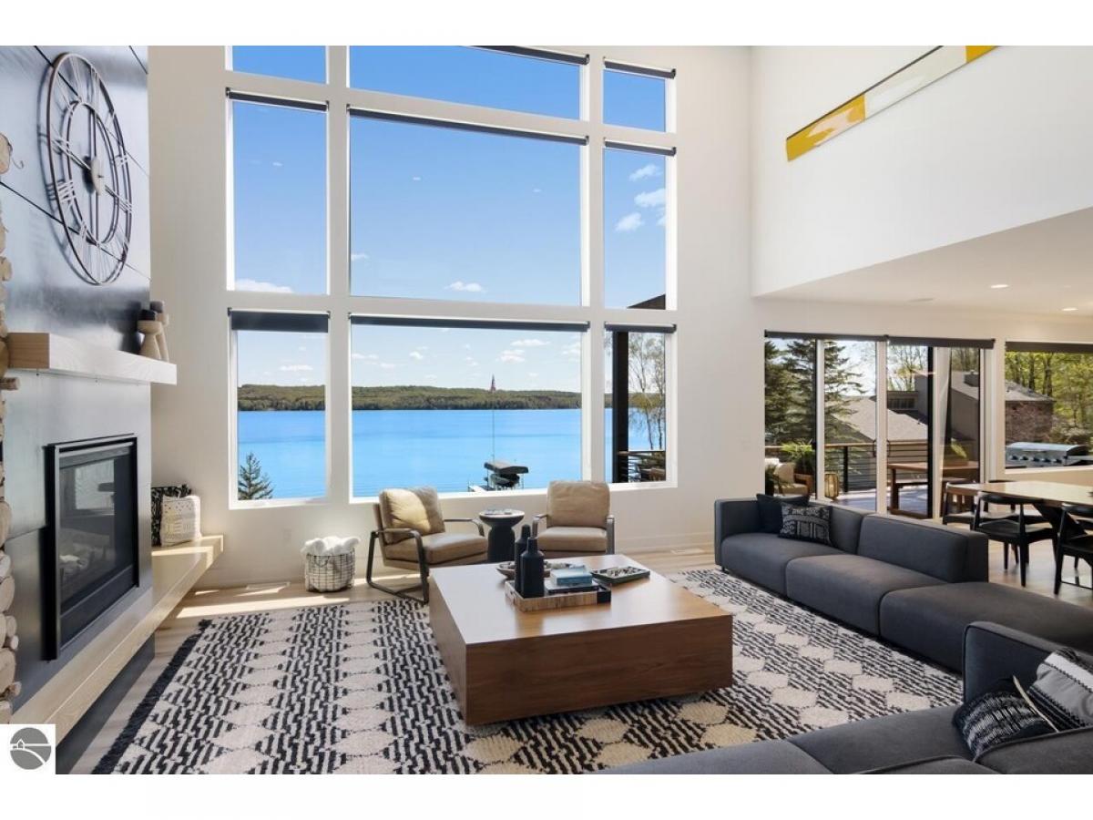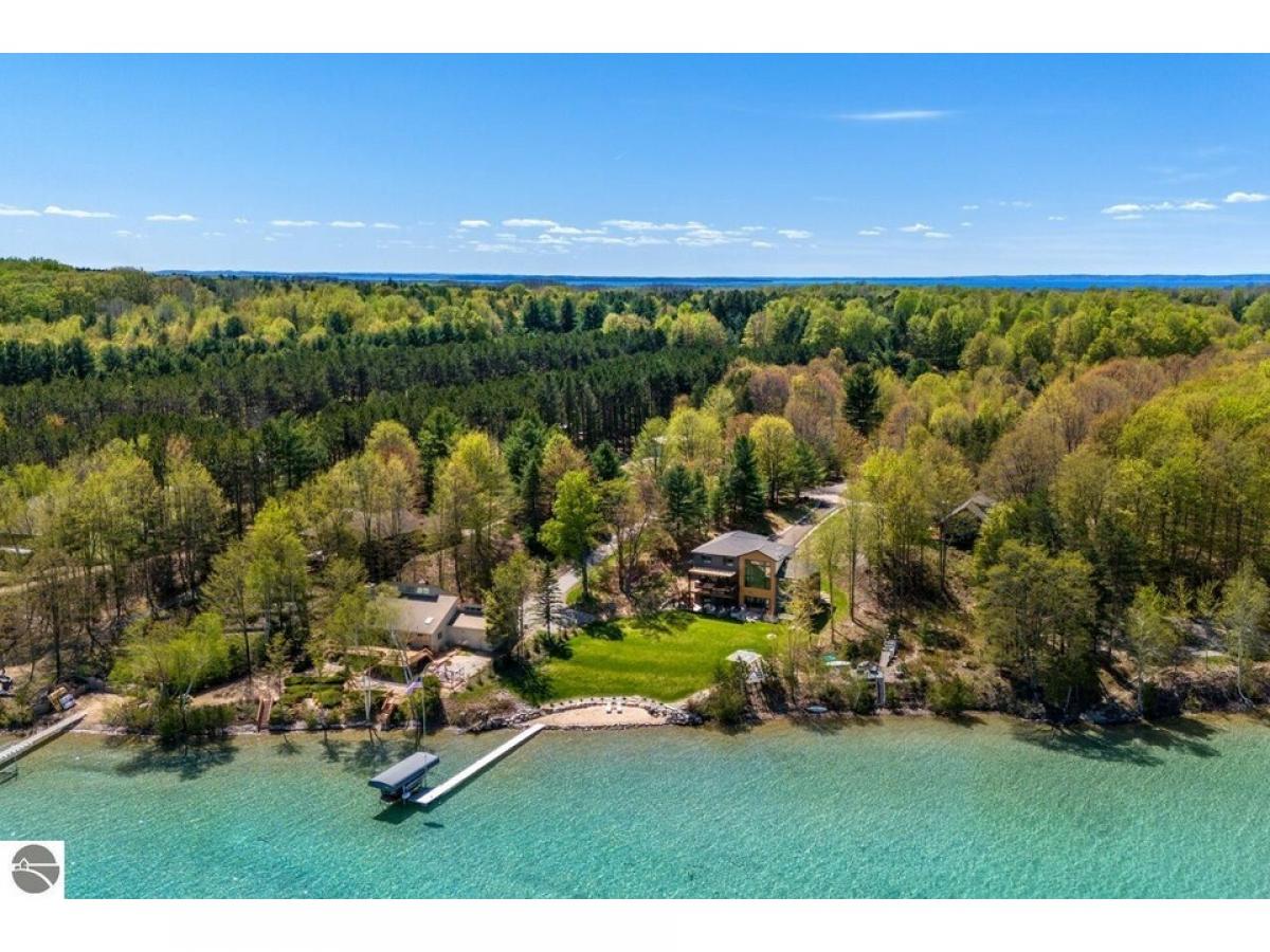 TORCH LAKE AT IT’S FINEST! A luxurious beach house radiating modern sophistication, clean lines and top-of-the-line construction on the shores of Torch Lake. The living room is enhanced by a soaring fireplace, abundant windows for stunning views, vaulted ceiling, custom built ins and unique accents. A chef’s kitchen featuring a waterfall quartz island with bar seating; professional style stainless appliances; tiled backsplash and plenty of cabinetry. Wake up to sunrise views from the impressive and tranquil primary suite with an Alaskan King bed, fireplace, expansive windows, architectural details, luxurious bathroom, and a walk-in closet. As you head upstairs you will discover a large recreation/family room; 3 bedrooms and a full bath. The lower level offers a generous sized second living area with family room; an upscale wet bar complete with liquor dispensers & beverage cooler; a large door wall leads you to the patio and your private waterfront; views of the lake from the 2 bedrooms; a full bath, and a mechanical room. Gracious outdoor entertaining spaces galore with a composite deck with a sunshade and a contemporary railing; a large patio with built in firepit and hot tub; and a generous size yard. Relax in the sun and build sandcastles on your sandy beach area, before heading out for a day of world-class boating on the entire Chain-of-Lakes. There is even a helicopter pad, for your guests to arrive in style. Other notable amenities include 4,100 square feet; main floor office den; destination laundry room; a total of 6 bedrooms, 3 ½ baths; modern lighting throughout; unique architectural design attributes; custom built-ins; air conditioning; professional landscaping; 3-car heated garage. Your Torch Lake waterfront estate setting includes 125’ of premier frontage and a 3.8-acre setting. Let this become your cherished family retreat and a place to welcome family and friends to make cherished memories. Move right into this "Turn Key" opportunity.