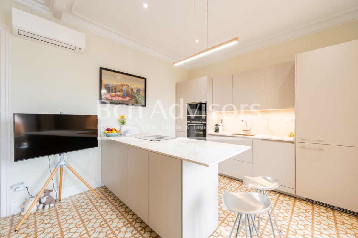 This fantastic flat with lots of natural light is on the sixth and top floor of a regal estate building in an excellent location in the Eixample district, just a few minutes from both Plaza Universitat and Plaza Espanya. The surrounding area offers numerous amenities, neighbourhood shops, shopping centres, bars, restaurants, leisure options and excellent transport links via metro line 1 and buses.This penthouse is extremely quiet, as it overlooks the courtyard, and bright, as it is on the top floor. It has 98 sqm according to the Land Registry and a 1.7 sqm balcony. It was completely refurbished with high-quality finishings, maintaining original features such as restored hydraulic floors, ceilings with mouldings and rosettes, and restored double-glazed windows. In addition, the refurbishment included completely new electrical and plumbing installations.