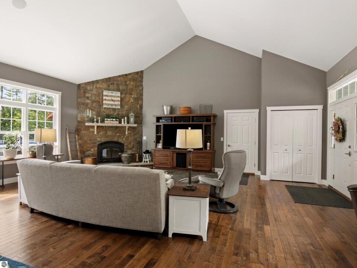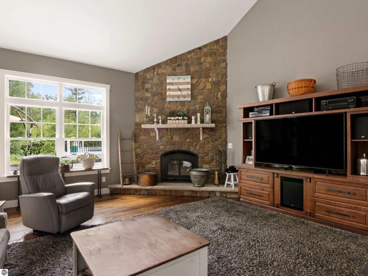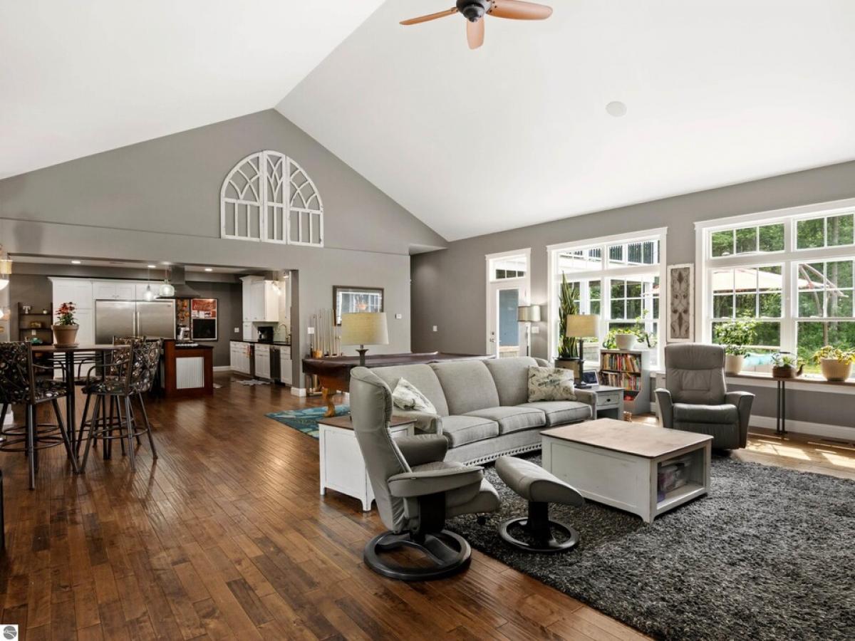 Quality craftsmanship highlight this beautiful home located South of Elk Rapids. Conveniently located between Traverse City and Elk Rapids and just 5 miles from the Flintfields Horse Shows. This 4 bedroom 3 bath house has over 12 acres that is surrounded by State Land with numerous trails, wildlife, and ponds. The backyard allows the ultimate in entertainment including a pool, hot tub, and patio. Need a place to store "toys" or a place to hang out? Gotcha covered. The 40x64 heated pole building has a workshop, full kitchen, 3/4 bath, and office.