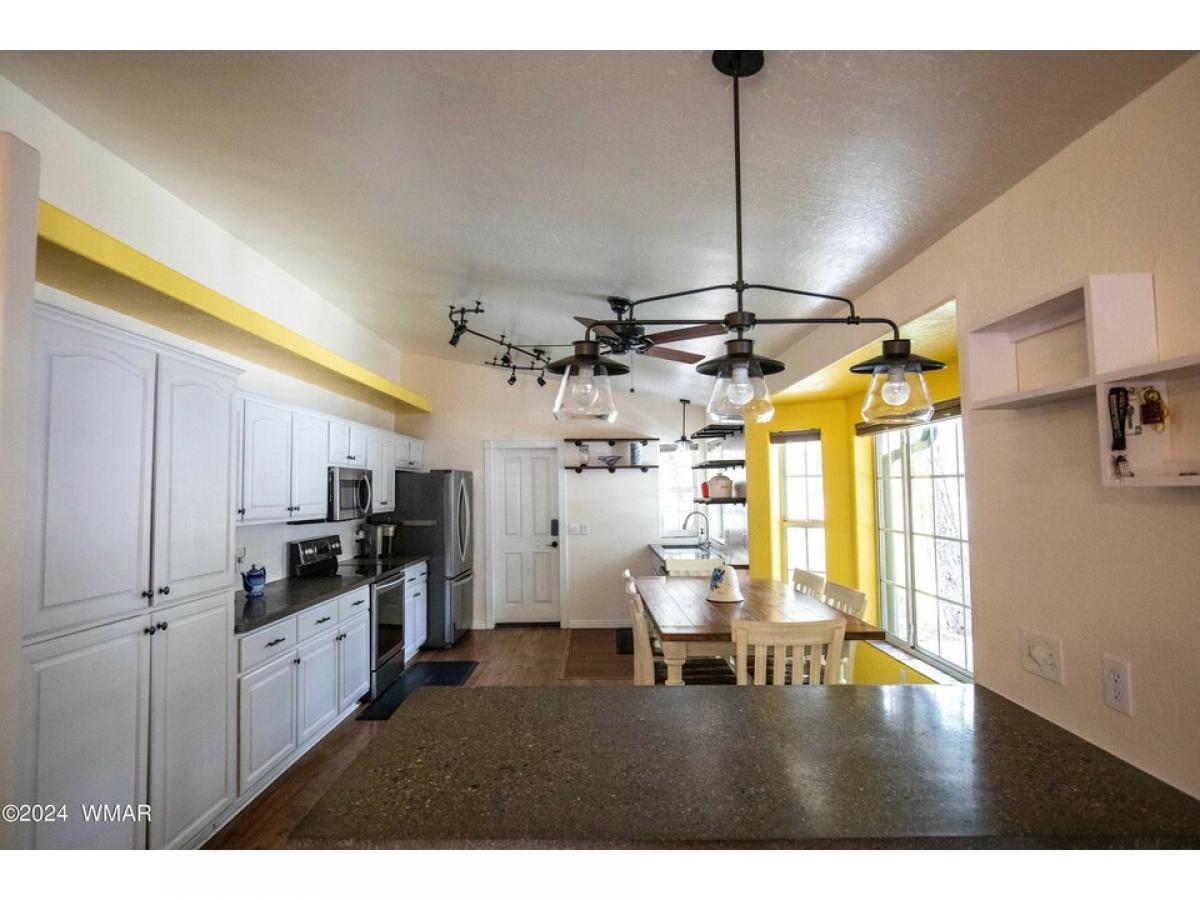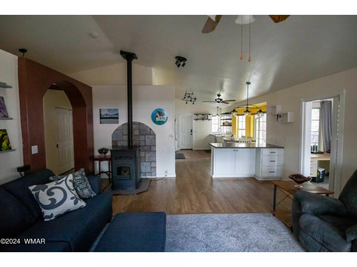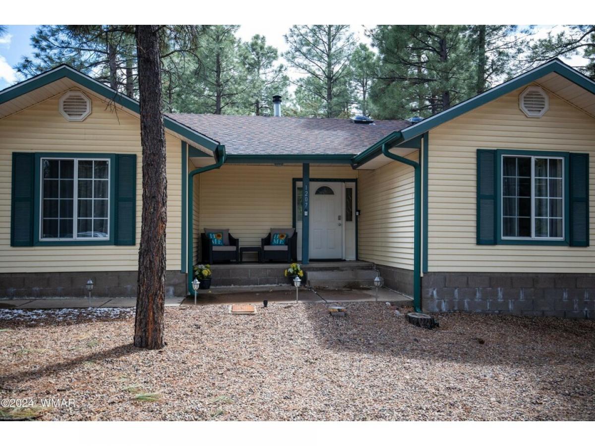 This Charming single-level 1624 sf home is located in Lakeside on a tree-covered .45 acre lot with provision for horses, No HOA or CCR'. A full chain link fenced property with double gates, and a circular driveway, enjoy your front or back covered porch for outdoor enjoyment. New roof in 2023 with transferable warranty. The home offers a split floor plan with an open kitchen, dining, and living room, leading to a delightful AZ room that could have heat added and be a 3rd bedroom. Storage galore is offered with the 2-car attached garage. 2 storage sheds/workshop, and a covered RV pad. RV hookups, garden, room to bring all of your toys. This home comes with a one year home warranty. MOTIVATED SELLER! BRING OFFERS..