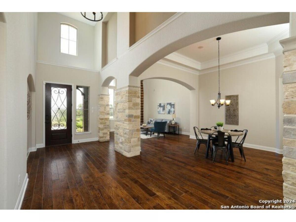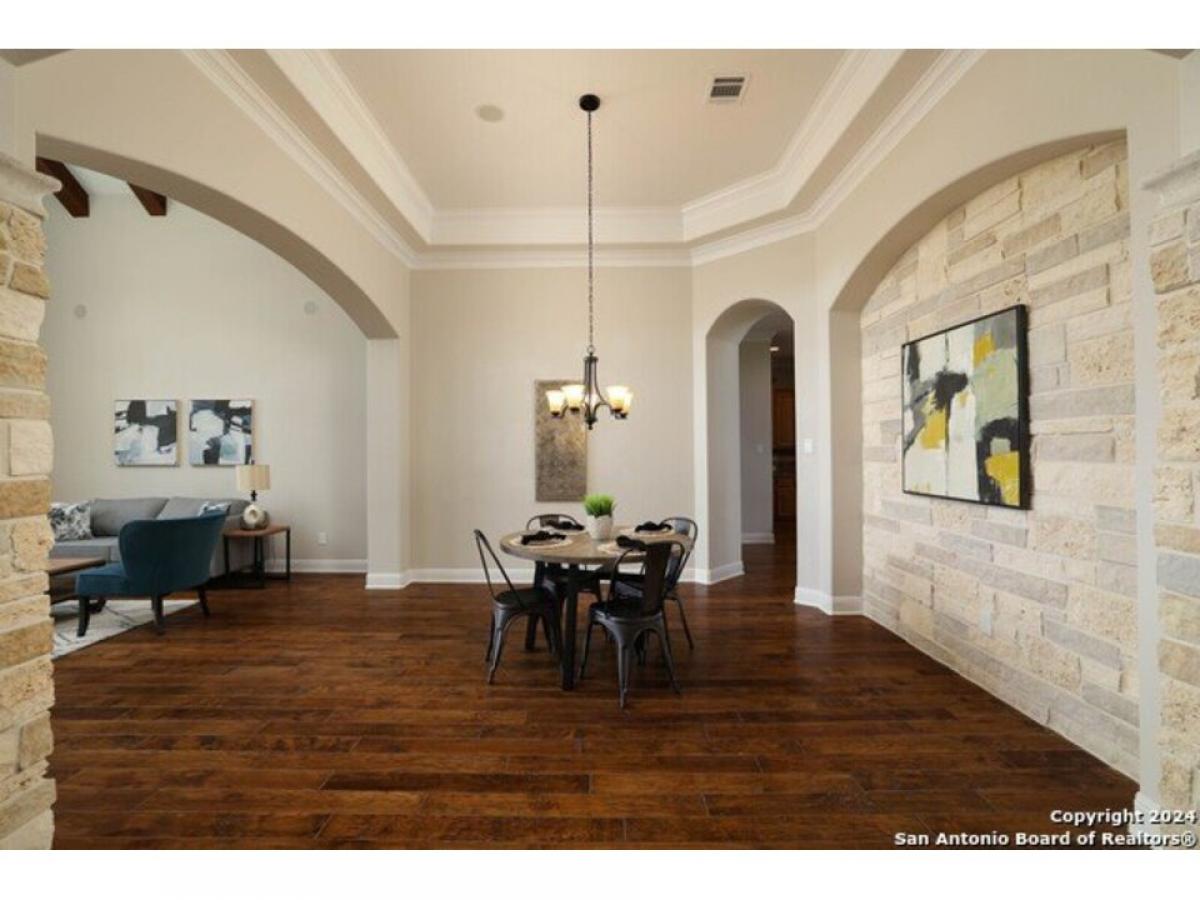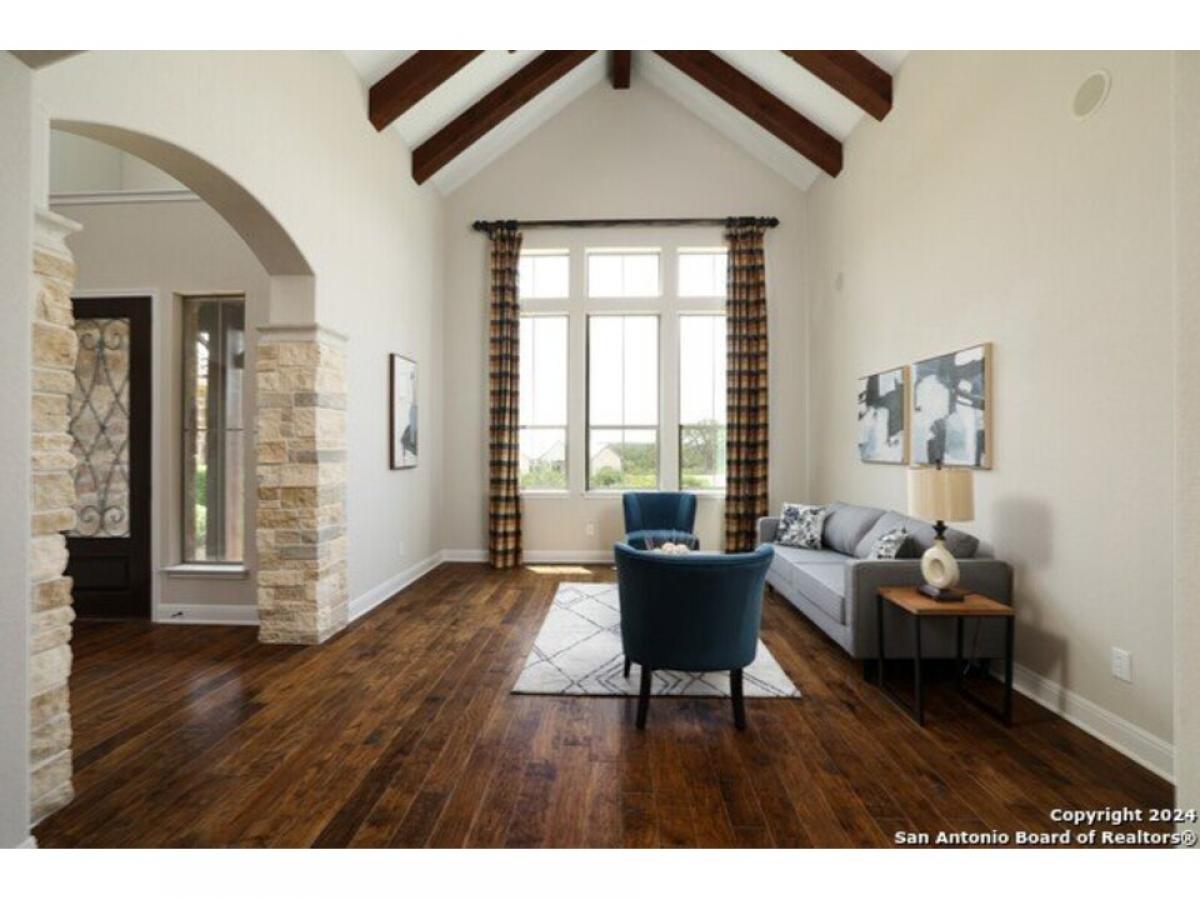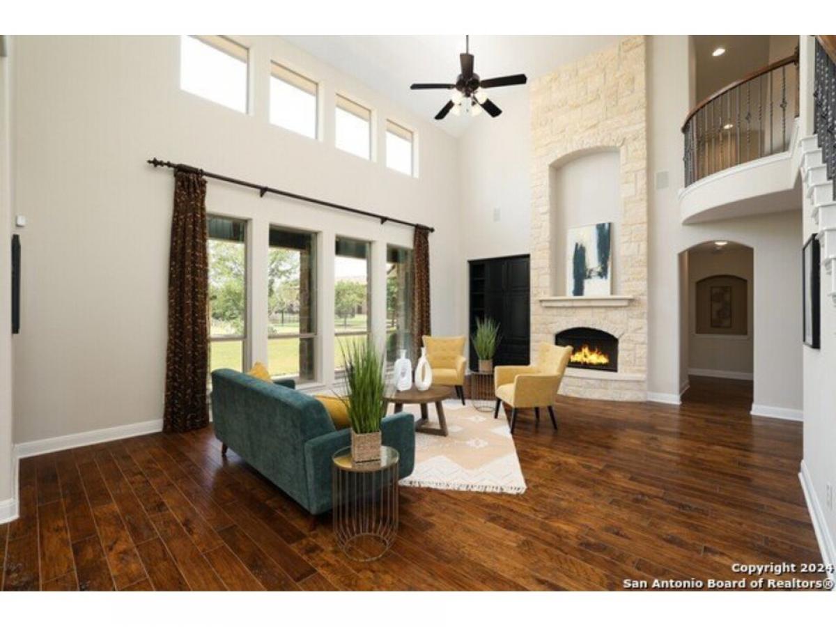 Welcome to your dream home! Never been lived in! This former CUSTOM Coventry model home is the perfect blend of luxury, comfort, and style! With meticulous attention to detail and high-end finishes throughout, this property is a true FIND! Soaring ceilings with rich wood beams create an open and airy ambiance, while the beautiful hardwood floors add warmth and elegance! The family room has a DRAMATIC stone fireplace and a wall of windows for TONS of natural light! The heart of the home is undoubtedly the gourmet kitchen! The massive island serves as the perfect hub for cooking and entertaining! It features custom cabinetry with under cabinet lighting and KitchenAid appliances, including an INDUCTION cooktop, a built-in oven and microwave, stainless steel dishwasher and the refrigerator STAYS! There is even a built-in office alcove with TWO work stations perfect for working remotely or a homework station! Step outside to the covered patio that boasts a cozy outdoor fireplace and a pavilion overlooking a ONE ACRE private corner lot! There is an elegant formal dining with an architectural stone accent wall for those holiday feasts! Retreat to the luxurious primary bedroom (downstairs) where you will find dual/separate vanities, a garden soaking tub, an XL walk-in shower with a bench and a walk-in closet you won#039;t believe! TWO secondary bedrooms are also downstairs and share a Jack and Jill bath. Ascend the iron railed staircase where you will find a large game room, one more bedroom and a full bath! Tired of those tiny utility rooms? Not here! You will find a HUGE utility room with PLENTY of cabinets, a utility sink amp; lot of hanging space! There is a three car side entry garage with a turn around space AND a circular drive in front! Vintage Oaks has some of the best amenities in the Hill Country! You will find miles of trails, neighborhood pools including a lazy river, tennis amp; sports courts, a GYM, a clubhouse, even a WINE ROOM! Exemplary Comal ISD schools! This one is move in ready and a MUST SEE!!