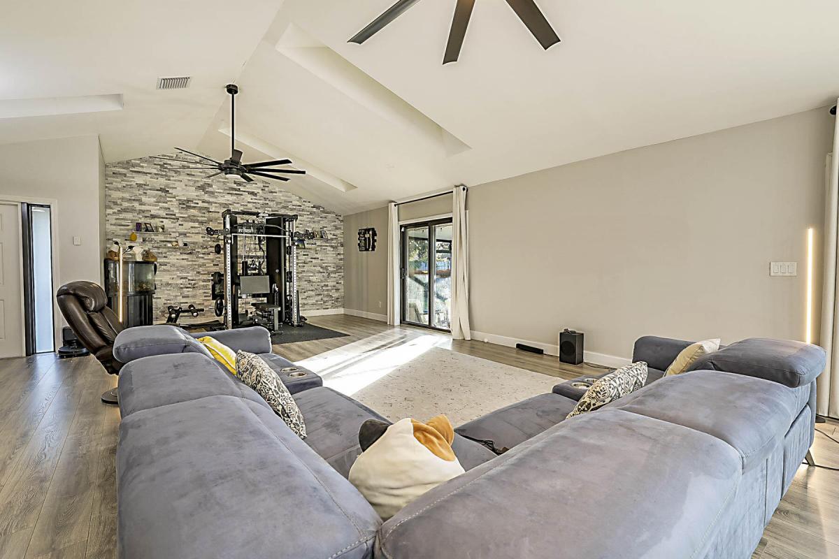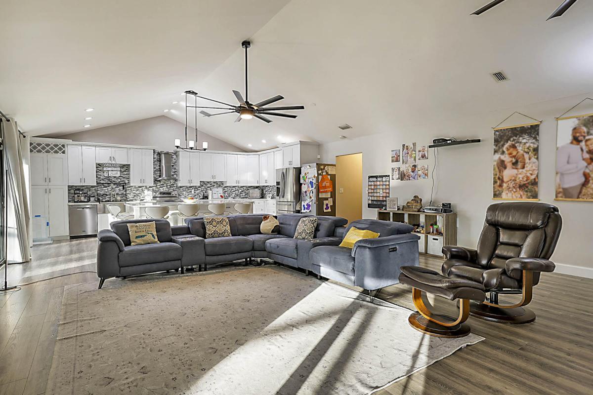 Absolutely stunning open concept floor plan featuring a dream kitchen offering plenty of storage, stainless steel appliances and a huge island, fully remodeled bathrooms, vaulted ceilings, in-ground pool, screen enclosure and aluminum pan roof installed in 2023, roof replaced in 2022, all new impact glass 2024, newer A/C and hot water heater, side entry garage and a fenced-in yard. This is a truly special home and not to be missed!
