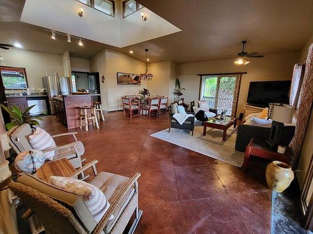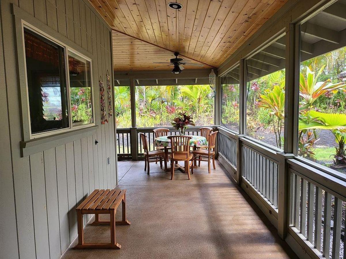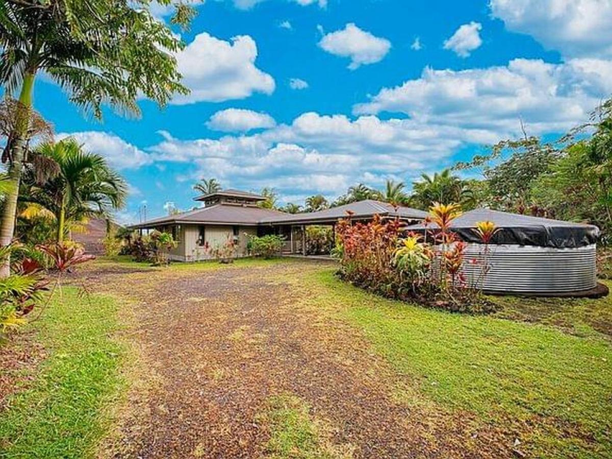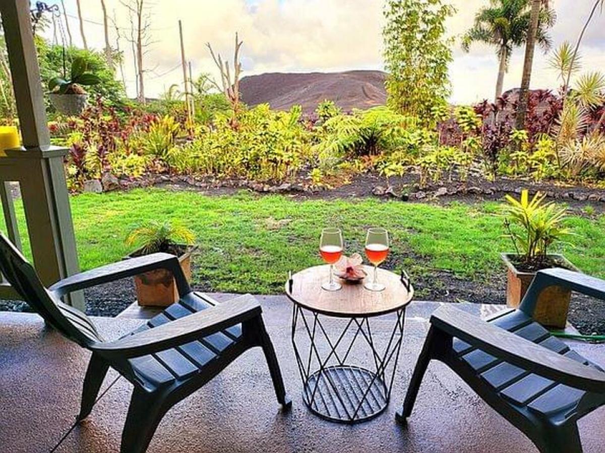 Welcome to this charming 2-bedroom, 2-bathroom home in Leilani Estates, located just a stone's throw from the famed Fissure 8, on two private acres. This home offers a unique blend of modern comfort and natural beauty, with exceptional features and lush surroundings. Upon entering, you'll see stained concrete floors, and a unique ceiling with cupola that creates a spacious, open atmosphere in the main living area. The well-designed home has an abundance of windows that bring the outside in, offering picturesque views of the serene tropical landscape and the vibrant natural beauty that Leilani Estates is known for. The home is currently being used as a hosted vacation rental known as the Lava House, showcasing its appeal to travelers seeking an authentic Hawaiian experience. The fully equipped kitchen is perfect for preparing meals with ease and seamlessly flows into the open dining and living areas, ensuring everyone stays connected while enjoying meals or unwinding after a day of exploration. The primary bedroom offers a tranquil escape with its ensuite bathroom featuring modern fixtures. The second bedroom is equally spacious, with easy access to the second full bathroom, both designed with comfort and convenience in mind. Access to the property is via a long winding driveway. The property boasts lush landscaping, a true Hawaiian paradise that offers plenty of outdoor space for enjoying the island's beauty. The garden has been lovingly cultivated with local plants, making it both serene and sustainable. The lava eruption of 2018 left behind a spectacular landscape of some of the world's newest Earth. This home survived despite being only 100 feet from Fissure 8. This property offers a rare opportunity, offering visitors a unique experience to witness the island's historic volcanic activity firsthand, while still enjoying peace and privacy.