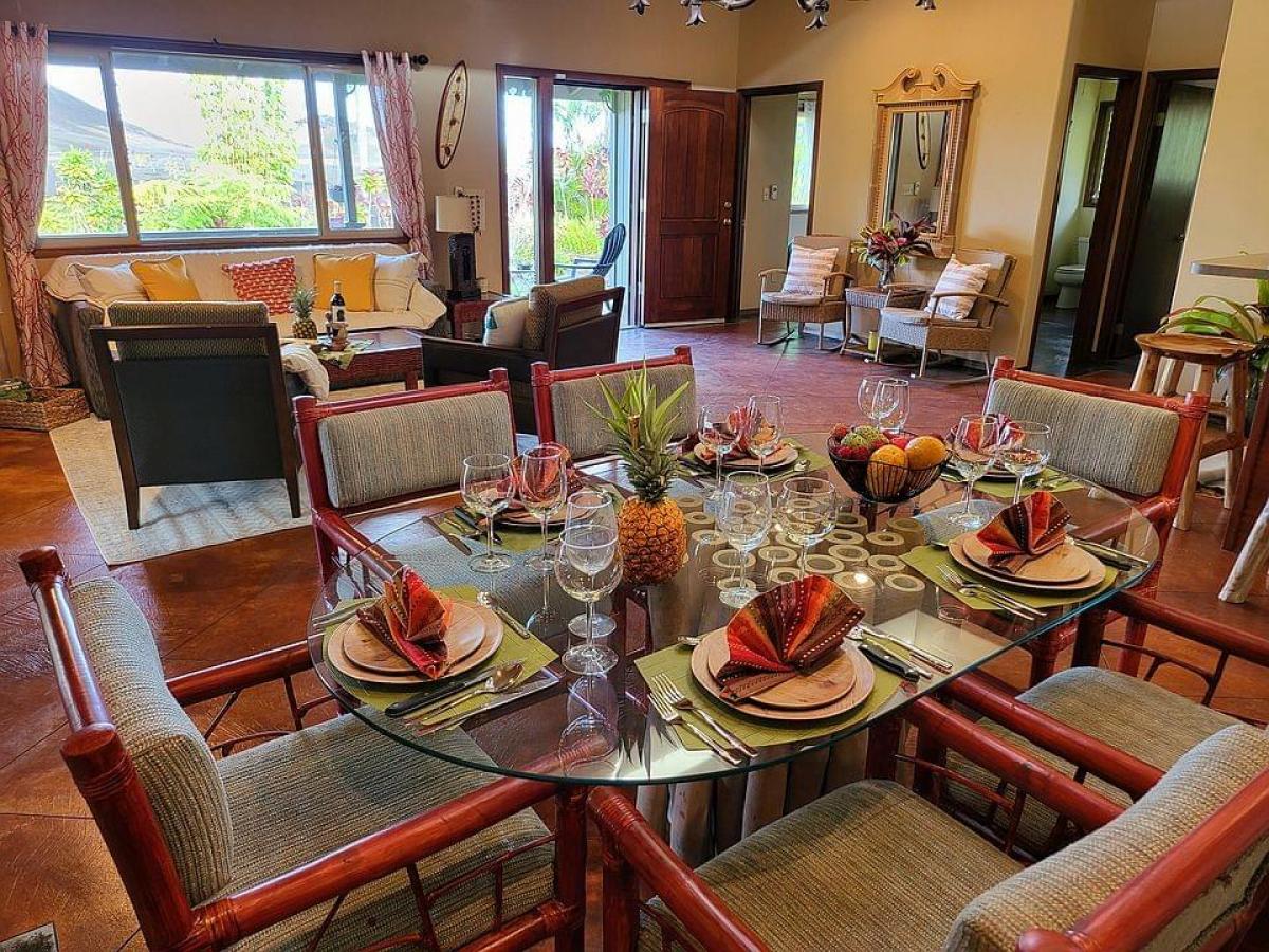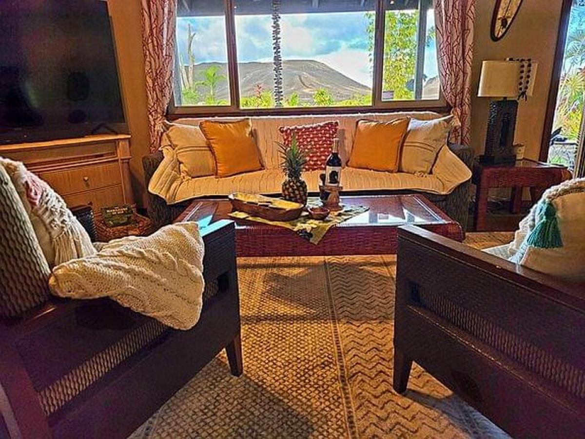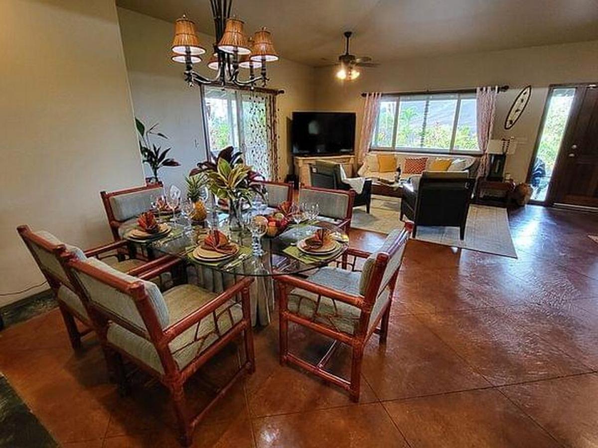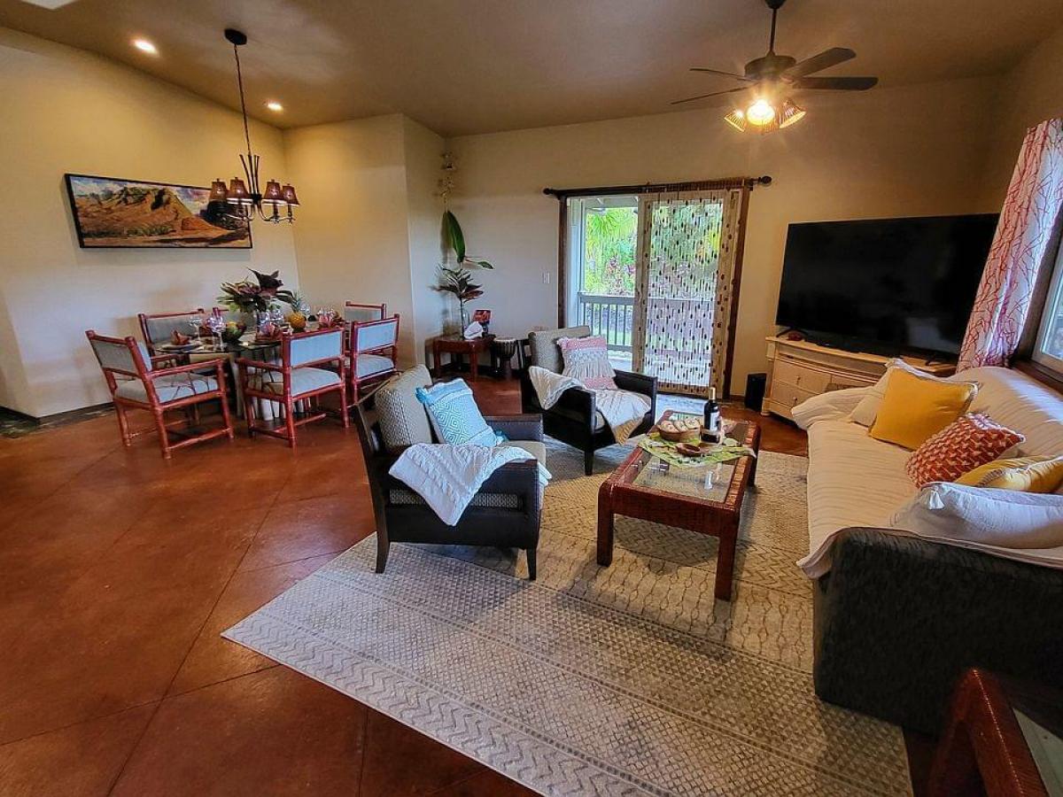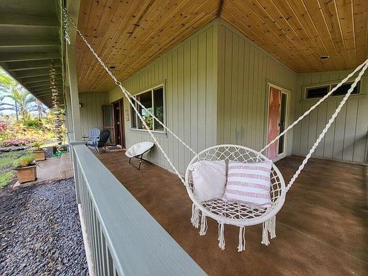 Welcome to this charming 2-bedroom, 2-bathroom home in Leilani Estates, located just a stone's throw from the famed Fissure 8, on two private acres. This home offers a unique blend of modern comfort and natural beauty, with exceptional features and lush surroundings. Upon entering, you'll see stained concrete floors, and a unique ceiling with cupola that creates a spacious, open atmosphere in the main living area. The well-designed home has an abundance of windows that bring the outside in, offering picturesque views of the serene tropical landscape and the vibrant natural beauty that Leilani Estates is known for. The home is currently being used as a hosted vacation rental known as the Lava House, showcasing its appeal to travelers seeking an authentic Hawaiian experience. The fully equipped kitchen is perfect for preparing meals with ease and seamlessly flows into the open dining and living areas, ensuring everyone stays connected while enjoying meals or unwinding after a day of exploration. The primary bedroom offers a tranquil escape with its ensuite bathroom featuring modern fixtures. The second bedroom is equally spacious, with easy access to the second full bathroom, both designed with comfort and convenience in mind. Access to the property is via a long winding driveway. The property boasts lush landscaping, a true Hawaiian paradise that offers plenty of outdoor space for enjoying the island's beauty. The garden has been lovingly cultivated with local plants, making it both serene and sustainable. The lava eruption of 2018 left behind a spectacular landscape of some of the world's newest Earth. This home survived despite being only 100 feet from Fissure 8. This property offers a rare opportunity, offering visitors a unique experience to witness the island's historic volcanic activity firsthand, while still enjoying peace and privacy.