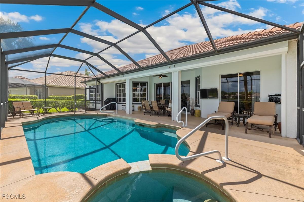 Welcome to your Florida dream home! This beautiful Reddington floor plan residence offers a private pool/spa and has it all. Experience serene lake and golf course views that stretch across the great room, kitchen, master bedroom, den/office, and pool area. This home provides 3 bedrooms, a den/office, and 2.5 baths.The wonderfully maintained home features a spacious kitchen perfect for entertaining, complete with 42-inch wood cabinetry, stainless-steel appliances, granite countertops, a walk-in pantry, a breakfast bar, and an eating area. The formal dining area and great room flow seamlessly, overlooking the pool and gorgeous lake.Relax in the pool and spa on your oversized pavered deck. The spacious primary suite offers sliding door access to the lanai, two walk-in closets, a large soaking tub, a dual walk-in shower, and separate vanities with expansive counter space.Major upgrades include electric hurricane shutters on all windows and sliders, a whole house filtration and osmosis system, coffer ceilings, a laundry sink, a recently painted interior, and new landscaping.The home is located in Somerset at The Plantation Golf & Country Club, a gated community. Low quarterly maintenance fees cover cable, high-speed internet, lawn care, and access to a wide range of amenities, including a Clubhouse, restaurant, resort pool/spa, social clubs, the Hurdzan-Fry championship 18-hole golf course, tennis, pickleball, Bocce ball, and a fitness center. Golf and social memberships are available but not required. Enjoy a great location near I-75, shopping, restaurants, the airport, and beaches.Call today for a tour! YOUR FLORIDA DREAM HOME IS FOUND!