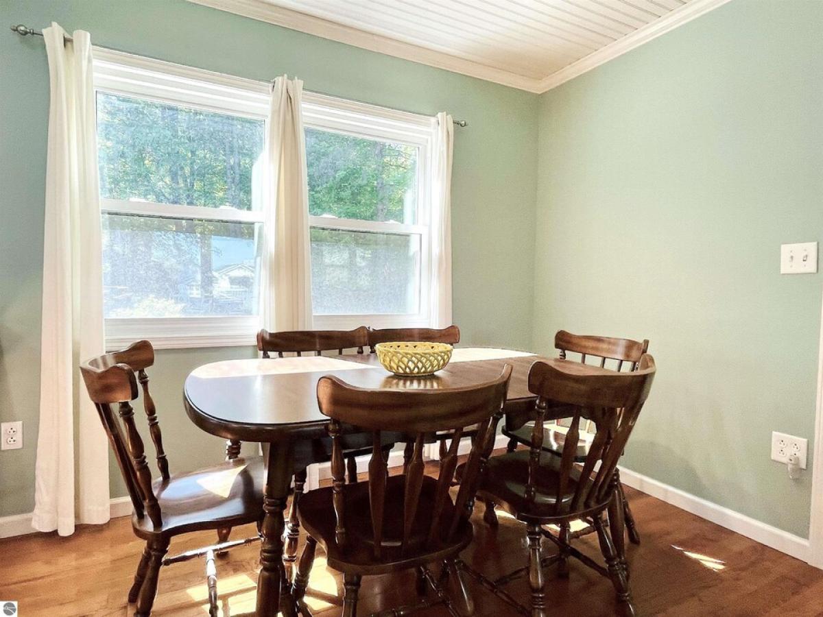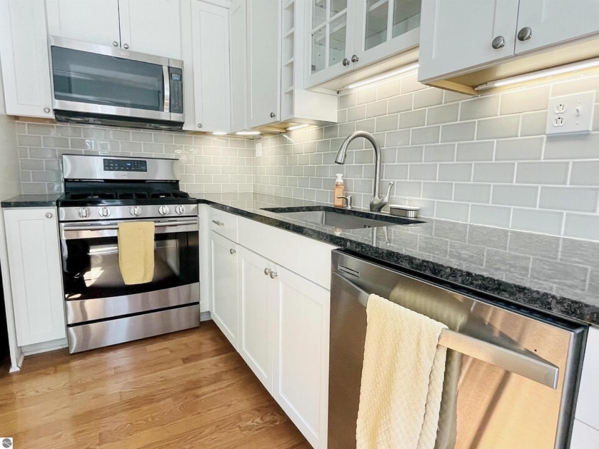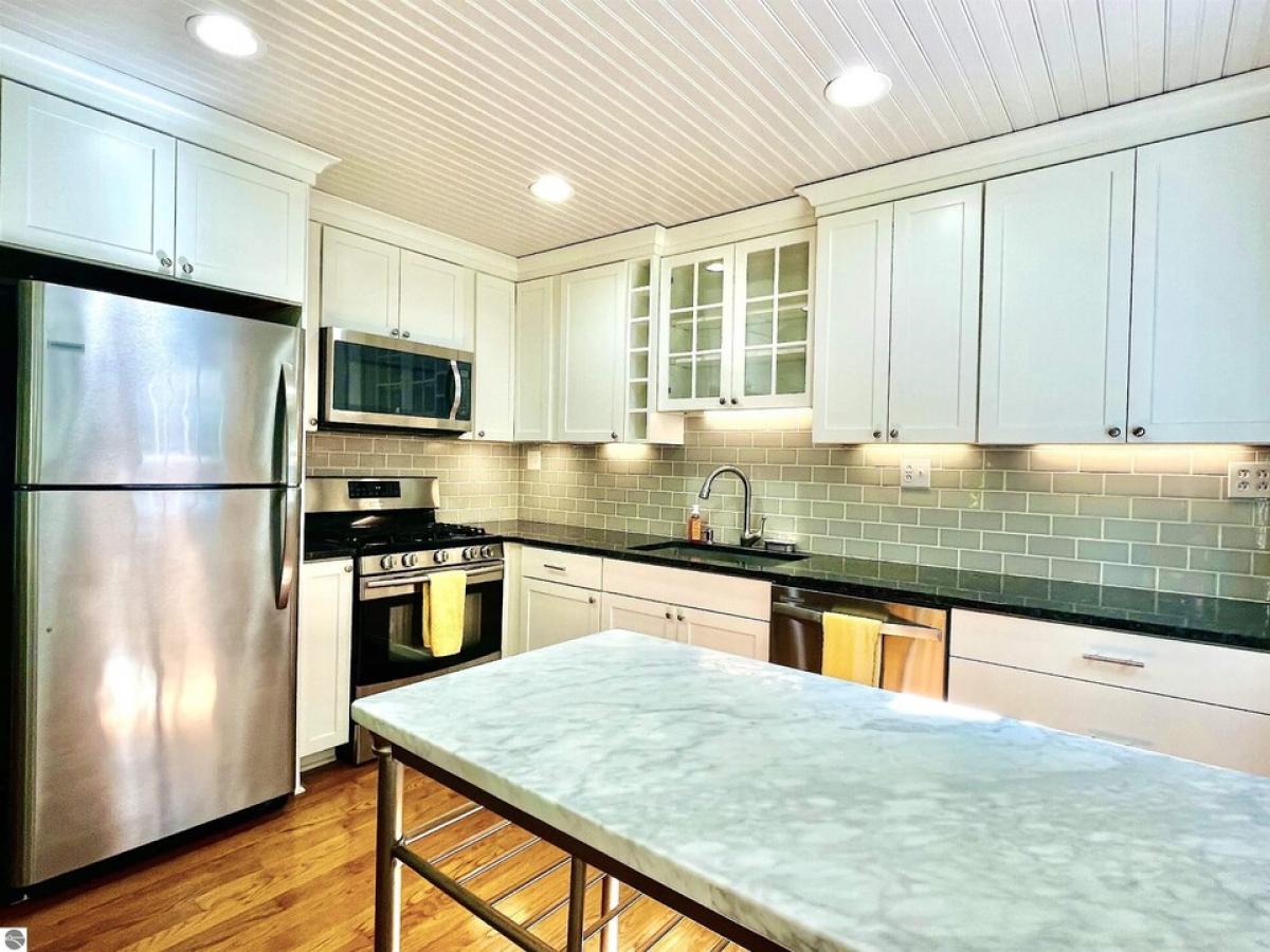 CHARMING COTTAGE FLAIR accompanies this 3BR, 2 bath home with shared Torch Lake frontage across the street. Airy, bright and remodeled on the inside with tongue-&-groove and bead-board ceilings, real hardwood floors, a light and bright modern kitchen with granite countertops, subway tile backsplash, and stainless appliances. A natural wood-burning fireplace is the focal point of the cozy living room. The primary bedroom features large closets and a remodeled bathroom with large walk-in shower and granite countertops. Updated large laundry/mud room with ample cabinets and additional refrigerator. New furnace, central air conditioning, on-demand hot water heater to name a few comfort features. Inside the oversized garage has accents resembling timber-frame barns of days past, with workshop space and plenty of room for all your storage needs. The manicured grounds welcoming you to the spacious deck & covered gazebo overlooking the private large yard and fire-pit situated on 1.7 partially wooded acres with seasonal & peek-a-boo views of Torch Lake; providing a quiet and serene setting. The shared access on Torch Lake is ideal for kayaking, paddleboarding, swimming, or simply relaxing at the water's edge. Nearby towns and villages offer dining, shopping, gallery browsing, wineries, breweries, beaches, hiking trails, skiing, golf, and more. An ideal setup for a summer getaway or year-round home. All of this and it comes FURNISHED.