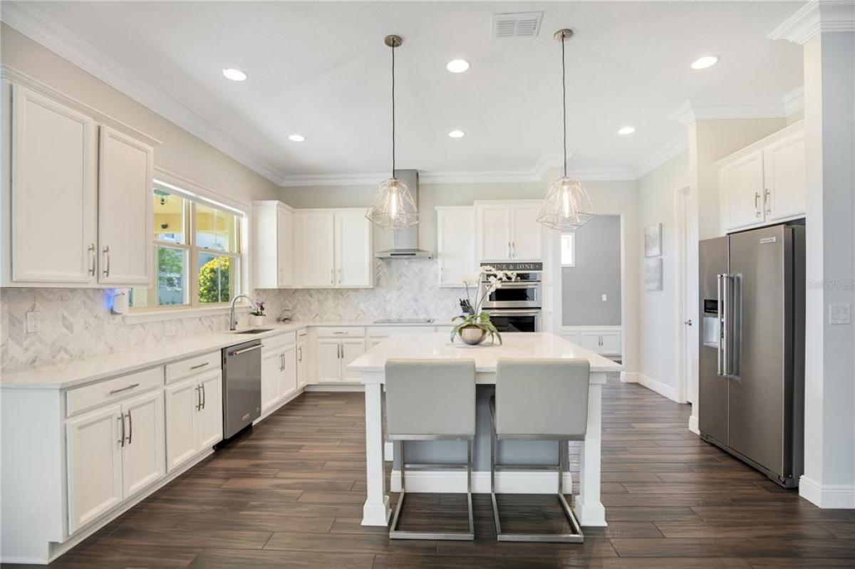 Welcome to 13249 Woodford Street, where luxury living meets thoughtful design. This stunning 4-bedroom, 4-bathroom residence offers elegant finishes, expansive living spaces, and serene pond views in one of Orlando’s most sought-after communities. From the moment you step into the foyer, this home makes an impression. The wood-look tile flooring is both beautiful and practical—durable, water-resistant, and virtually maintenance-free. At the heart of the home, an open family room, kitchen, and dining area set the stage for effortless living and entertaining. The chef’s dream kitchen is as functional as it is stylish, featuring top-of-the-line KitchenAid appliances, quartz countertops, an oversized island with seating, 48-inch cabinetry, tile backsplash, and abundant storage with a large walk-in pantry! The island provides space for baking or entertaining, while still offering casual seating for quick meals. Just off the kitchen, a full bath has been thoughtfully designed with future pool living in mind. The separate dining area, flowing between the kitchen and family room, accommodates a large table with ease, making holidays and dinner parties a joy. From here, sliding glass doors lead to a covered lanai that spans the entire width of the home. Facing east, this incredible outdoor living space captures peaceful sunrises and stays shaded through the afternoon and evening, allowing you to relax or entertain comfortably year-round. The family room shines with a custom tiled entertainment wall, complete with an electric fireplace and a designated space for your wall-mounted TV. A separate dry bar area adds both storage and function with counter space, cabinetry, and a beverage refrigerator—perfect for gatherings. A downstairs bedroom with ensuite full bath is ideal for guests or a private home office. Head upstairs to a spacious loft with two sets of sliding glass doors for exceptional views. These doors open up onto the full-length screened balcony with Polywood flooring. Overlooking the tranquil pond, this space provides an incredible extension of your living area—perfect for morning coffee at sunrise or shaded afternoons and evenings spent outdoors, maybe even catching a rocket launch from Cape Canaveral. The primary suite is an oversized retreat with slider doors opening to the balcony water view. Its spa-inspired bath offers dual sinks, a custom walk-in shower with rain head, and a separate water closet. An bonus feature in the bathroom is a vanity island, blending luxury and practicality, with added storage and counter space! Dual walk-in closets between the bedroom and bathroom are convenient and provide more privacy and ease of dressing. Two additional upstairs bedrooms and a full bath complete the perfect family layout. The secondary bathroom upstairs has dual sinks and a shower/tub combination. All showers in the home feature tiled walls all the way from the floor to the ceiling. The laundry room is upstairs with a sink and cabinet/countertop space making folding clothing easy. Additional highlights include high ceilings with 8-foot doors throughout, a 3-car garage (one tandem, ideal for storage, golf cart storage, or a home gym), a convenient drop zone at the garage entry with low cabinets and regular height cabinets, and a water filtration system serving the entire home! Check out the Matterport 3-D link to see this home NOW! It offers it all—style, function, and a setting you’ll fall in love with.