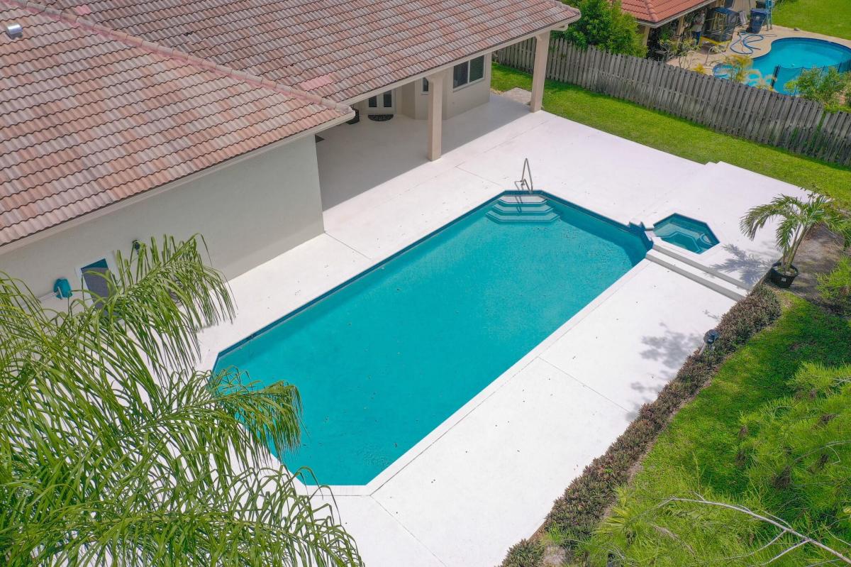 AGGRESSIVELY REDUCED TO A FIRM PRICE...INDOOR-OUTDOOR LIVING at its finest! IMPACT GLASS, soaring ceilings, marble floors, and an oversized 39 x 17 LAP POOL with spa define this remodeled cul-de-sac retreat. Ideally set on a large lot with mature landscaping in back for privacy and endless potential to create your dream tropical oasis. Nestled on a quiet cul-de-sac, this property offers a seamless flow between indoor and outdoor living. Light up the tiki torches and enjoy ''alfresco dining'' under the expansive covered patio--perfect for entertaining or relaxing, with plenty of green space for your four-legged friends. The oversized driveway, spacious front porch, and grand architectural columns create instant curb appeal.Beautiful wood double doors with etched glass panels open to a bright, open layout with soaring cathedral ceilings, impact glass windows, and exotic contemporary lighting and fans that add a modern touch throughout.The living room features elegant French doors with transom windows and flows effortlessly into a spacious family room and open kitchen. Natural light pours through the large French doors and windows, highlighting the open space and high ceilings.The kitchen is finished with white cabinetry, full granite counters and backsplash, stainless steel appliances, including a newer induction stove and a raised breakfast bar for extra seating. Vinyl plank floors extend throughout all four bedrooms, adding warmth and style.The expansive primary suite includes a large sitting area with plenty of windows overlooking the pool, tray ceilings, French door access to the patio, and dual walk-in closets. The spa-like primary bath impresses with 36" porcelain tile floors, a freestanding soaking tub, and an oversized walk-in shower with dual showerheads. The shower walls feature beautiful white and gray porcelain tile with a marble-look design, accented by sleek chrome fixtures.A separate wing offers two additional bedrooms and a guest bath finished in marble. Bedroom 3 has an en-suite cabana bath with marble floors and shower walls for easy pool access. The fourth bedroom, located off the living room with glass French doors, is ideal for an office or guest suite.Additional highlights include a laundry room with a top-of-the-line Samsung washer and dryer, a laundry sink, and upper cabinetry. Recent updates include a newer pool pump, water heater, induction stove, dishwasher, and washer/dryer. The garage features built-in shelving, a generator outlet, pull-down attic stairs, and a side service door.Located in a NO-HOA community near top-rated schools, world-class equestrian venues, dining, and shopping. Ideal for Airbnb opportunities or simply enjoying the perfect Wellington lifestyle. Golf cart distance to restaurants, parks, and schools!