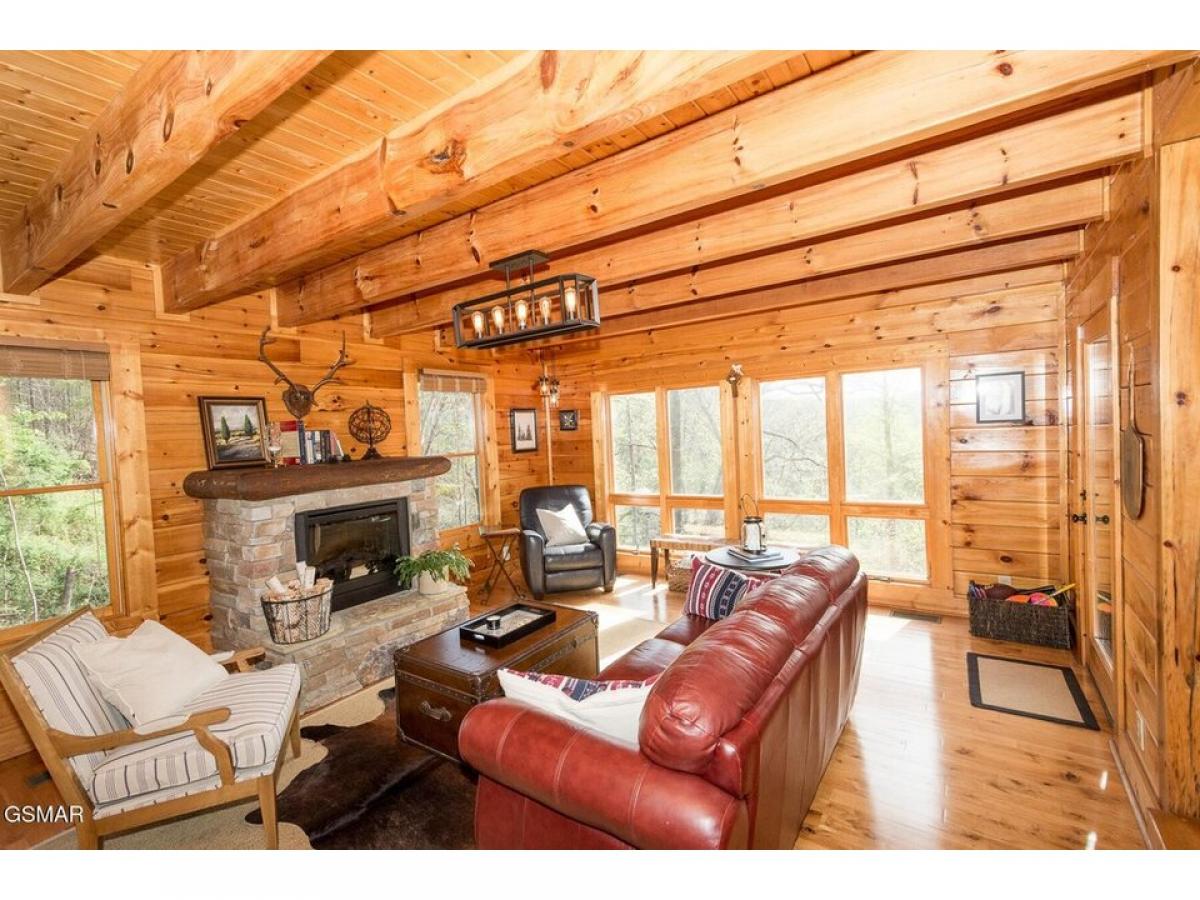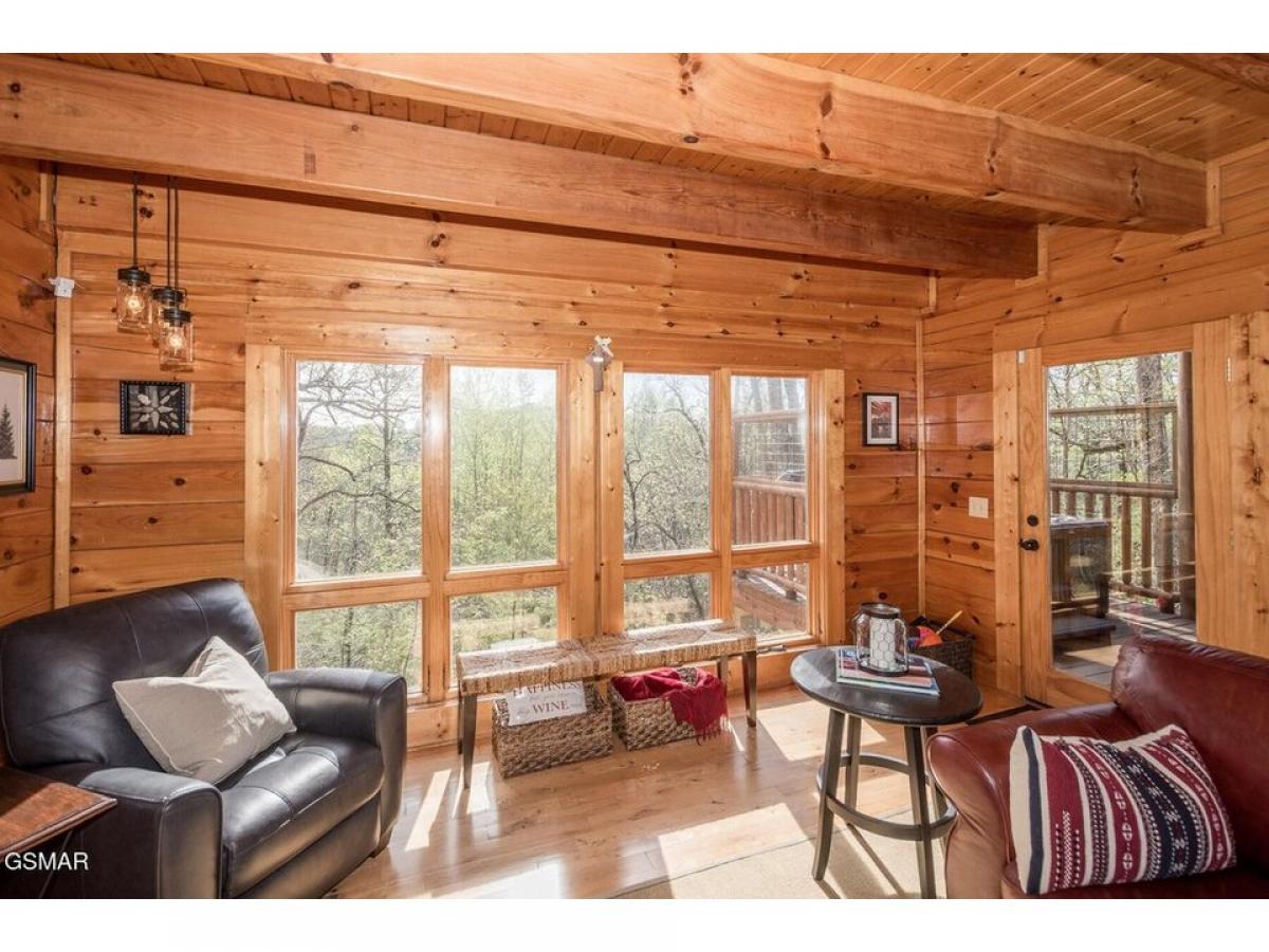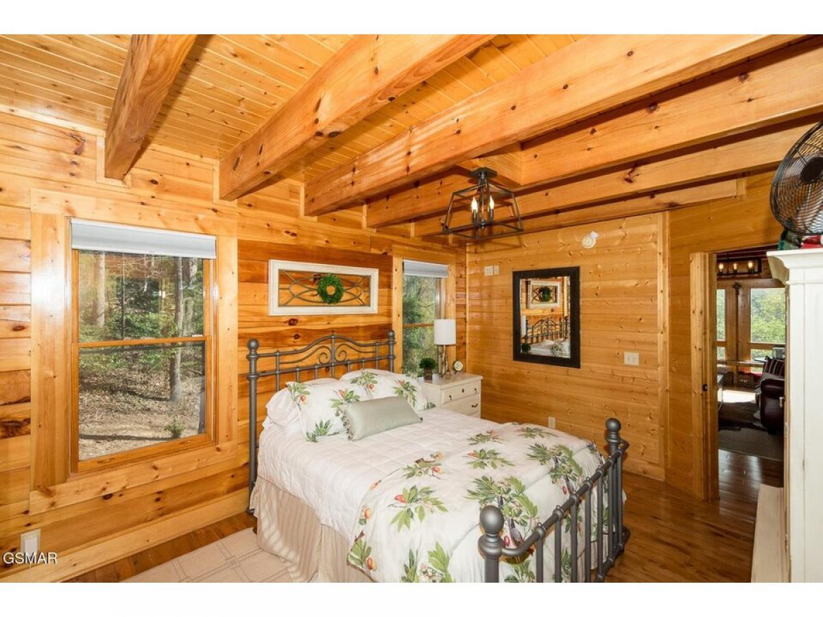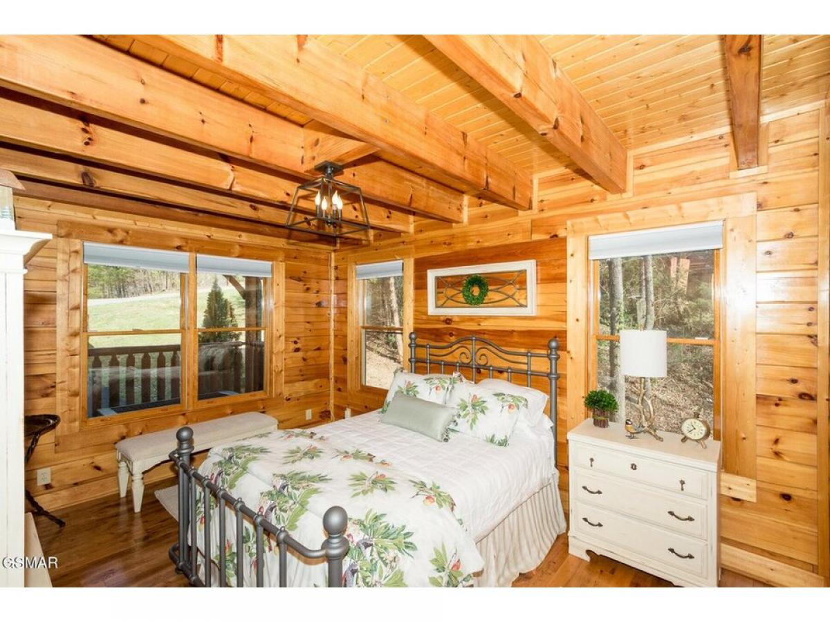 Pristine Condition- Every surface has been refinished and upgraded. A total make over! Set perfectly in the trees, this is a woodland paradise, with National Park Mountain Views. Close in and convenient, located at the top and back of small desirable resort, Cedar Creek Crossing on .71 of an acre which is just minutes from downtown Pigeon Forge. Master is conveniently located on the main level, another up with its own bath as well and the third bedroom is an open loft high in the rafters. The quality of the log timbers, open beams, walls of glass on every side is spectacular- you will never want to leave. None of the new construction can compete with this high end true log construction! You will love the open floor plan, the large recreation room with second gathering area. The new refreshed mountain modern decor shows off the timeless features of at the open stairwell, the gleaming hardwoods and hemlock. Light pours in through the windows all day to make this an airy treehouse! Beautiful resurfaced circular driveway is surrounded by rock outcropping dry bed natural landscaping. A fire pit, outdoor grilling and large front covered porch make this a cabin that allows you to enjoy the natural Smoky Mountain setting. Comes totally outfitted and ready to enjoy, fully stocked kitchen, hot tub, game table, TV#039;s and beautiful high end bed coverings! In perfect condition, you will not be disappointed! Cabin has not been rented in the last years and since the remodel.
