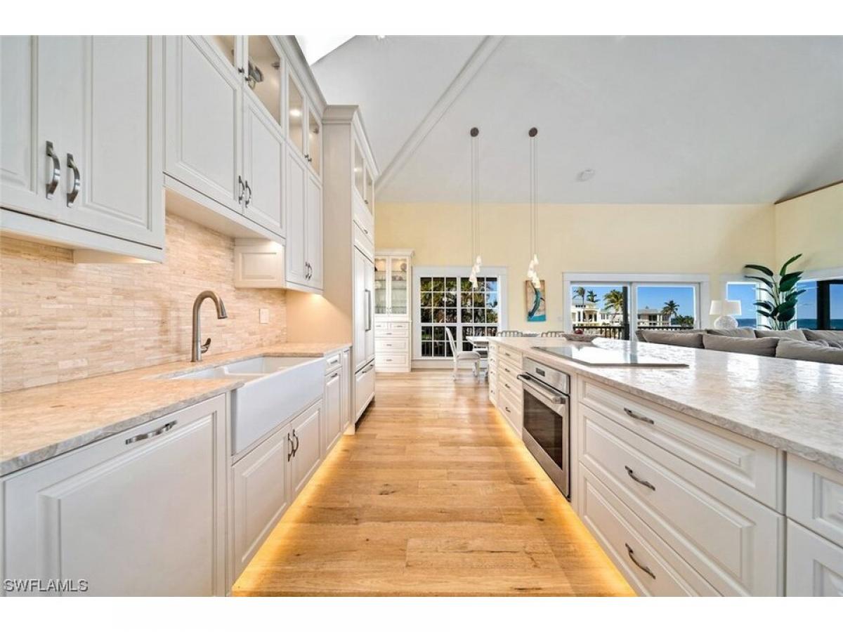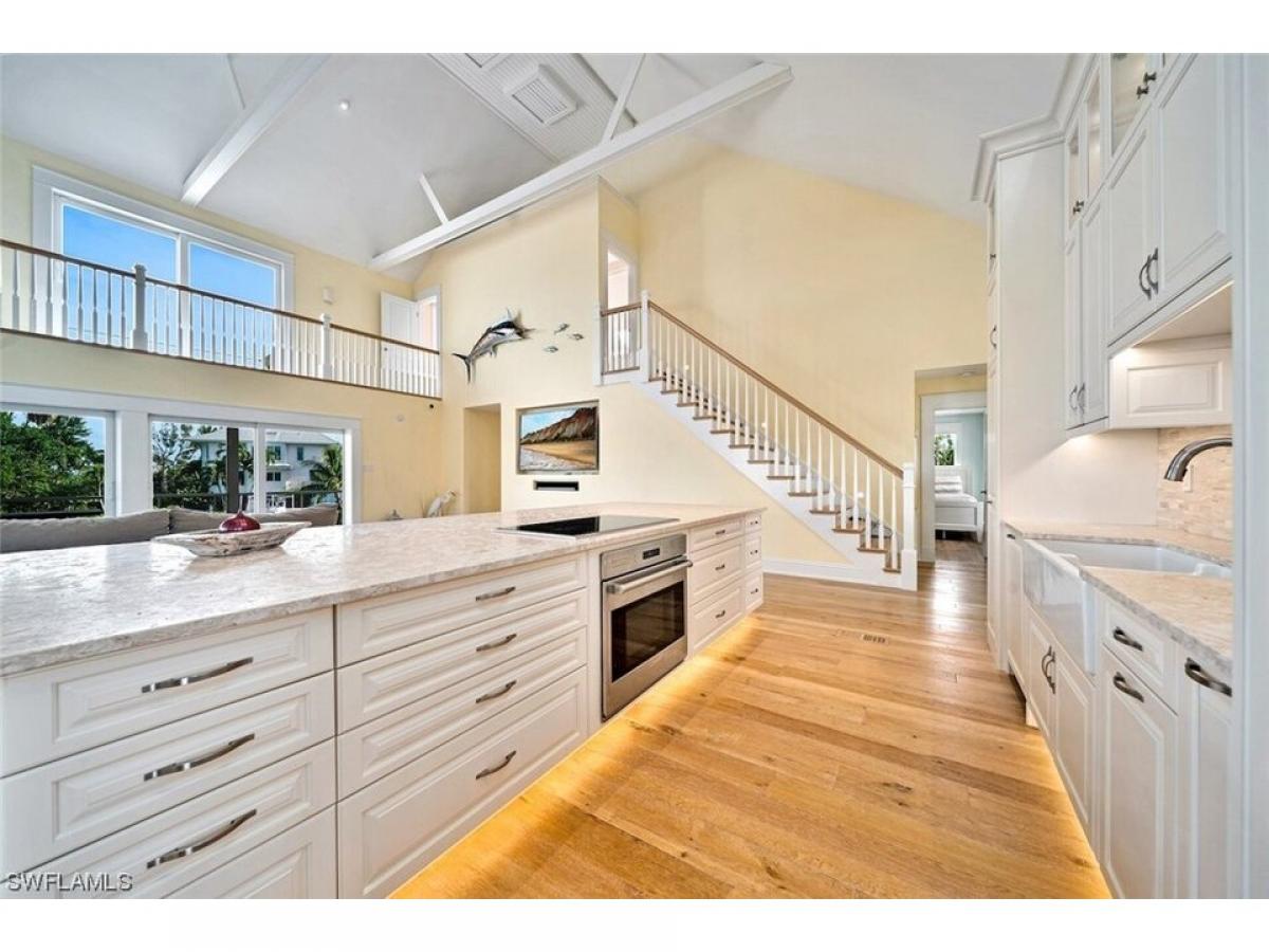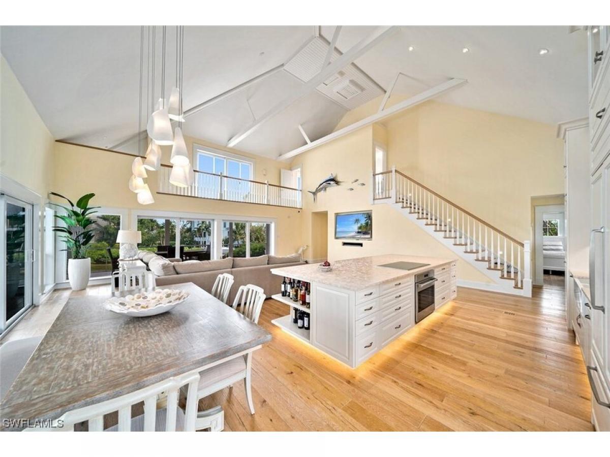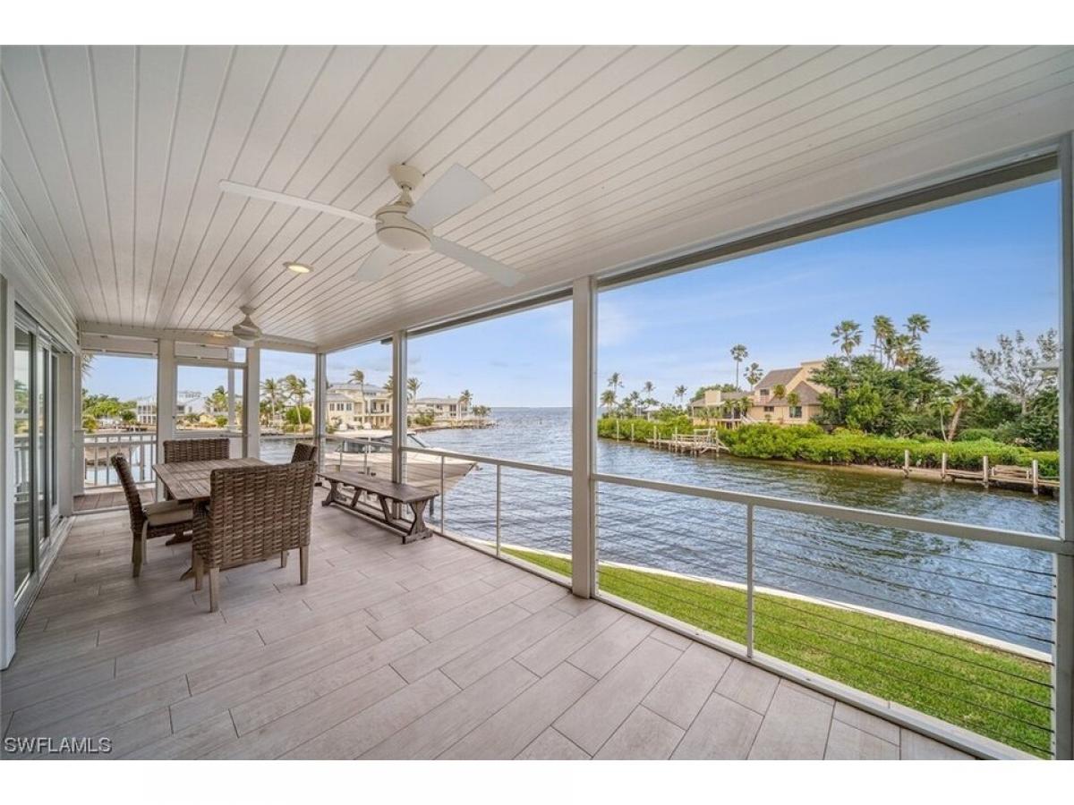 Wow! What a view! This awe inspiring residence rests on an oversized 15,000sqft lot with 170ft of seawall frontage overlooking San Carlos Bay with boat dock, lift and an exceptional pool area featuring picture window screening and copious lounge areas. As you enter, the 18ft cathedral pine ceilings along with wide plank oak flooring and a well appointed kitchen make an alluring impression in the great room, all of which focuses on the view. The primary suite and office encompass the second floor with large walk in closets, a gorgeous bathroom and an expansive deck with impressive views. Additional rooms on the main level include two guest rooms, both ensuite, a half bath and a laundry room. This award winning Olde Florida home was also designed with spacious decking which wraps around three sides of the house and lots of French windows and dormers to bring in ample natural light. Two garage spaces and abundant storage for all your toys and hobbies below. This is the one! Video coming soon.