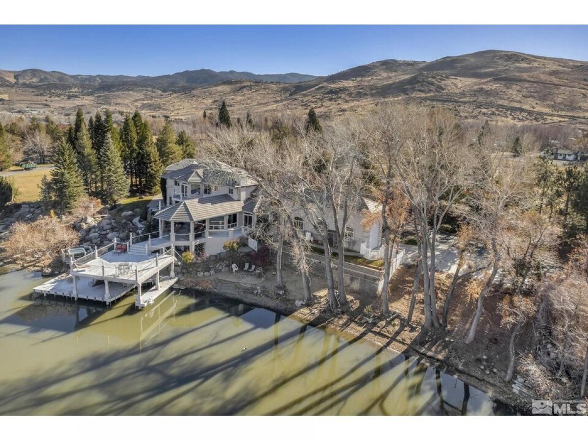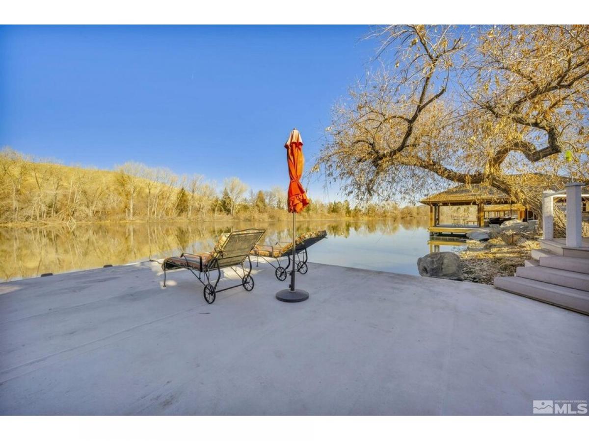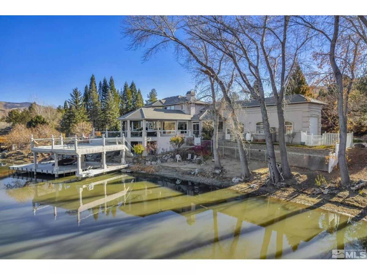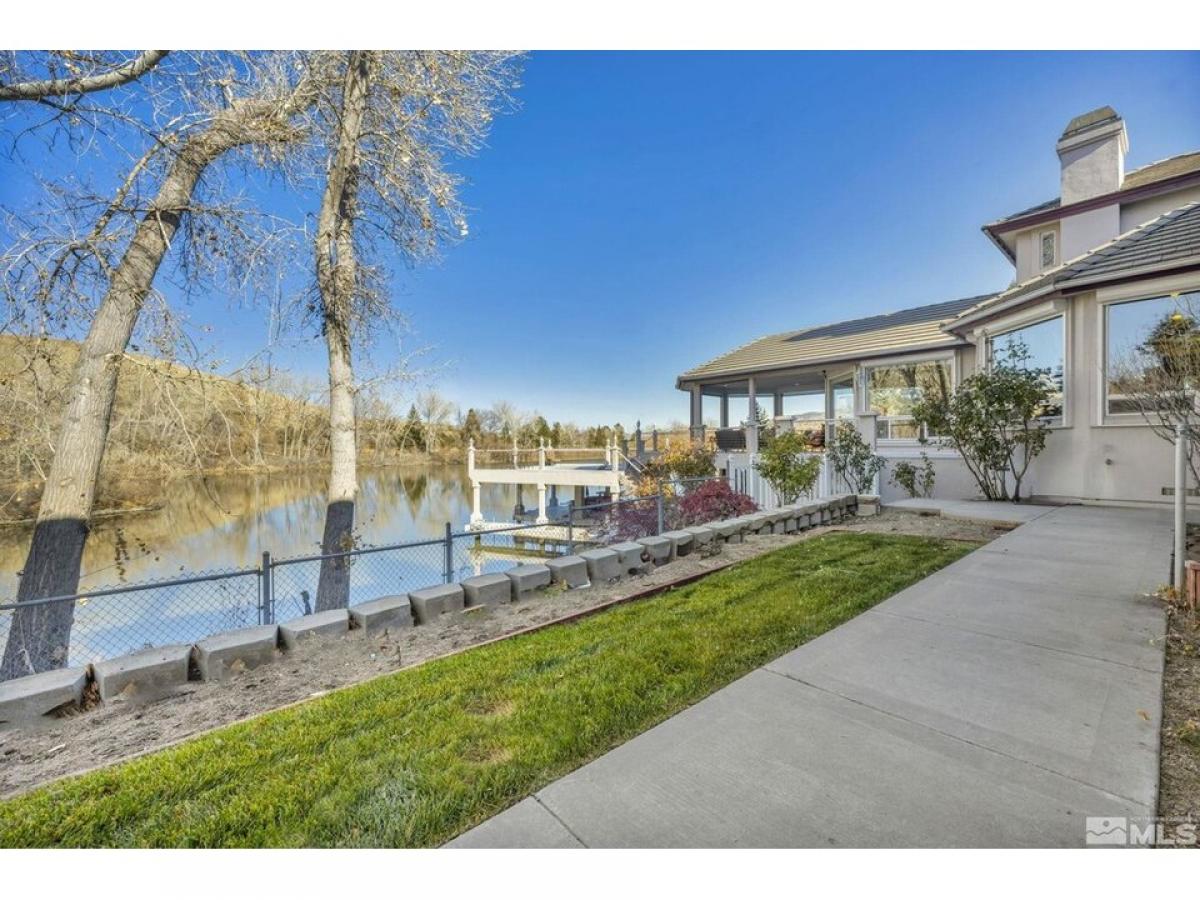 Custom waterfront home on private water ski lake with a dock, boat slip and boat hoist. Only 10 properties in this exclusive gated community! Beautiful built-in BBQ space overlooks mature landscaping and the lake, and allows easy access to the outdoor dining space which is attached to the dock where you can see views of Mt Rose. An upper garden includes covered and raised garden beds, grape vine arches, a variety of fruit, and a potting shed. Inside you will find stunning views all around.