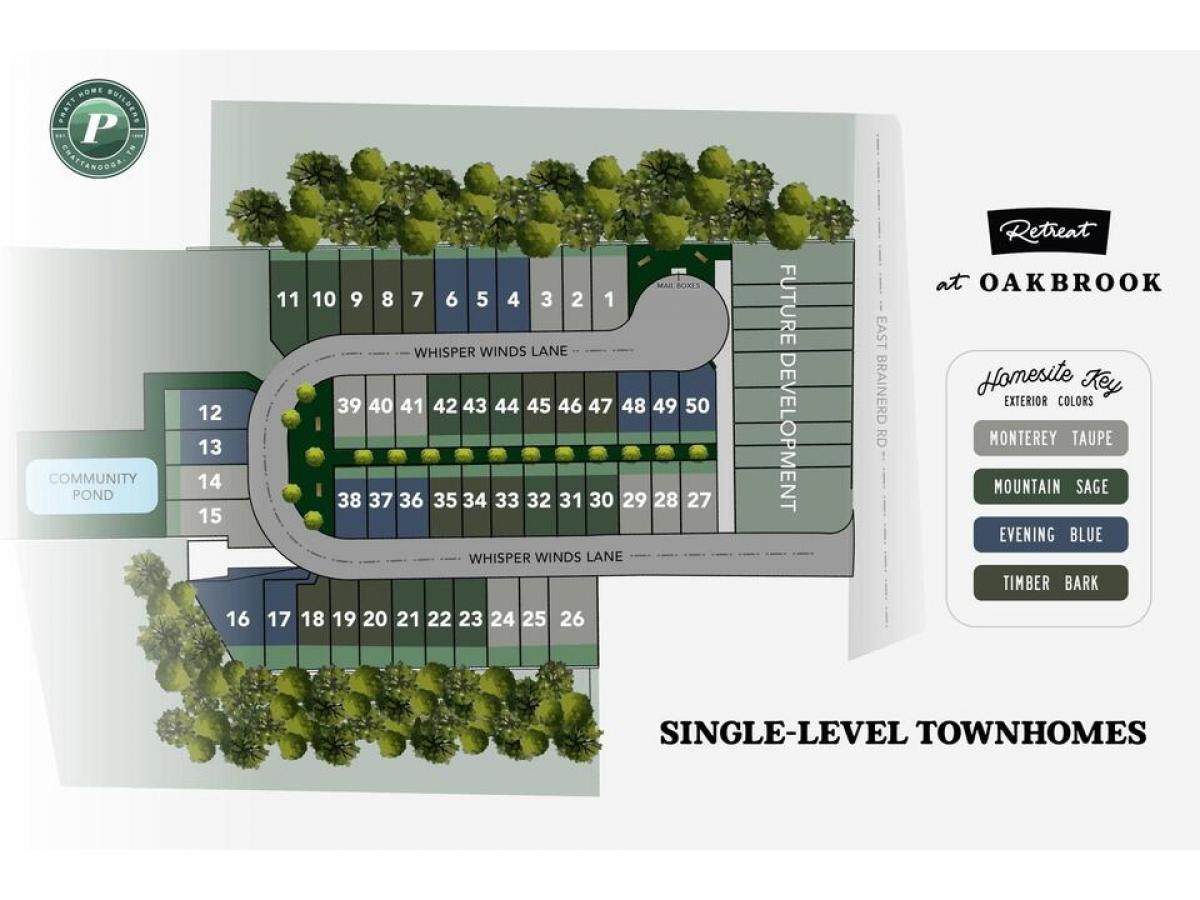 East Brainerd, Tennessee - Introducing the newest community by Pratt Home Builders, Retreat at Oakbrook. Just off Ooltewah-Ringgold Road behind the new Publix and Morning Pointe Memory Care Center, Retreat at Oakbrook features single-level, two bedroom and three bedroom townhomes. HOA includes full lawn care for each home and garden care in community spaces, making it a beautiful community all year long without the hassle. Home Site 50 is the Orchid home plan, featuring 3 spacious bedrooms and 2 full bathrooms to match. Walking through the front door, you'll find the first guest bedroom at the front of the house and across the hall, just past the garage entry, is the second guest bedroom with a full bathroom in the hall. Wide doorways make for easy wheel-chair access throughout the home, a very unique design feature you don't see often. Moving through the hall, you're greeted by the spacious, open-concept kitchen and great room with sliding glass doors that open up to your private patio oasis. Just a short walk from the kitchen, your laundry room is just outside of the master bedroom. In the bedroom, you'll find the large en suite with double-vanities, a roll-in shower, plus a spacious walk-in closet. With easy access to favorite areas around town and downtown Chattanooga within a half hour's drive, you'll never be short on things to do. Enjoy a meal at Cambridge Square just a short drive away, an evening of entertainment at Collegedale Commons, a round of golf at one of the many area golf courses, shop at Hamilton Place mall and surrounding shops, or enjoy the nature trails at Heritage Park, Audobon Acres, and more. Also located in the Apison Elementary School Zone! Discover Retreat at Oakbrook today and set an appointment with our team to learn more.