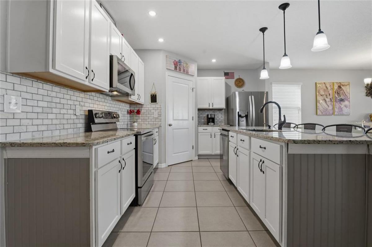 Beautifully updated ranch-style home offering 4 spacious bedrooms and 2 modern bathrooms, perfectly designed for comfort & convenience. Located in a desirable gated community packed with amenities, this home sits on a premium oversized lot with a privacy-fenced backyard and partial water scene, ideal for relaxing or entertaining. The freshly painted interior features high-end fixtures throughout, an oversized kitchen island, a designer backsplash, and a generous sized pantry. Enjoy year-round comfort with an air-conditioned garage, upgraded high-wind shingles for peace of mind, and a generator outlet for added security. The screened lanai provides a serene space to unwind, while the large laundry room adds extra functionality. With its thoughtful upgrades, elegant finishes, and exceptional location, this home offers the perfect blend of style, space, and lifestyle living.