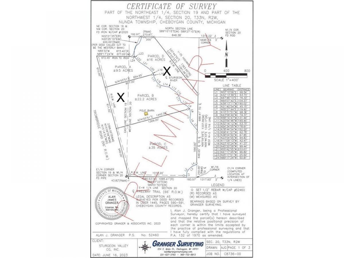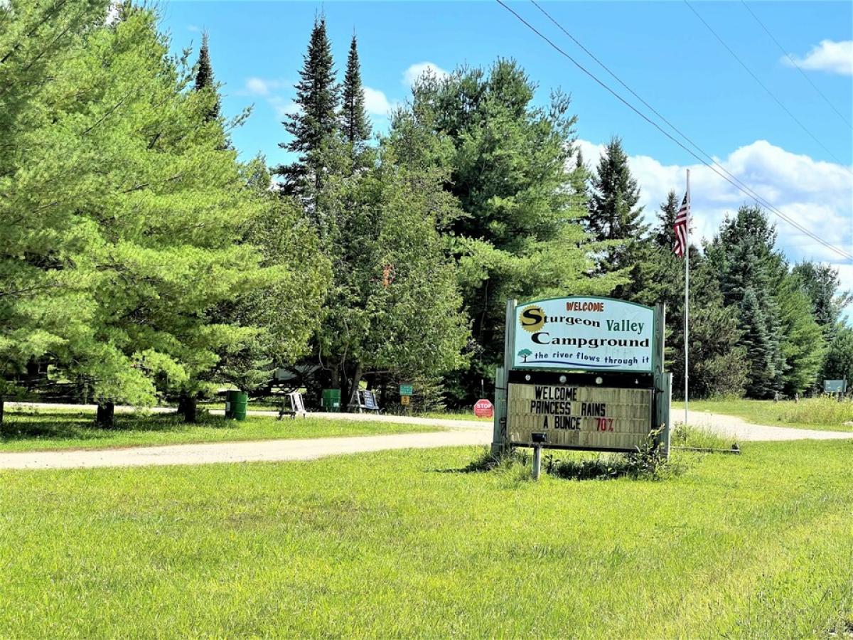 STURGEON VALLEY CAMPGROUND FOR SALE SITTING ON 22 ACRES WITH AN ADDITIONAL 16 ACRES ACROSS THE RIVER. WE have 63 sites at $38 per night, and 3 mini cabins at $55 per night. This is a one of kind opportunity. We have over 1000 feet on the Sturgeon River, along with a swimming pond, storage building, pavilion, nice home, shower and restroom facilities, a few separate cabins and so much more, Call today for more information. SALE SUBJECT TO SPLIT APPROVAL. SEE PARCELS B AND D ON ATTACHED SURVEY