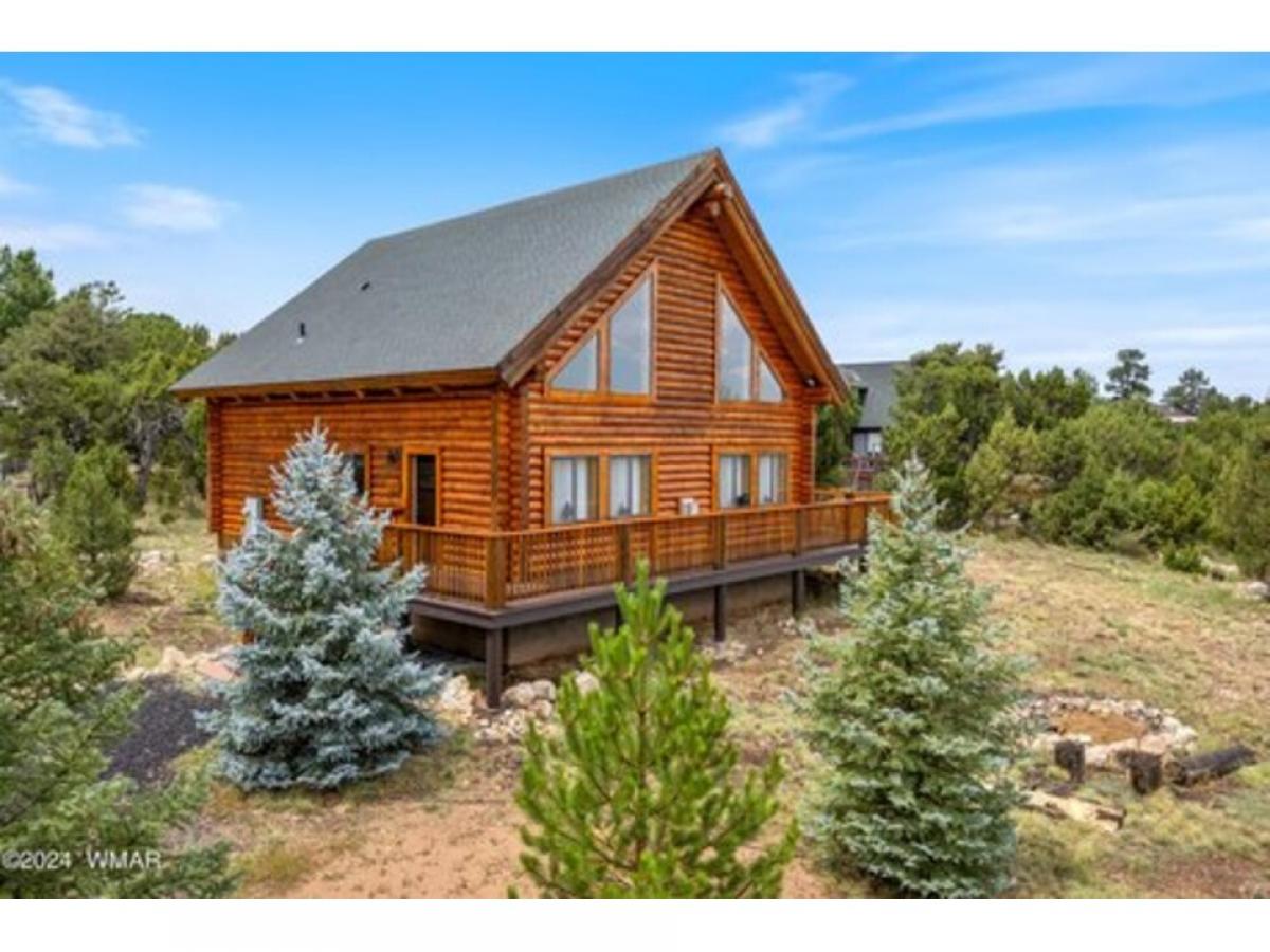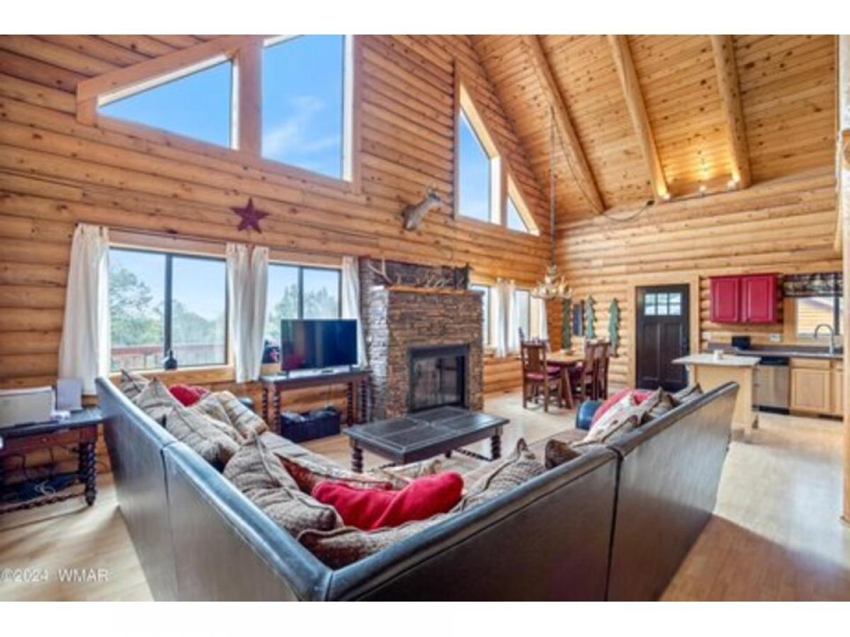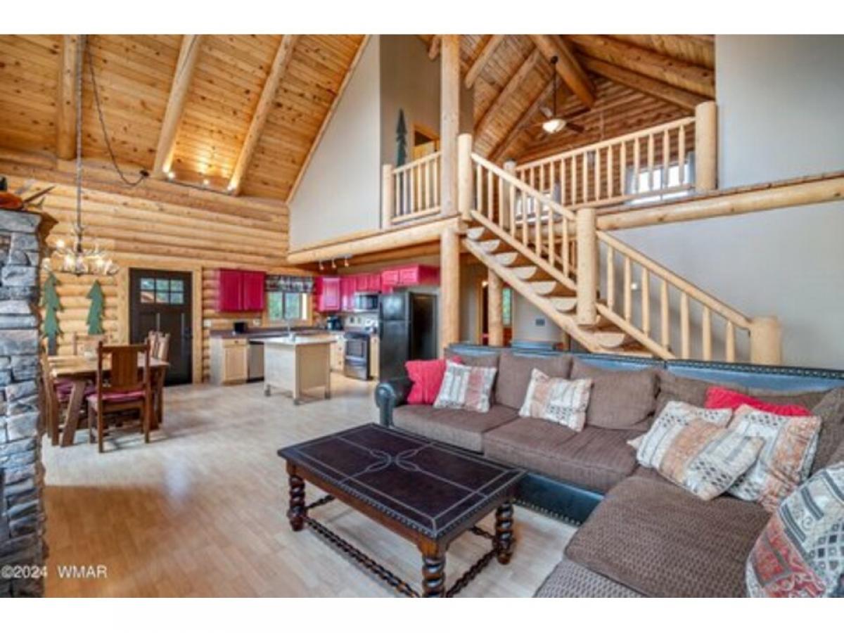 Experience the epitome of mountain living in this custom-built full log chalet-style cabin nestled among breathtaking panoramic views. Boasting three bedrooms and two baths, this home features massive exposed log beams and peel pole log accents throughout. The centerpiece is a rock face gas fireplace, complemented by knotty hickory cabinets in the spacious kitchen. Tons of windows illuminate the open floor plan, with two bedrooms conveniently located on the main floor. The open loft master suite offers unparalleled vistas, perfect for relaxation. Enjoy year-round comfort with central heating and cooling, and entertain on the recently refinished wraparound deck and freshly stained cabin and garage. Additional amenities include a 2-car pull-through garage, all accessible via a paved etc... county-maintained road, located in an HOA to protect your investment, ensuring both luxury and convenience in this mountain retreat. View TODAY!
