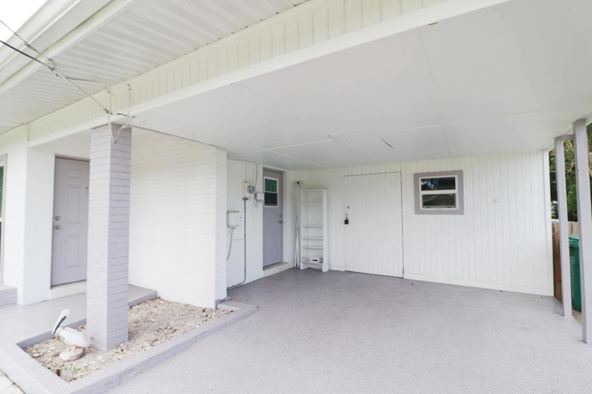 This safe and sturdy CBS home features a 2020 metal roof and 2019 impact windows. This home is blessed with many windows and is bathed in natural light. The original terrazzo floors mixed with the plantation shutters and the updated kitchen and bathroom creates a crisp, clean feel with a lot of character. Don't let the small footprint fool you, this home has a lot of closet space, pantry space and creative storage solutions that will free up a lot of floor space. The covered carport features a 9x15 workshop with ample storage. Bonus Florida room is an additional 130 sf, (not included in the living a/c space), has an in-wall air conditioner and would make a great office, den, play room or whatever suits your needs. County only taxes. Truly move-in-ready and excellent condition. No HOA!