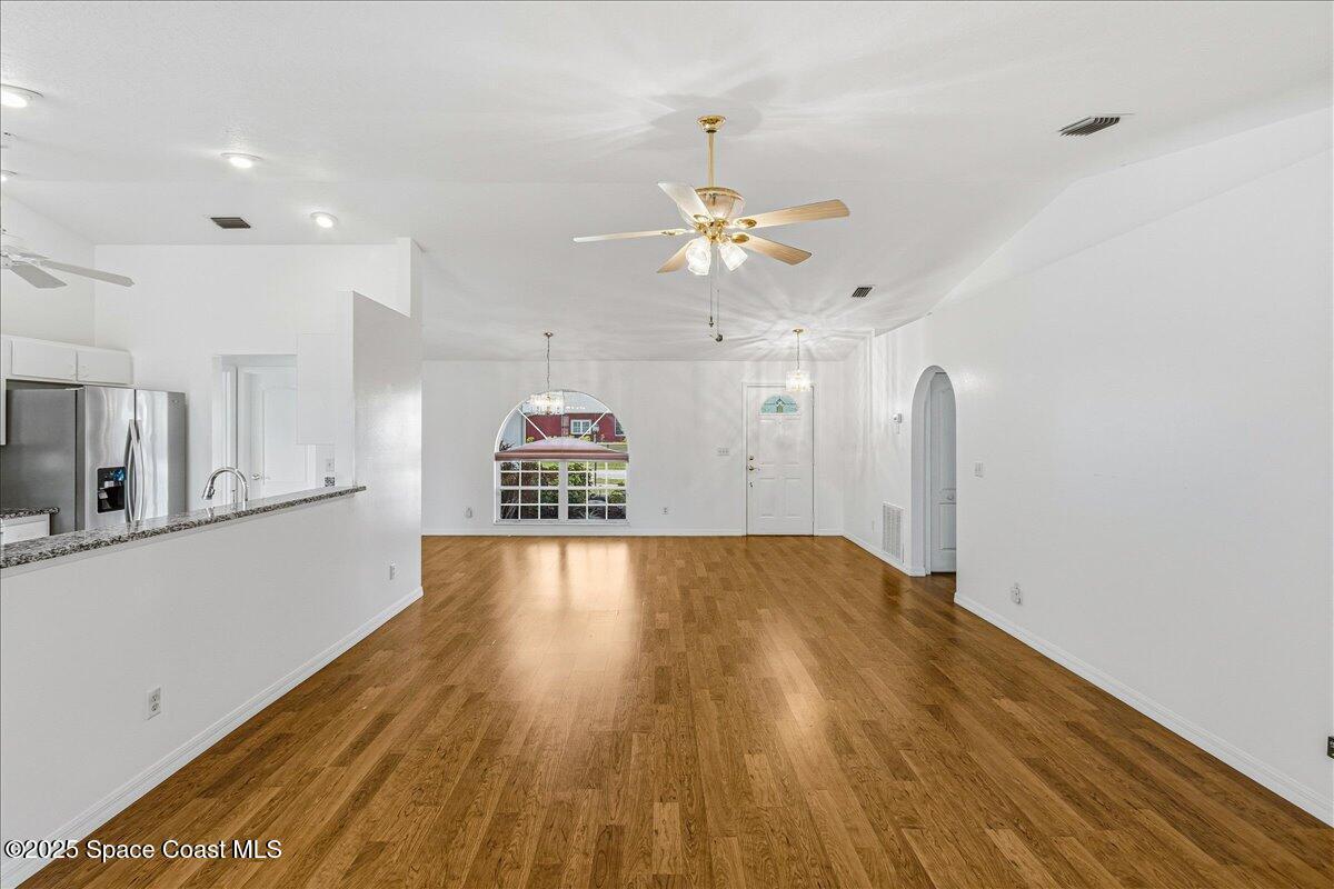 Welcome to this inviting Palm Bay home, featuring an open-concept living space with beautiful real granite in the kitchen and an effortless flow throughout. The bright breakfast nook provides a warm spot to start your day, while the primary bedroom offers generous space and soft, natural light. The primary bath includes both a walk-in shower and a relaxing soaking tub framed by an elegant arched window. A well-kept secondary bathroom continues the home's bright, fresh feel. Enjoy a spacious backyard with room to roam, complete with an electrically equipped shed. The screened porch offers a breezy place to unwind while overlooking the tropical greenery, and the in-unit laundry leads directly into the garage with removable sliding screen doors for added convenience. This well-maintained home blends comfort, functionality, and Florida living at its best.