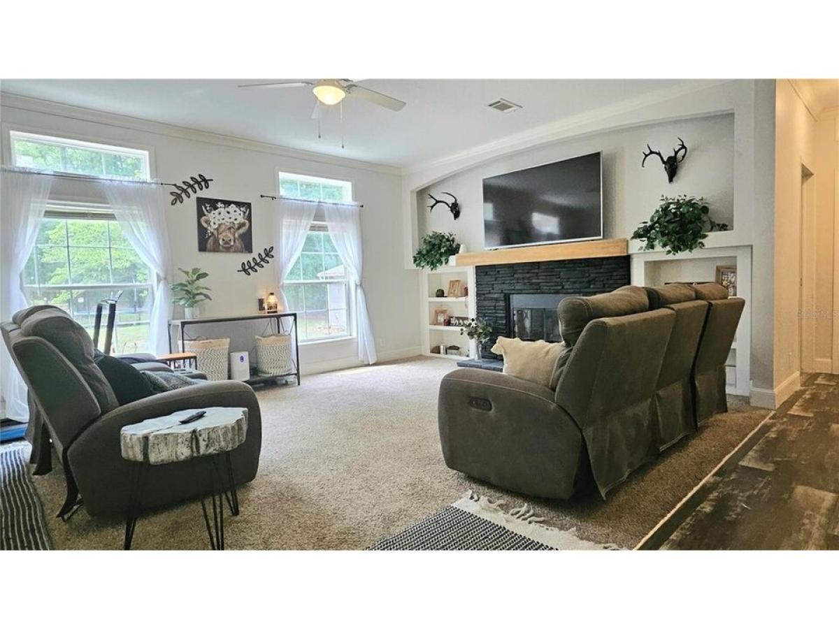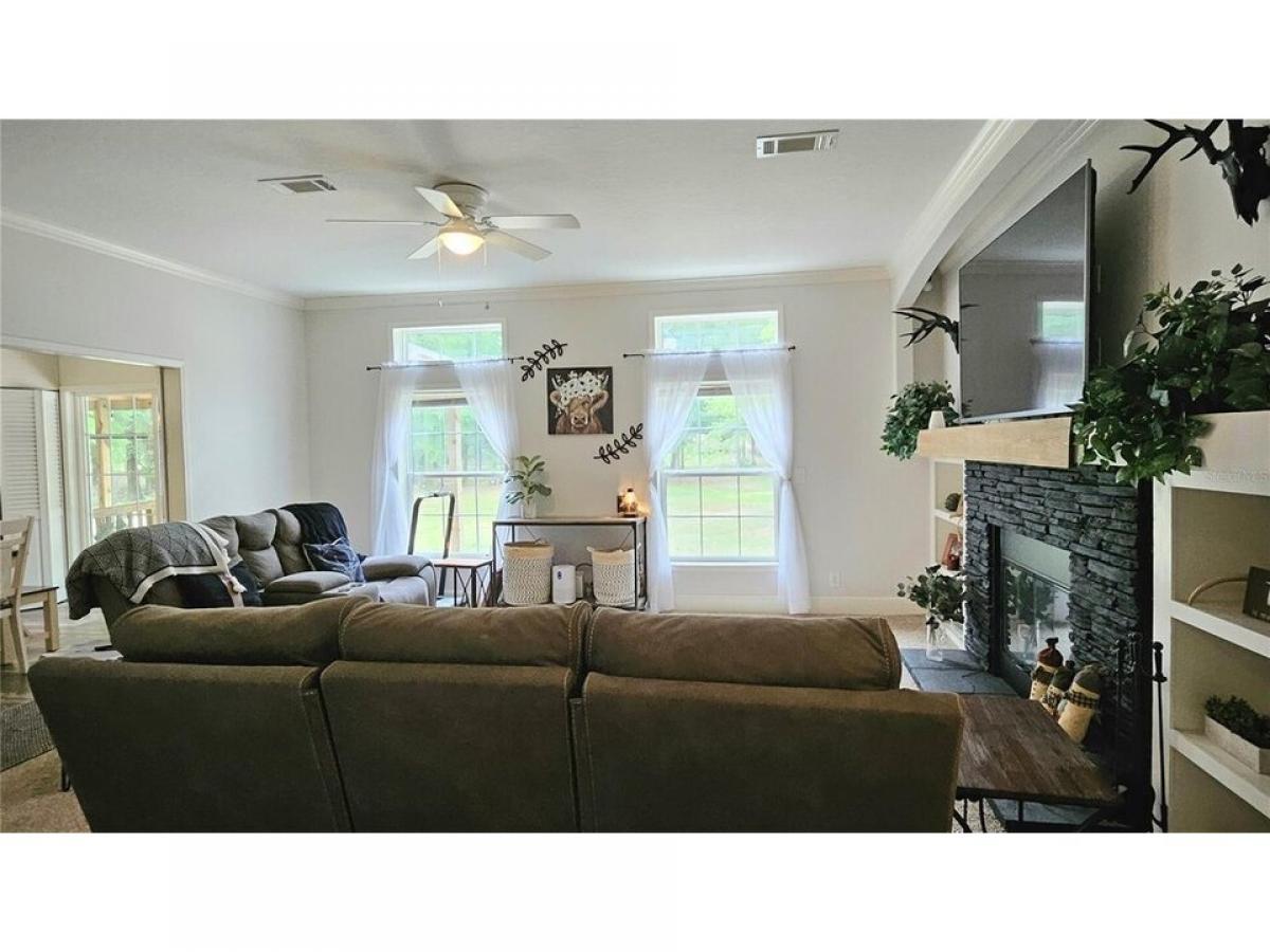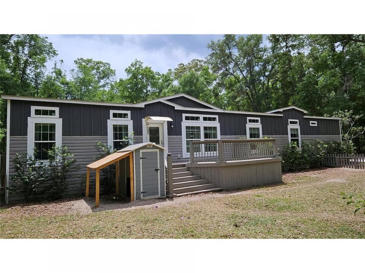 Experience the tranquility of modern country living in this spacious 4-bedroom, 2-bathroom, 2020 home, boasting 2,280 square feet, all situated on over 6 private wooded acres. Centrally located between Gainesville, Alachua, and Newberry, this home is only 15 minutes from everything and completely move-in ready. A convenient circular driveway leads to an oversized detached 2-car garage on one side, and a covered metal carport on the other that is perfect for your boat or utility vehicle. The large wooden deck at the front entrance welcomes you into the front living room, while a convenient side entrance provides access to a useful mudroom with a utility sink. Inside, you#039;ll find plenty of relaxation spaces to unwind. The home feels expansive and open, thanks to 9-foot ceilings and transom windows that flood the area with natural light. The well-lit front living room seamlessly flows into the kitchen, making entertaining a breeze. The spacious central family room features a cozy wood-burning fireplace, perfect for gatherings. The open kitchen is designed for convenience and entertaining, featuring an oversized custom island with a bar, upgraded appliances, a stainless steel farmhouse sink, double-stacked cabinets, abundant counter space, a full-height pantry, and a utility closet. The generously sized master bedroom is filled with sunlight from large windows and offers a luxurious retreat with its spacious spa-like ensuite bathroom, complete with a garden tub and a luxury walk-in shower. This well-designed split floor plan features three inviting guest bedrooms on the opposite side of the home, ensuring privacy. Accessible from the family room, the space includes a beautifully upgraded full guest bathroom with a luxurious garden tub and shower combination, along with a stylish dual vanity with two sinks. Step outside to the comfortable, covered back patio, equipped with an oversized ceiling fan, offering an ideal outdoor relaxation space. You can fully immerse yourself in nature by walking the footpaths or riding ATVs on the trails that wind through the wooded property.