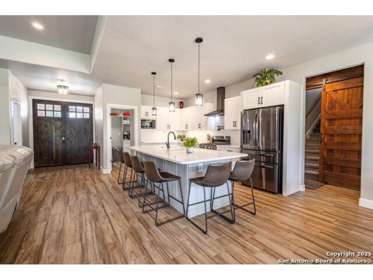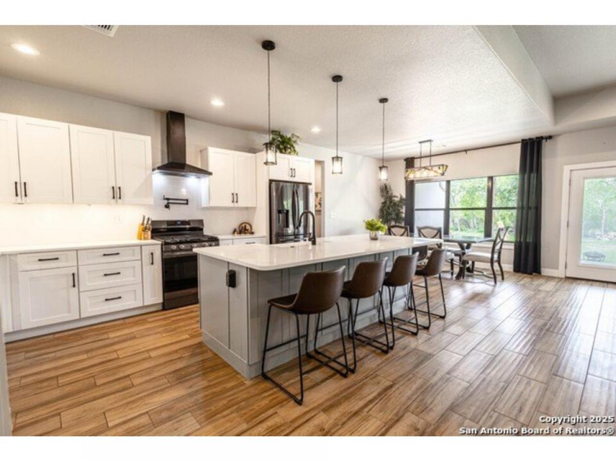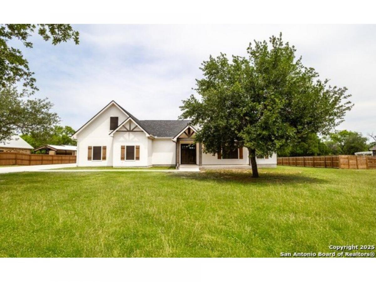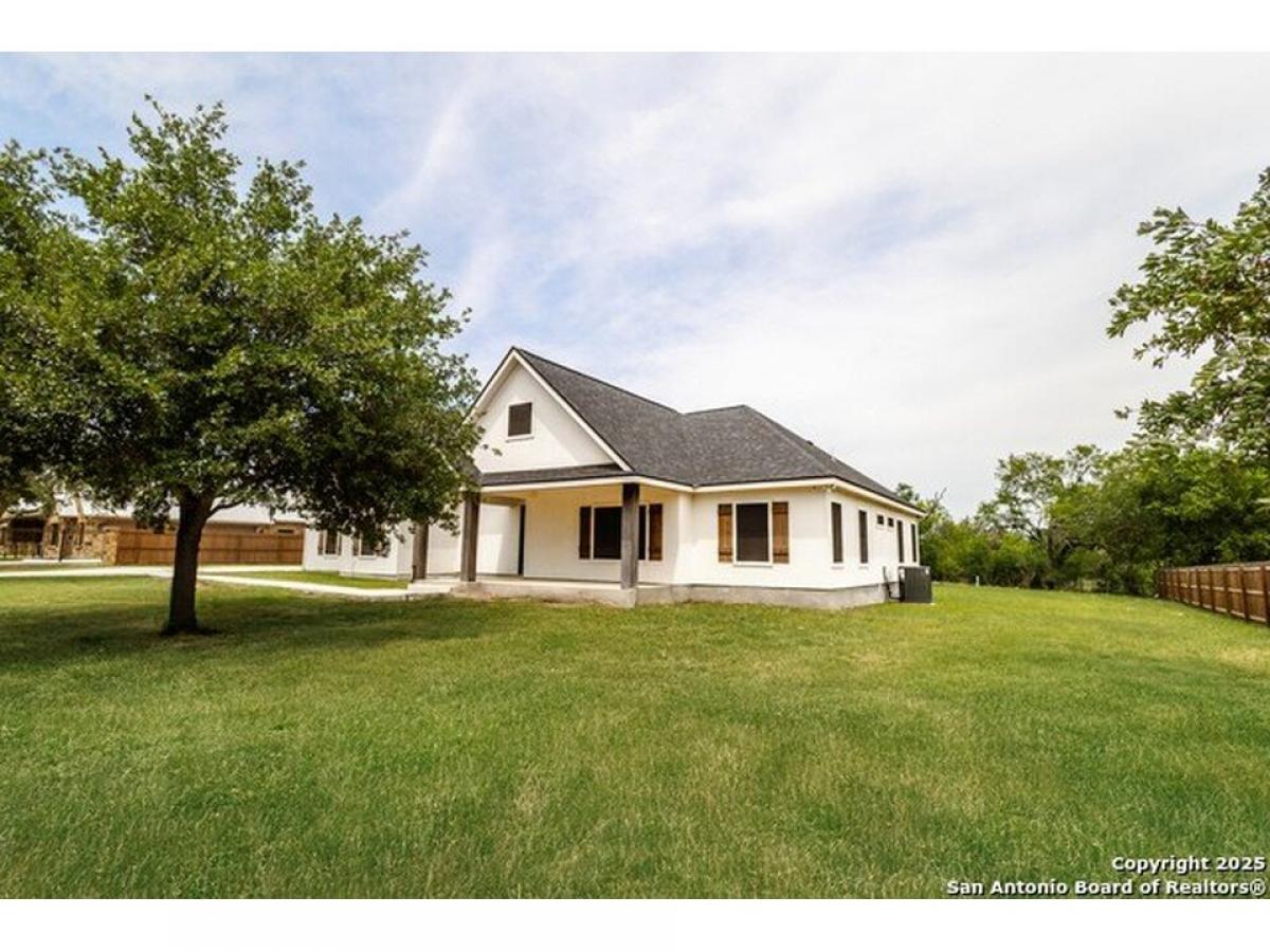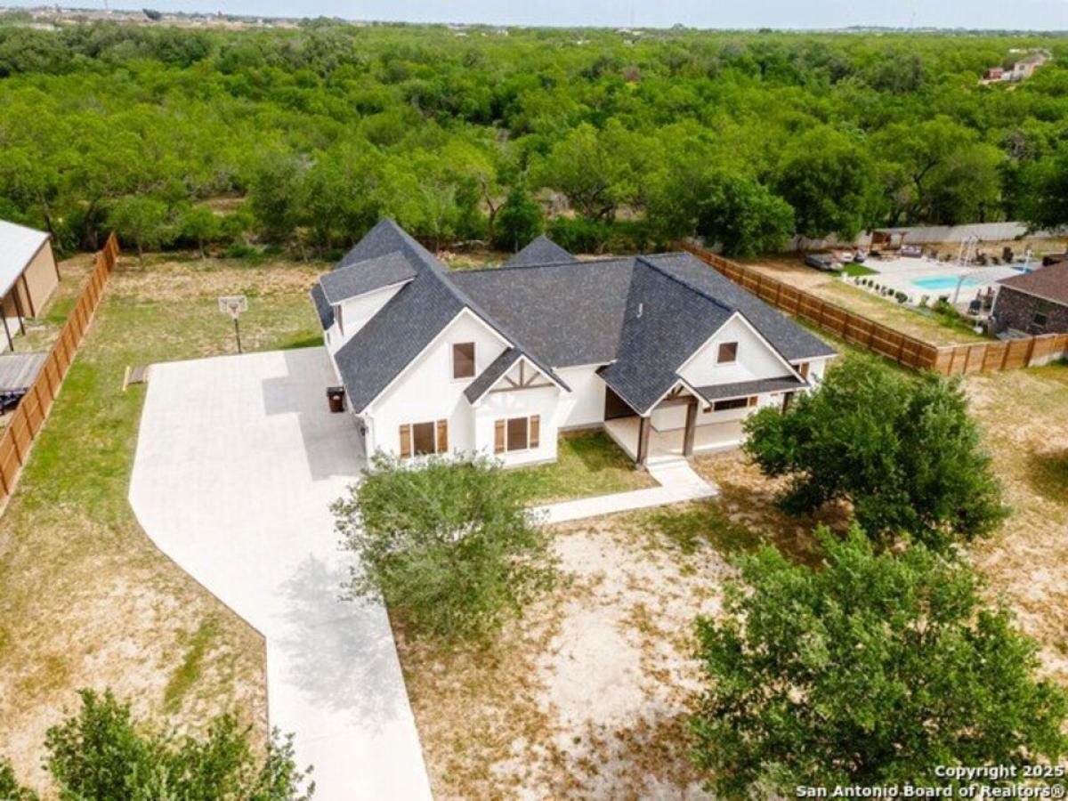 Welcome to this beautifully crafted 2022 custom-built home, offering 3,316 sqft of thoughtfully designed living space on a flat .75-acre lot with no rear neighbors, backing up to a private ranch.This modern open-concept home features 4 bedrooms and 4 full bathrooms, including a spacious primary suite with a luxurious bath - complete with a vintage-style standalone tub, rain shower, and a large walk-in closet with its own private laundry area. Bedrooms 2 and 3 serve as guest suites with their own bathrooms, while the 4th bedroom stands out with vaulted ceilings and a unique hidden loft accessible by ladder! The home features a chef#039;s kitchen with gas cooking, a pot filler, white quartz countertops, a massive walk-in pantry, and a wet bar in the living room. The living area is enhanced with tray ceilings, ceramic wood-look tile throughout, and two massive solid wood beams that frame the welcoming front entrance. Upstairs, you#039;ll find a fully pre-wired media room with surround sound connections, along with an attached office and bonus room that can easily be used as a 5th and 6th bedroom if needed. This property also includes two laundry areas - one conveniently located inside the primary suite#039;s closet and a second on the opposite side of the home. The 2-car garage offers built-in storage and a dedicated mop closet, while additional storage can be found throughout the home. The large covered patio comes pre-plumbed for an outdoor kitchen, and the entire property is equipped with a security camera system, with all appliances included in the sale. The lot is pre-plumbed and pre-wired for a future pool and pool house, offering even more possibilities for outdoor living. Located just 30 minutes from Downtown San Antonio and minutes from I-35, this one-of-a-kind property perfectly blends modern living, thoughtful design, and space to grow!