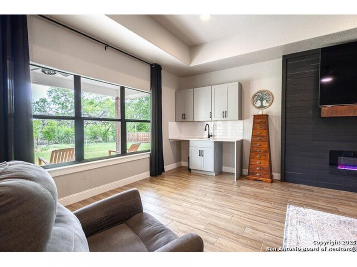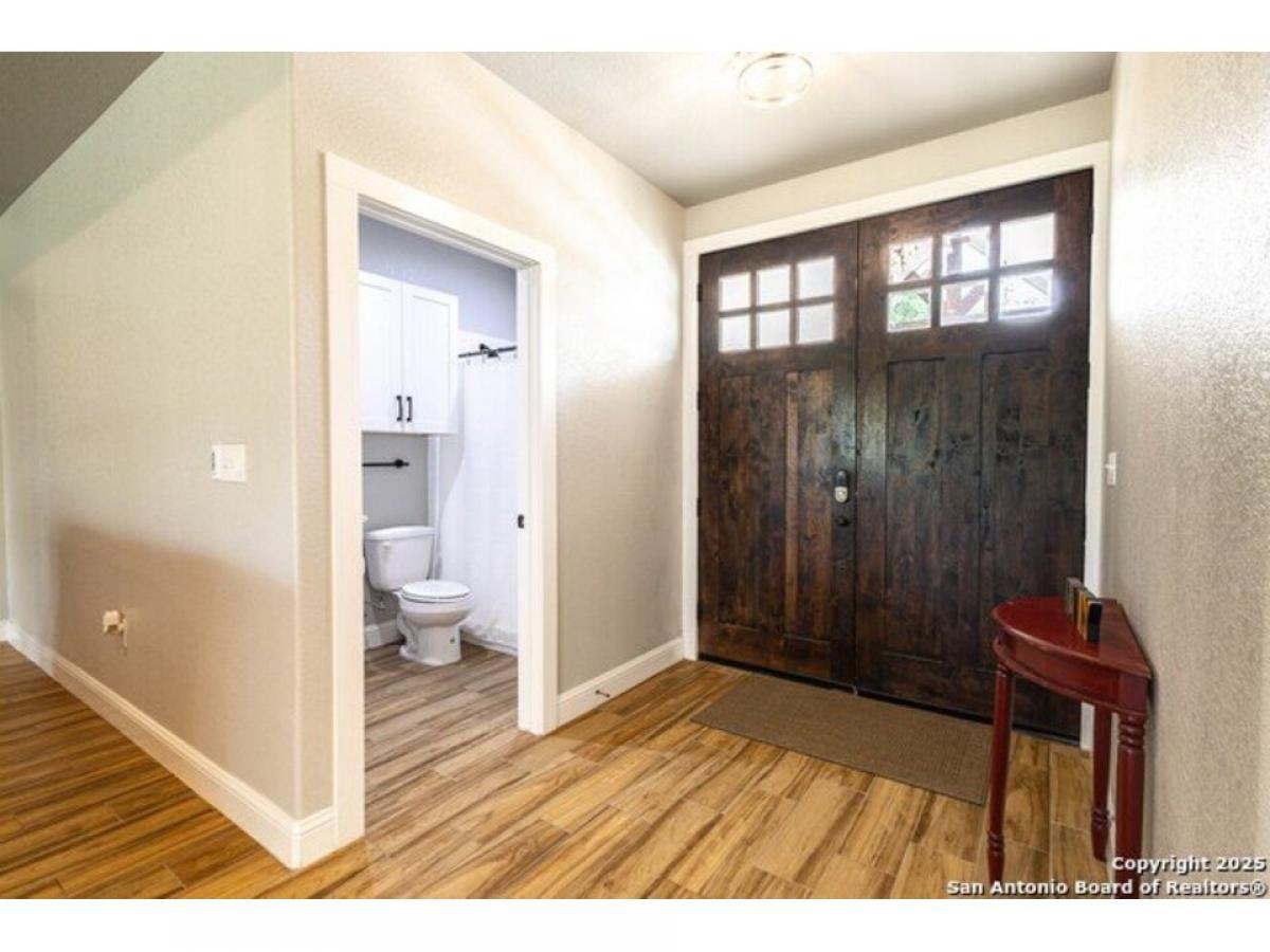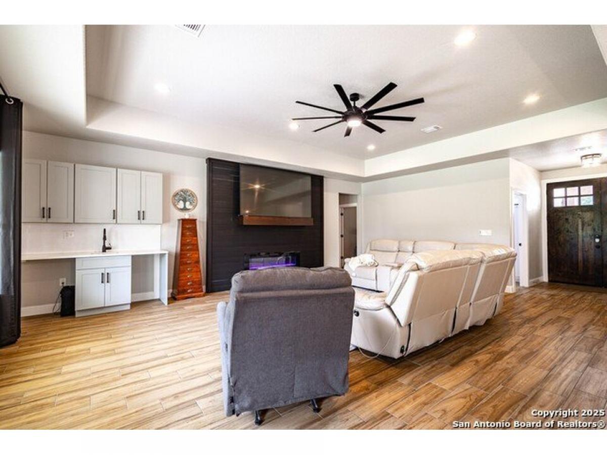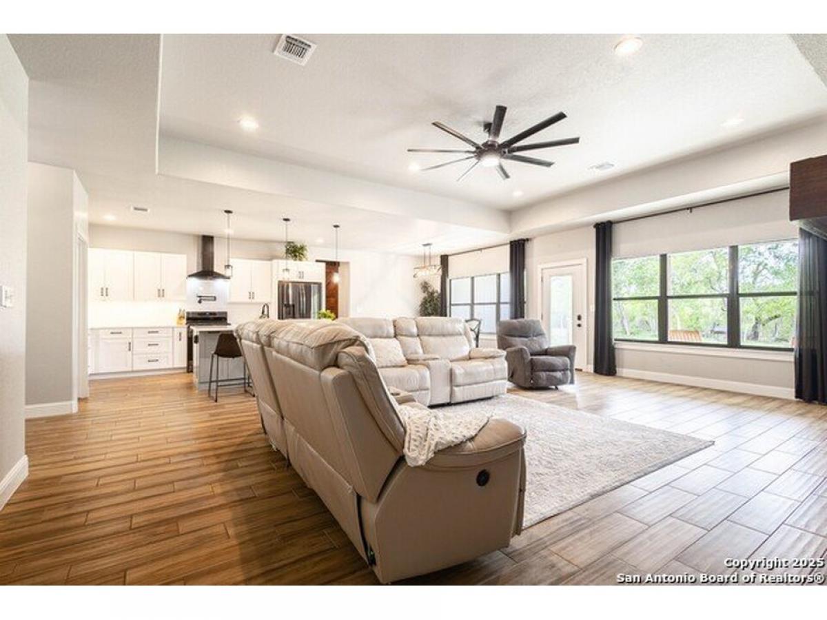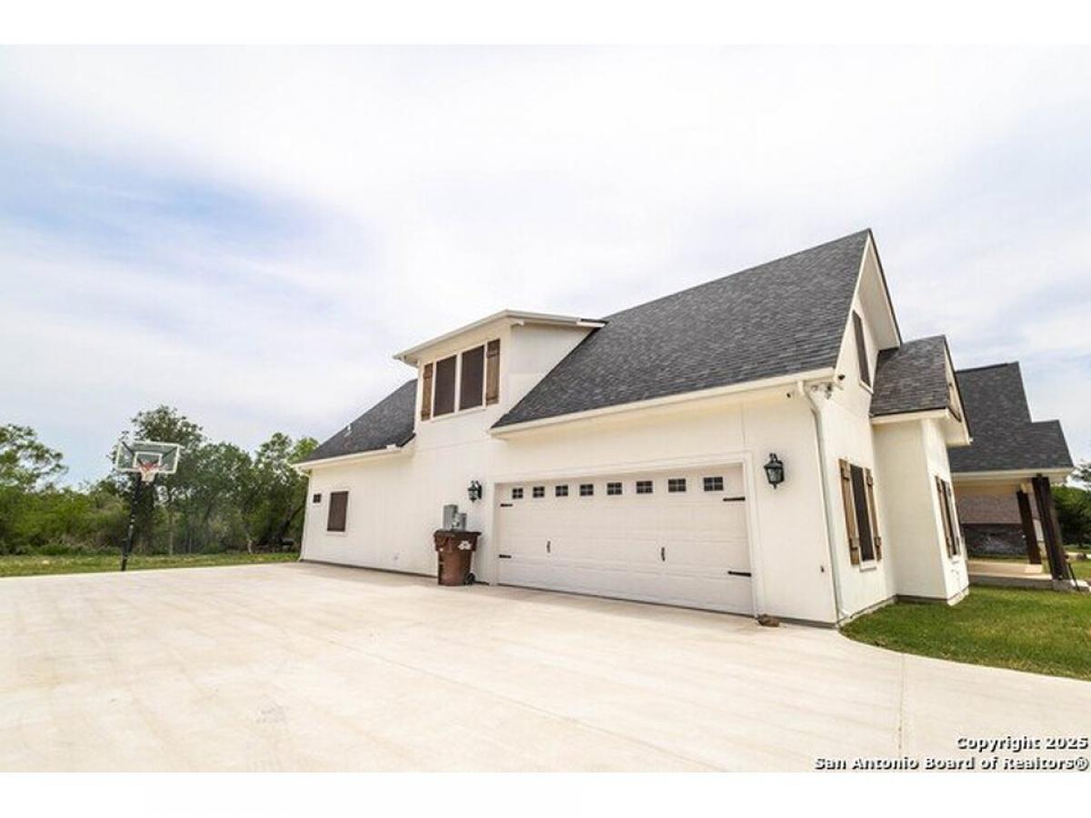 Welcome to this beautifully crafted 2022 custom-built home, offering 3,316 sqft of thoughtfully designed living space on a flat .75-acre lot with no rear neighbors, backing up to a private ranch.This modern open-concept home features 4 bedrooms and 4 full bathrooms, including a spacious primary suite with a luxurious bath - complete with a vintage-style standalone tub, rain shower, and a large walk-in closet with its own private laundry area. Bedrooms 2 and 3 serve as guest suites with their own bathrooms, while the 4th bedroom stands out with vaulted ceilings and a unique hidden loft accessible by ladder! The home features a chef#039;s kitchen with gas cooking, a pot filler, white quartz countertops, a massive walk-in pantry, and a wet bar in the living room. The living area is enhanced with tray ceilings, ceramic wood-look tile throughout, and two massive solid wood beams that frame the welcoming front entrance. Upstairs, you#039;ll find a fully pre-wired media room with surround sound connections, along with an attached office and bonus room that can easily be used as a 5th and 6th bedroom if needed. This property also includes two laundry areas - one conveniently located inside the primary suite#039;s closet and a second on the opposite side of the home. The 2-car garage offers built-in storage and a dedicated mop closet, while additional storage can be found throughout the home. The large covered patio comes pre-plumbed for an outdoor kitchen, and the entire property is equipped with a security camera system, with all appliances included in the sale. The lot is pre-plumbed and pre-wired for a future pool and pool house, offering even more possibilities for outdoor living. Located just 30 minutes from Downtown San Antonio and minutes from I-35, this one-of-a-kind property perfectly blends modern living, thoughtful design, and space to grow!
