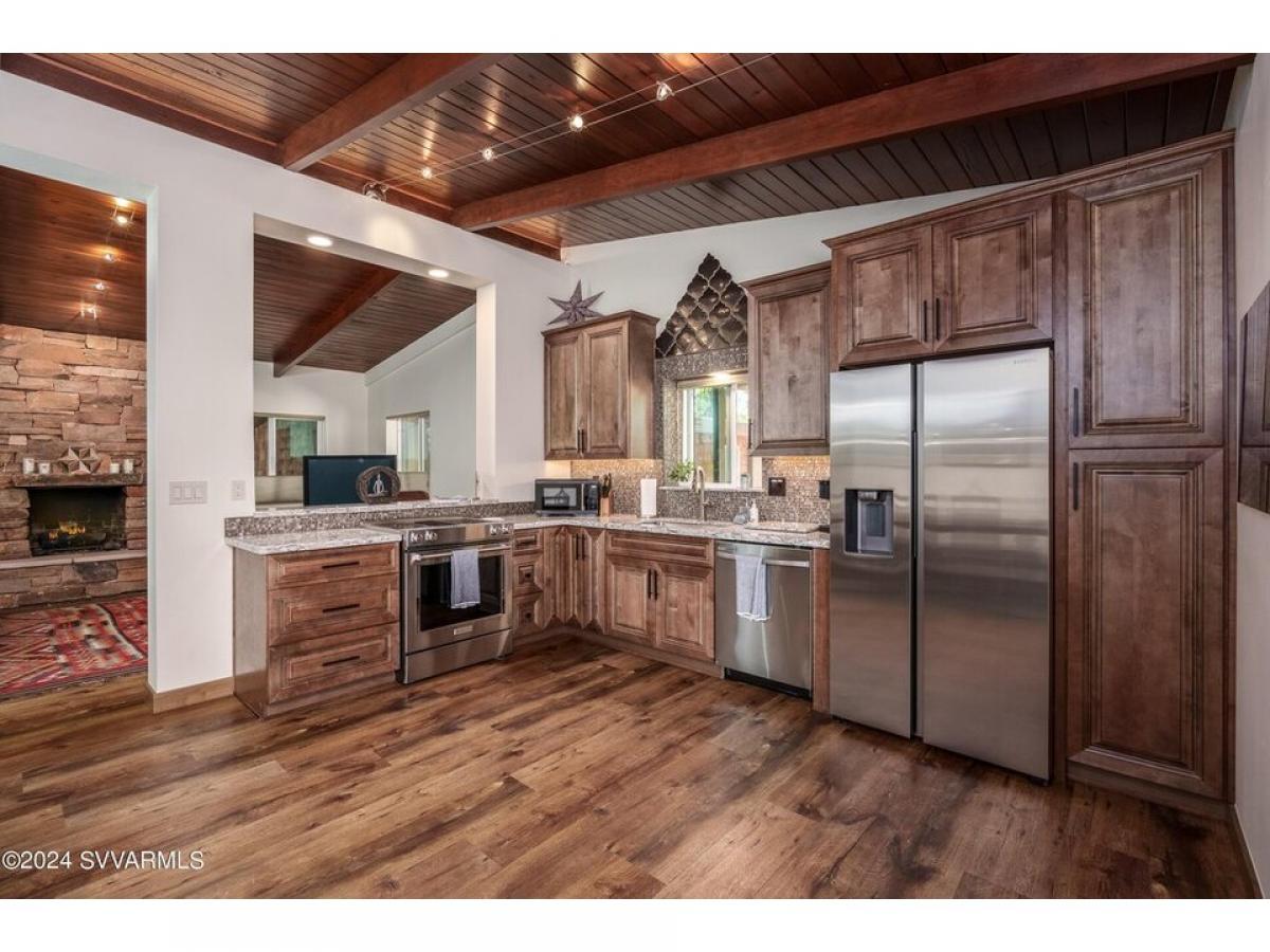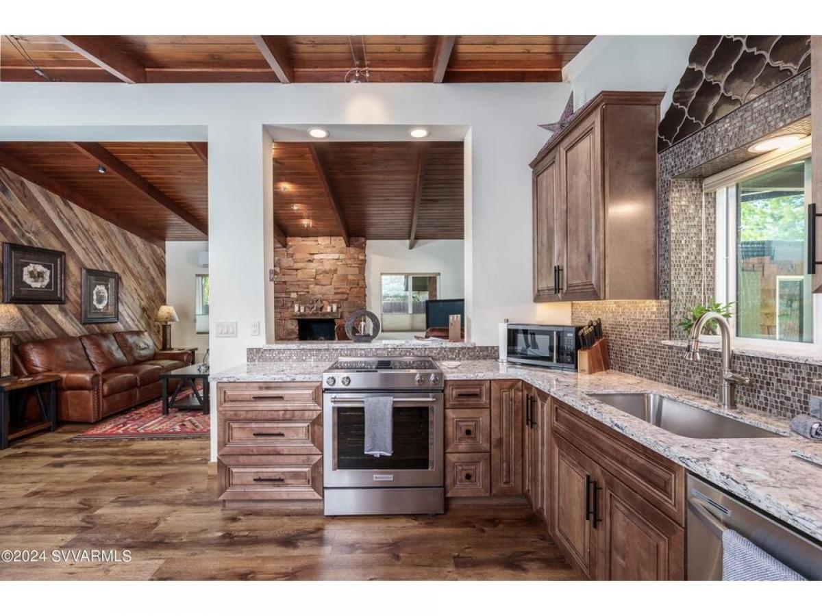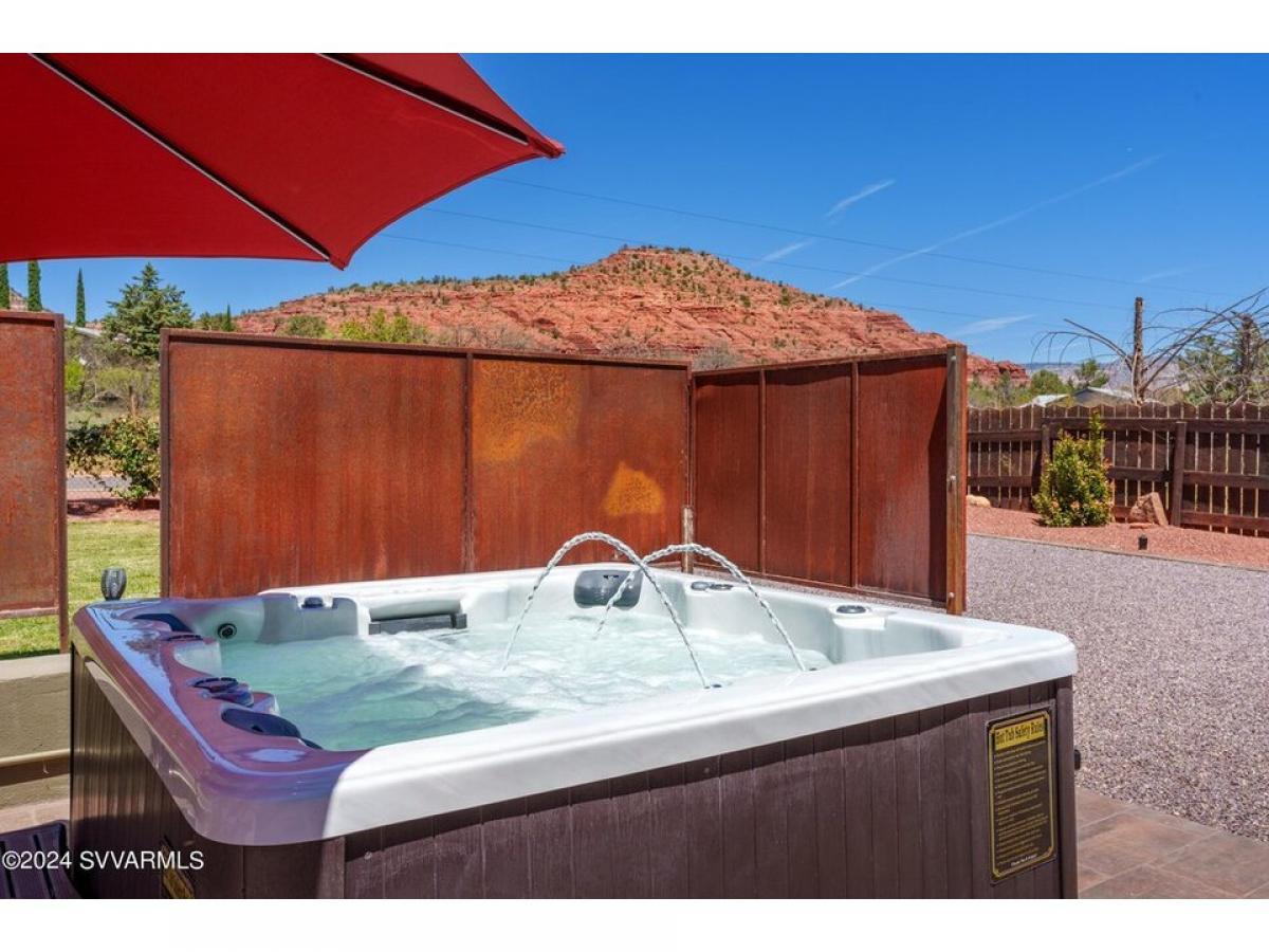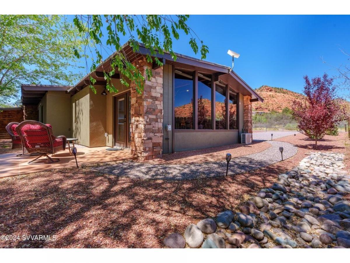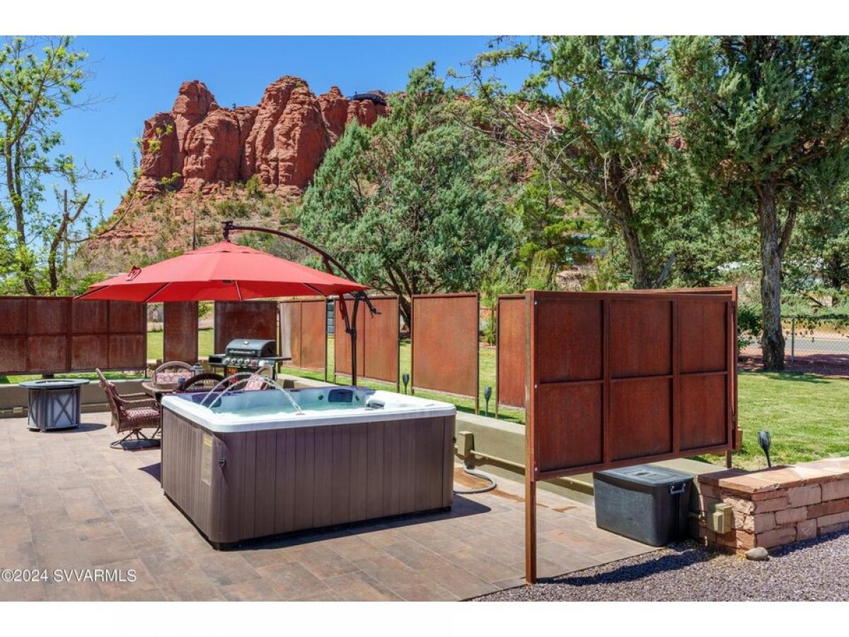 Sedona Knockout offers massive red rock views from this remodeled mid century design on iconic Disney Lane. Situated on the outskirts of town, this spotlessly updated home is an ideal getaway or long/short term rental near the placid waters of Oak Creek and lesser known trail gems like Pyramid, Catwalk and Scorpion trails. Extensive recent remodel added wood flooring, stacked red rock fireplaces, and an entirely new kitchen - ash cabinetry, quartz countertops, stainless appliances and fully remodeled baths. It#039;s fantastic inside but you#039;ll be drawn outdoors because its spectacularly finished with paver patios, hot tub, privacy fencing and immaculate grounds. There#039;s also a detached Pool Hall - perfect for table tennis, foosball or billiards.