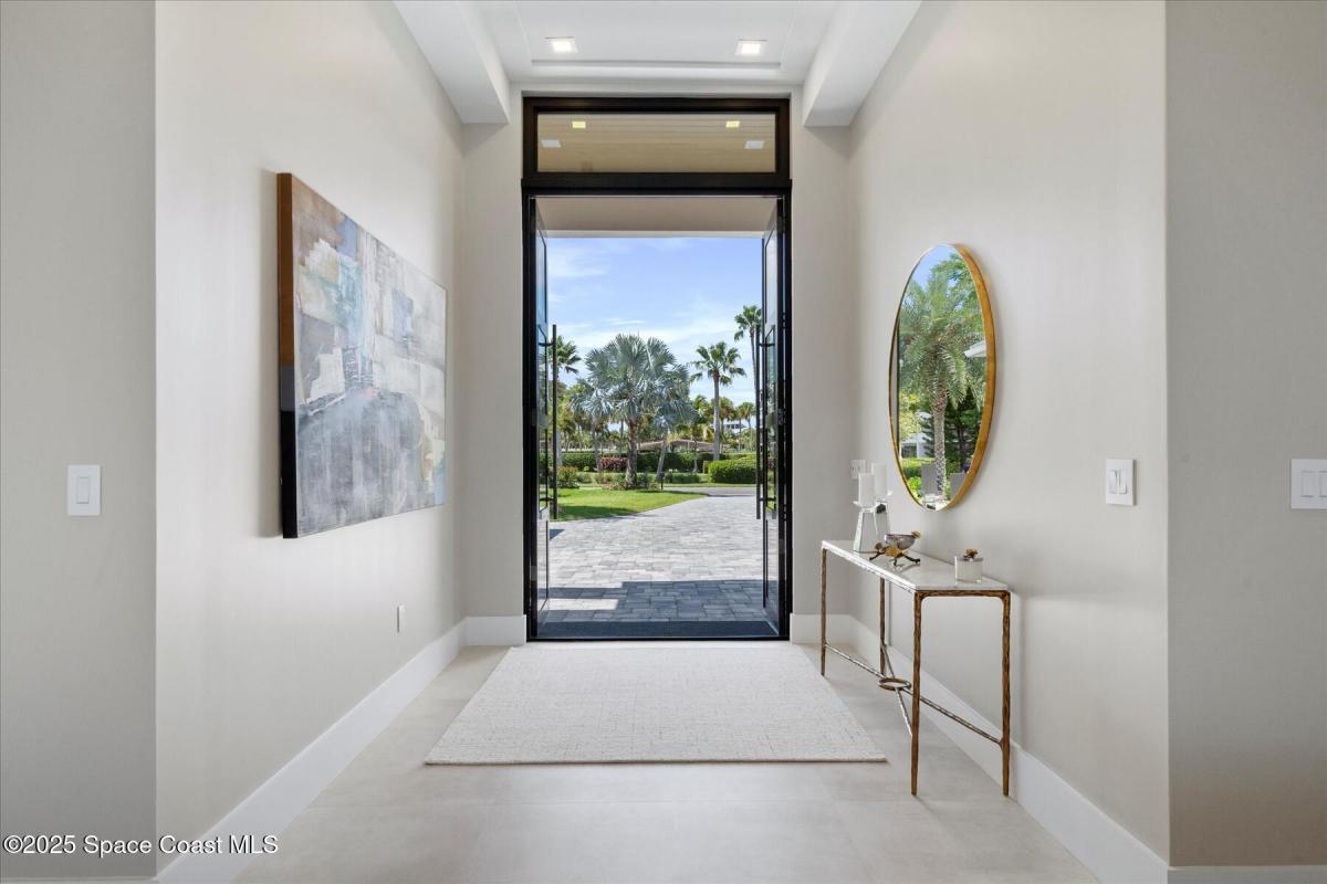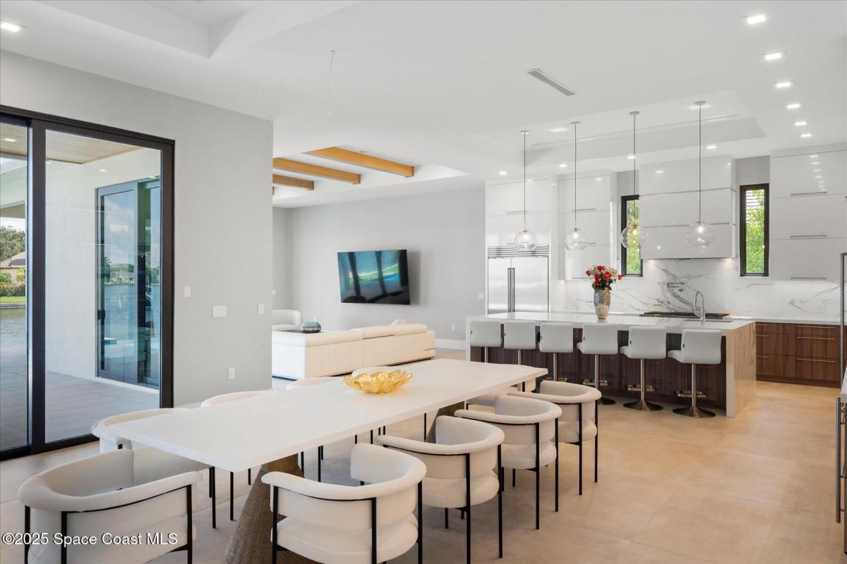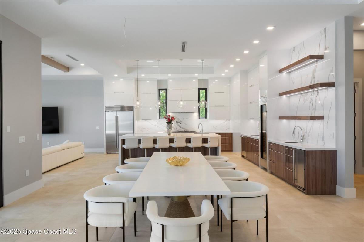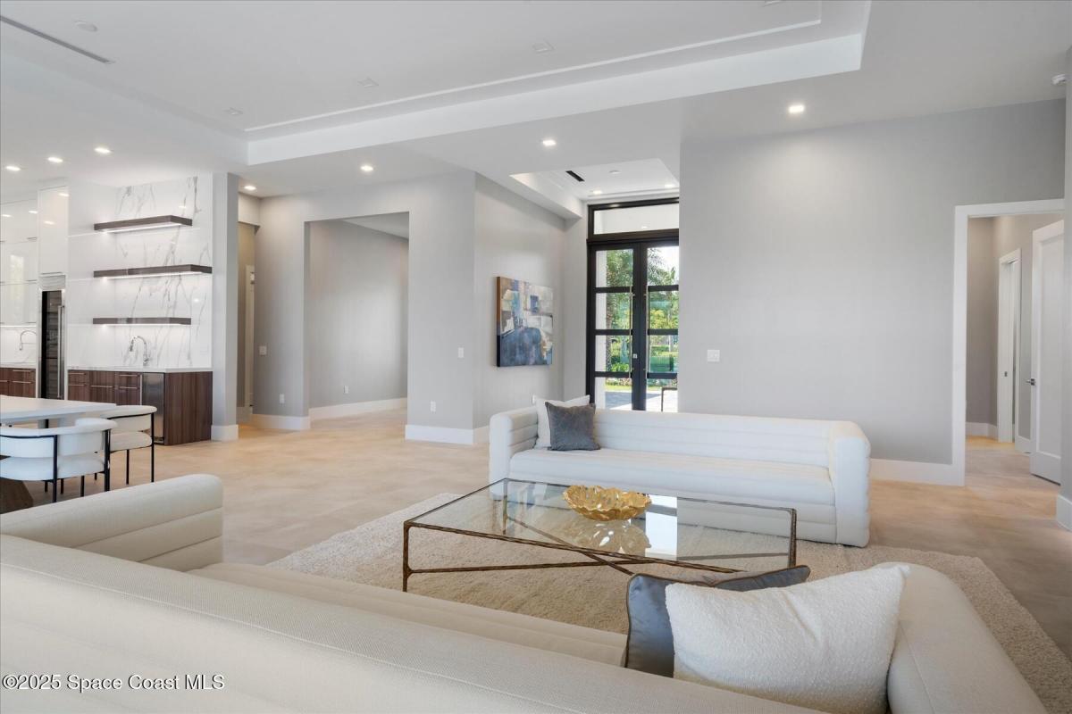Step into the pinnacle of luxury living with this exclusive, brand-new custom-built masterpiece in The Moorings. Perfectly positioned along the breathtaking Indian River waterfront, this architectural gem offers four spacious bedrooms, four and a half baths, and a private study, blending modern elegance with coastal charm.From the moment you arrive, the four-car garage, impact bronze casement windows, and sleek metal roof set the tone for sophistication. Step inside to be greeted by soaring ceilings with tray accents, an open-concept layout, and exquisite 4ftx4ft porcelain flooring imported from Spain. The living and dining areas feature a gas fireplace, creating a cozy yet grand ambiance.At the heart of the home, the gourmet kitchen is a chef's dream—anchored by a 10-foot quartz-wrapped island, Wolf gas stove, and Sub-Zero fridge. A wine and beverage center completes the experience, making it perfect for entertaining.