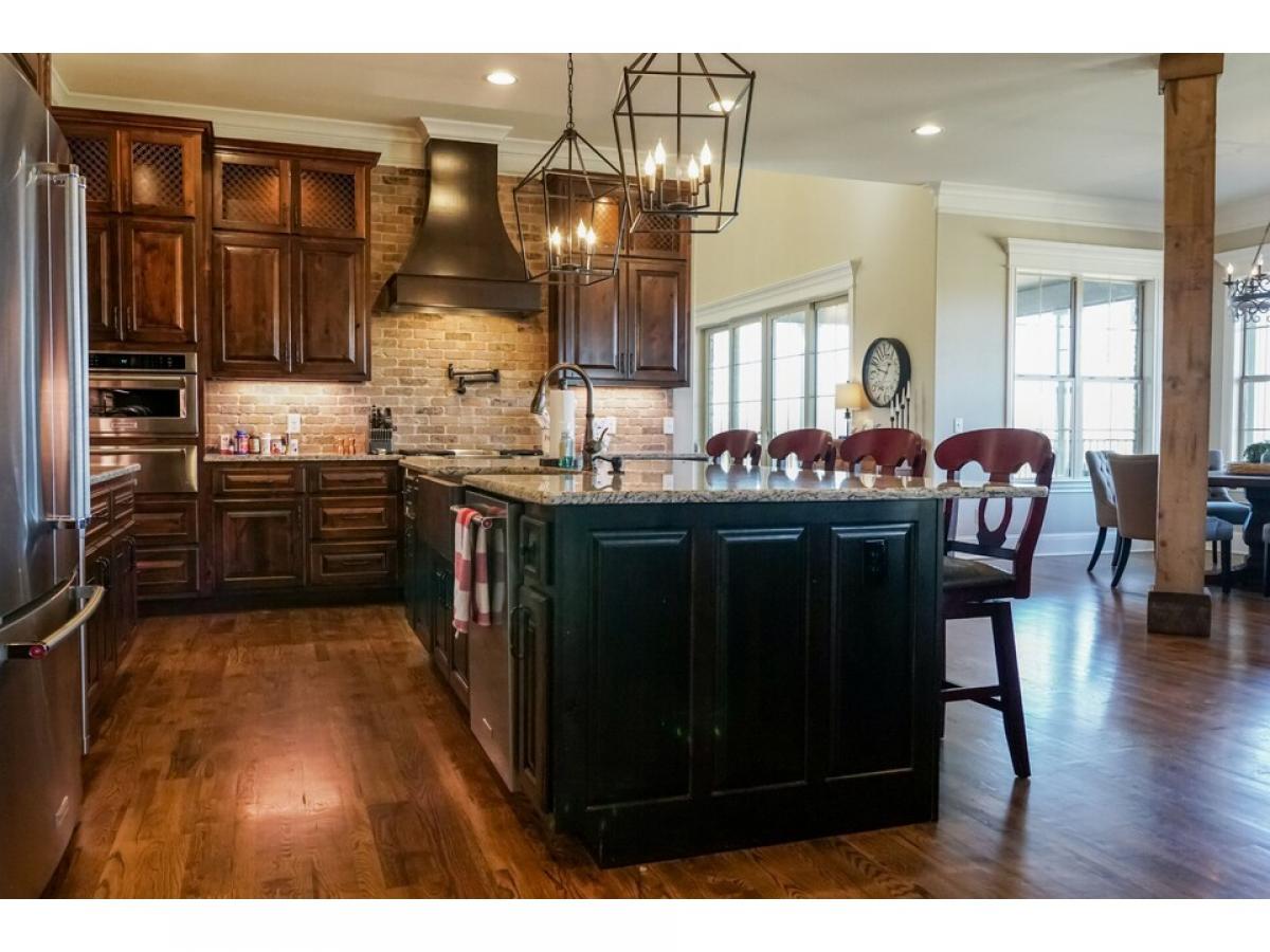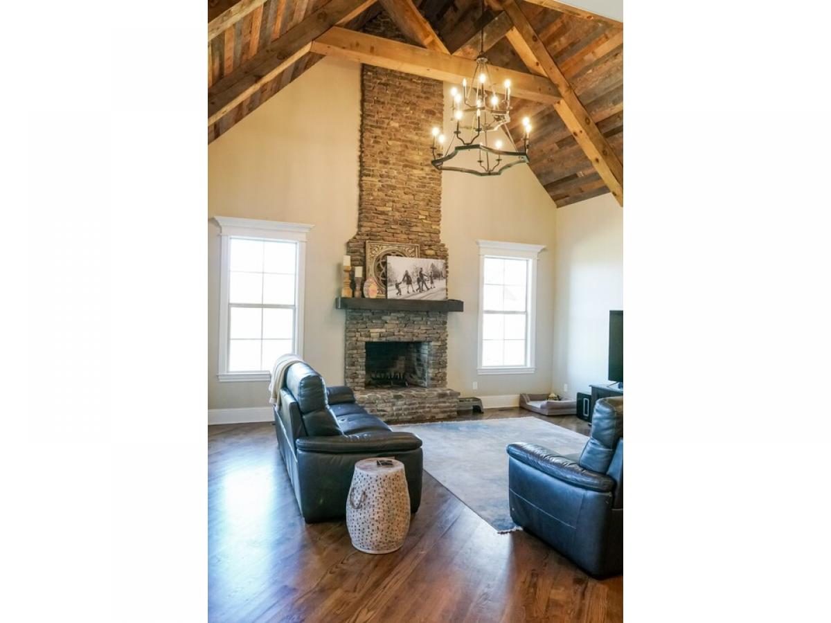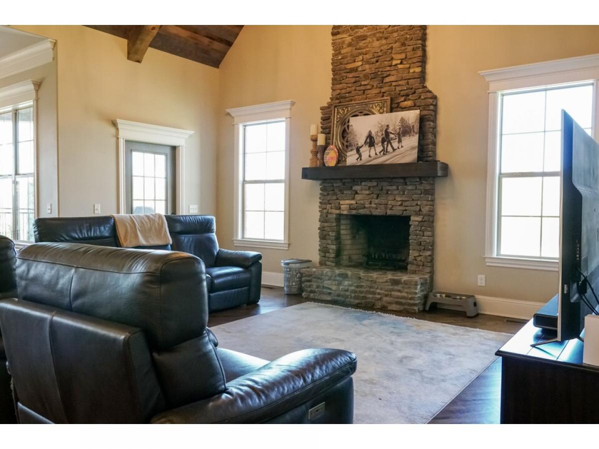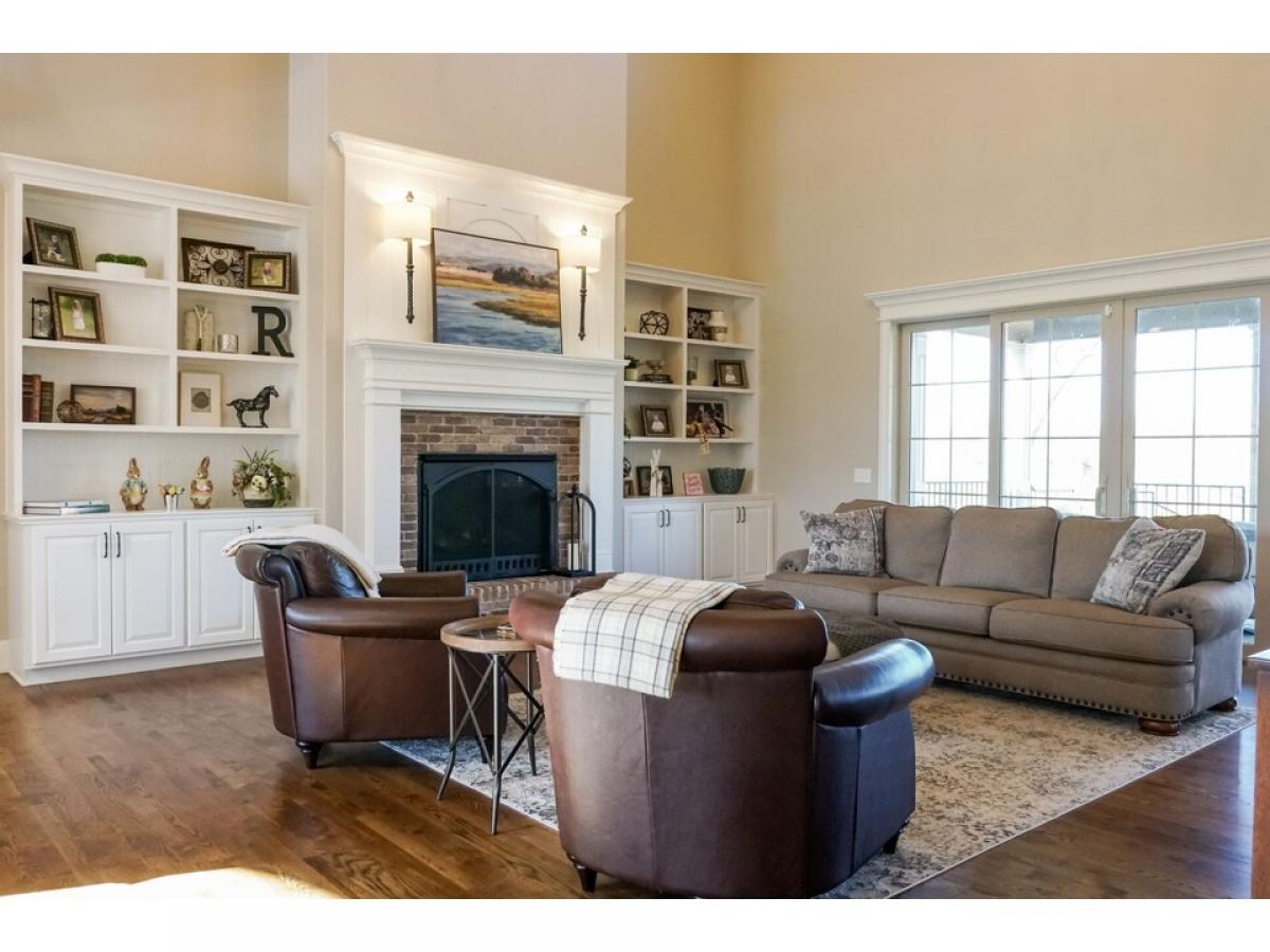 The perfect blend of brick, stone and shake an opulent home nestled on 2 private acres with mature trees. The first level features 2 large open living areas and an enormous primary suite, a cherry paneled office with gas fireplace, an elegant powder room, and a secondary bedroom with full bath. The central grand room boasts a coffered ceiling, gas fireplace, built-ins, large patio door leading to a generous covered porch with a beautiful view and an adjoining dining area. An adjacent open area shows off the gourmet with custom built knotty alder cabinets and KitchenAid appliances, which flows to a large breakfast area and and angled family room with wood burning fireplace, vaulted ceiling lined with barnwood. The second level has two bedrooms, two full baths and 3 bonus areas.