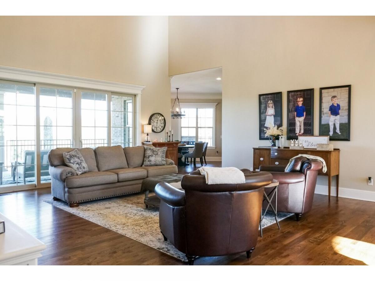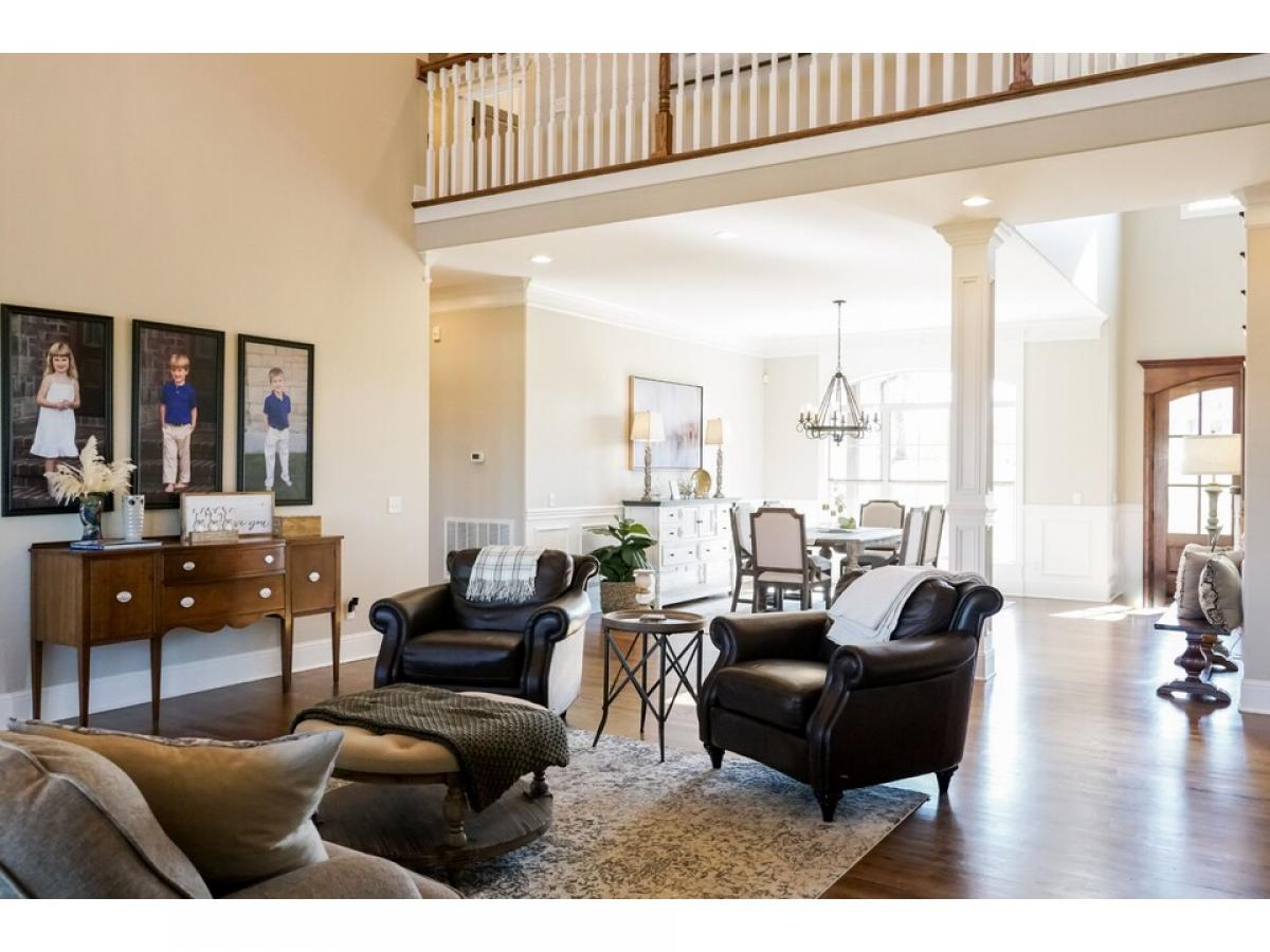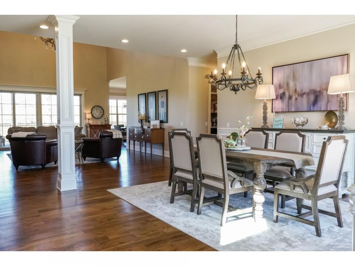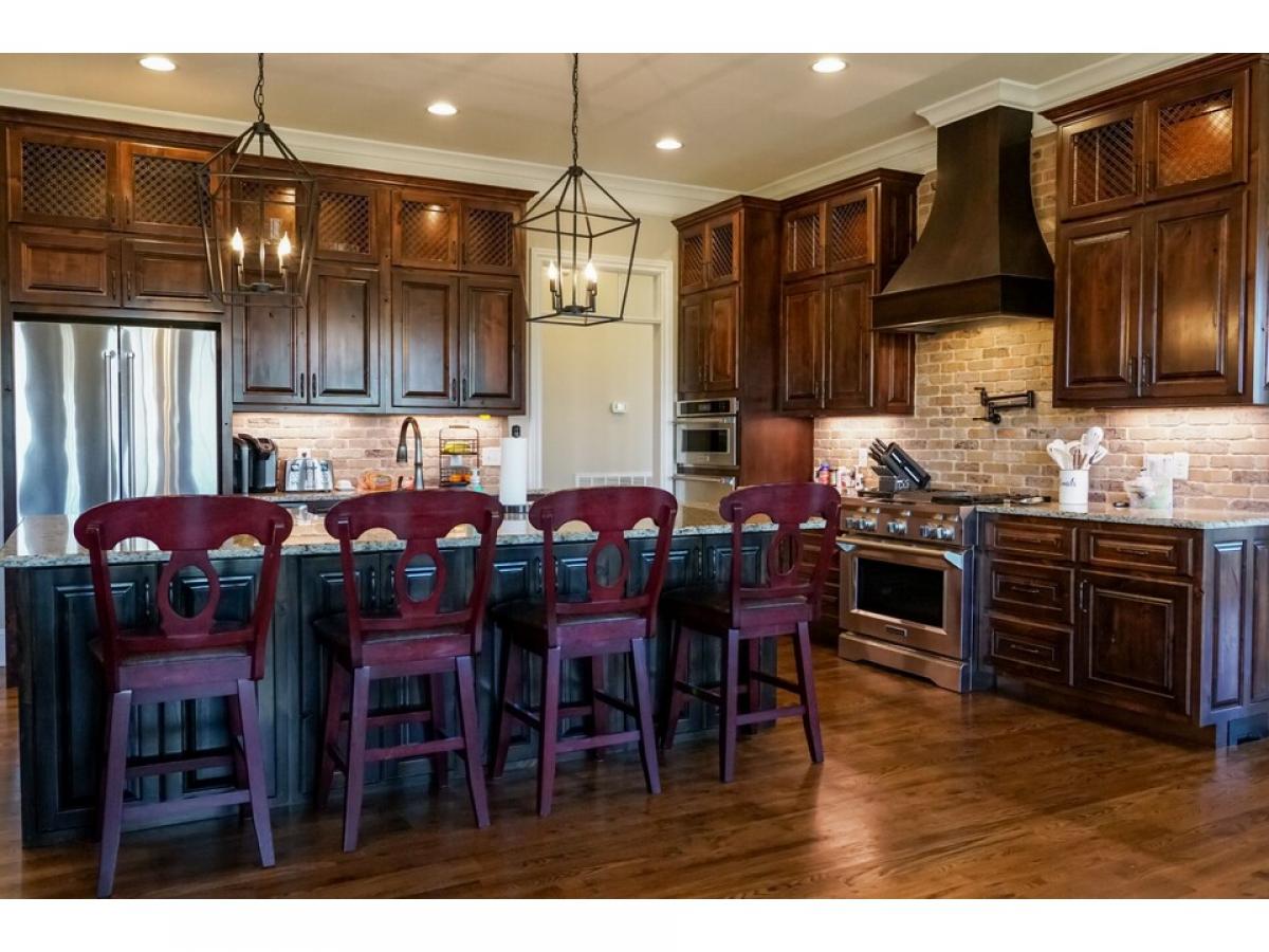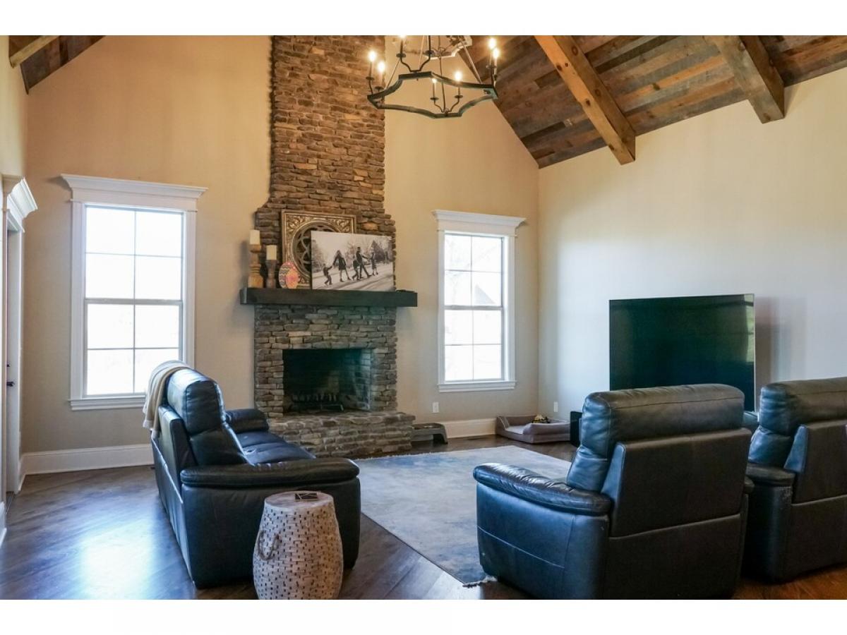 The perfect blend of brick, stone and shake an opulent home nestled on 2 private acres with mature trees. The first level features 2 large open living areas and an enormous primary suite, a cherry paneled office with gas fireplace, an elegant powder room, and a secondary bedroom with full bath. The central grand room boasts a coffered ceiling, gas fireplace, built-ins, large patio door leading to a generous covered porch with a beautiful view and an adjoining dining area. An adjacent open area shows off the gourmet with custom built knotty alder cabinets and KitchenAid appliances, which flows to a large breakfast area and and angled family room with wood burning fireplace, vaulted ceiling lined with barnwood. The second level has two bedrooms, two full baths and 3 bonus areas.