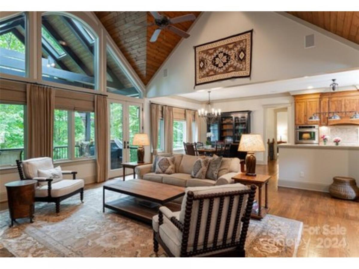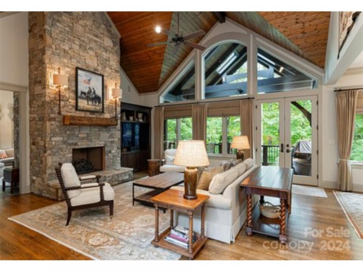 Welcome to Southcliff, Fairview’s premier gated community. Nestled in the heart of the Blue Ridge Mountains and just minutes from downtown Asheville, this immaculate 4-bedroom home offers both privacy and convenience. The meticulously manicured landscaping features a serene water feature, providing a peaceful retreat. Enjoy easy access to Southcliff's trails, pavilions, and the surrounding mountain beauty. This 4,660 sq ft home is designed for mountain living at its finest, with multiple outdoor living spaces, including a spacious back deck, and a custom outdoor stone fireplace. Inside, the home boasts vaulted ceilings, abundant natural light, stunning hardwood floors, and an open floor plan perfect for entertaining. The custom chef's kitchen features granite countertops and luxury appliances, ideal for culinary enthusiasts. The lower level includes three bedrooms, a gym, ample storage space, and a movie theater. Come explore your mountain sanctuary!