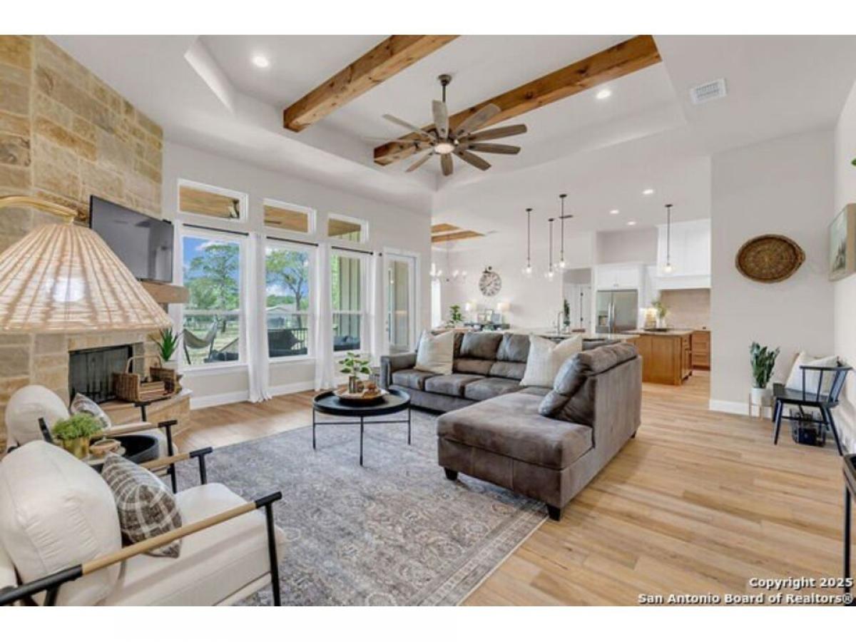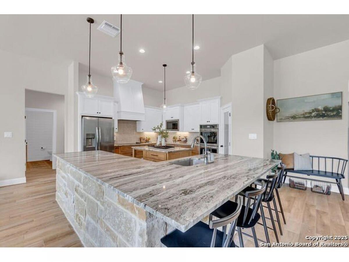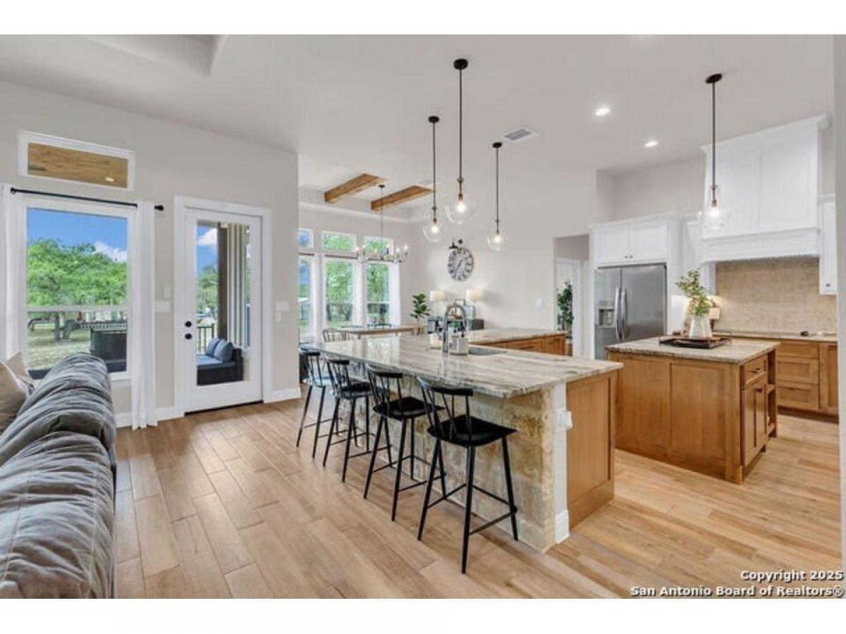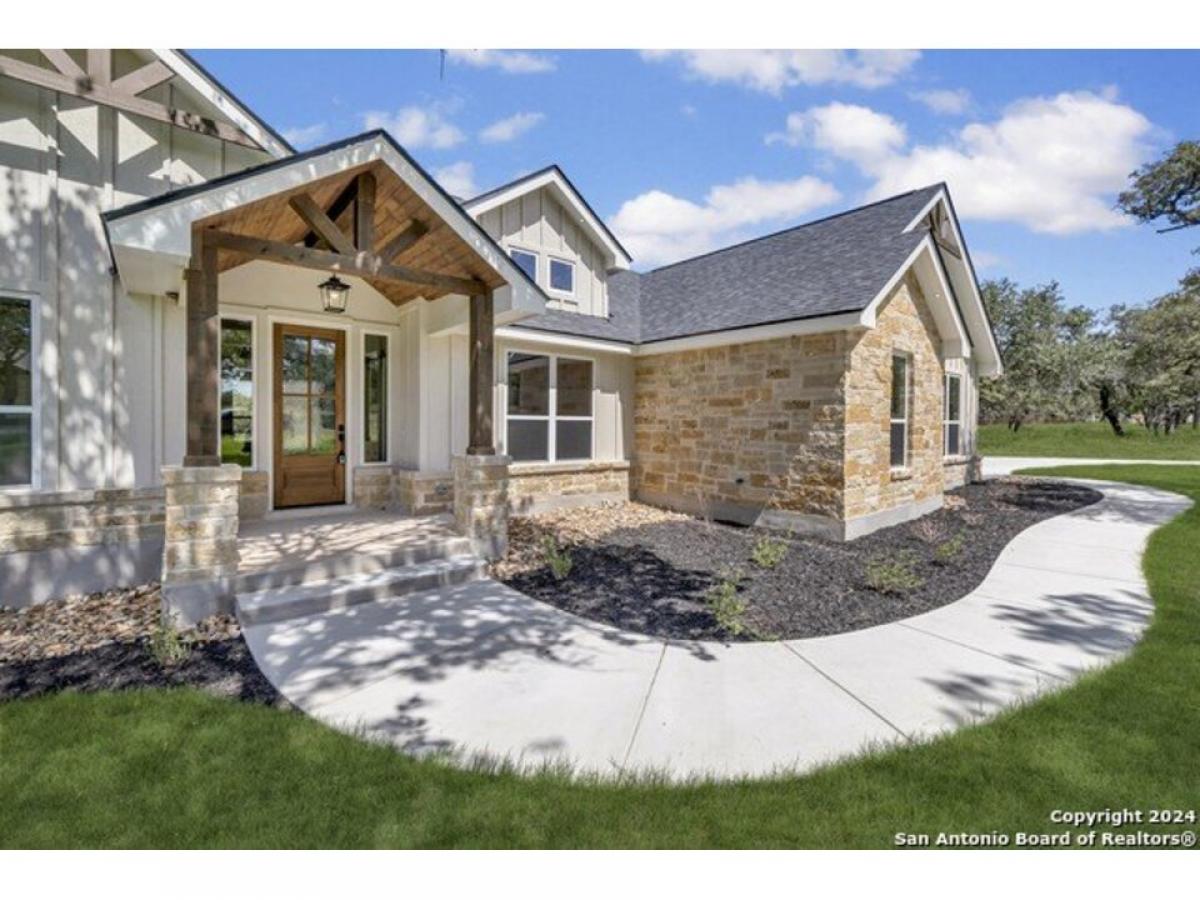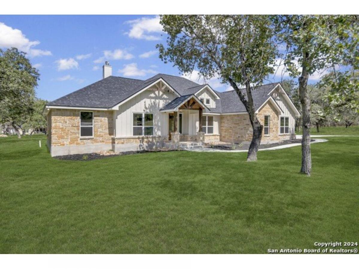 Step into the perfect blend of rustic charm and modern sophistication in this stunning 5-bedroom, 2.5-bath modern farmhouse located in the highly desirable Eden Crossing subdivision. Situated on a full one-acre lot with mature trees and roaming wildlife, this property offers an upscale country lifestyle just 30 minutes from downtown San Antonio. From the moment you arrive, you#039;ll be greeted by a welcoming exterior, complete with a thoughtfully designed landscape package, native Texas plants, and the peaceful ambiance of rural living. Inside, the open-concept floor plan was designed with both functionality and comfort in mind-ideal for growing families, entertainers, or those who simply love a spacious and airy layout. At the heart of the home is a chef#039;s kitchen built to impress. Enjoy upgraded finishes, a large center island prep station, custom cabinetry, stainless steel appliances, and a seamless flow into the living and dining areas. Gather around the stunning floor-to-ceiling rock fireplace, the focal point of the living room that adds both warmth and wow-factor. The primary suite is a true spa-like retreat, offering tranquility and luxury with a beautifully appointed en-suite bath featuring dual sinks, a soaking tub, and a huge walk-in shower designed to melt away the stress of the day. Four additional bedrooms provide flexibility for guests, home offices, or playrooms, and are positioned for privacy and convenience. Step outside to your personal outdoor haven-a covered patio with a fully equipped outdoor kitchen makes weekend grilling and evening entertaining a breeze. Whether you#039;re sipping coffee while watching deer wander through the trees or hosting friends for a barbecue, the outdoor space is just as inviting as the indoors. Built by a local, highly respected builder, this home was crafted with quality, attention to detail, and timeless design in mind. Every fixture, finish, and feature has been carefully selected to create a home that is both stylish and built to last. A few of the Additional highlights are designer light fixtures and finishes throughout, and oversized utility/mudroom, a Spacious two-car garage, tons of natural light and storage, and a Peaceful, nature-filled setting with room to expand! Eden Crossing is one of the areas most sought-after communities, known for its large lots, custom homes, and unbeatable location. With just a short commute into local towns and 30 minutes to San Antonio, this home offers the perfect balance of country serenity and city convenience. Don#039;t miss this opportunity to own a modern farmhouse masterpiece in a neighborhood where homes like this rarely become available!