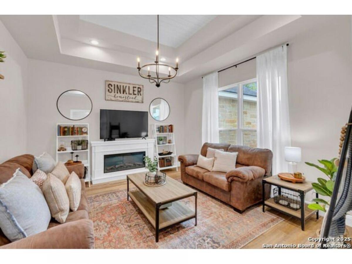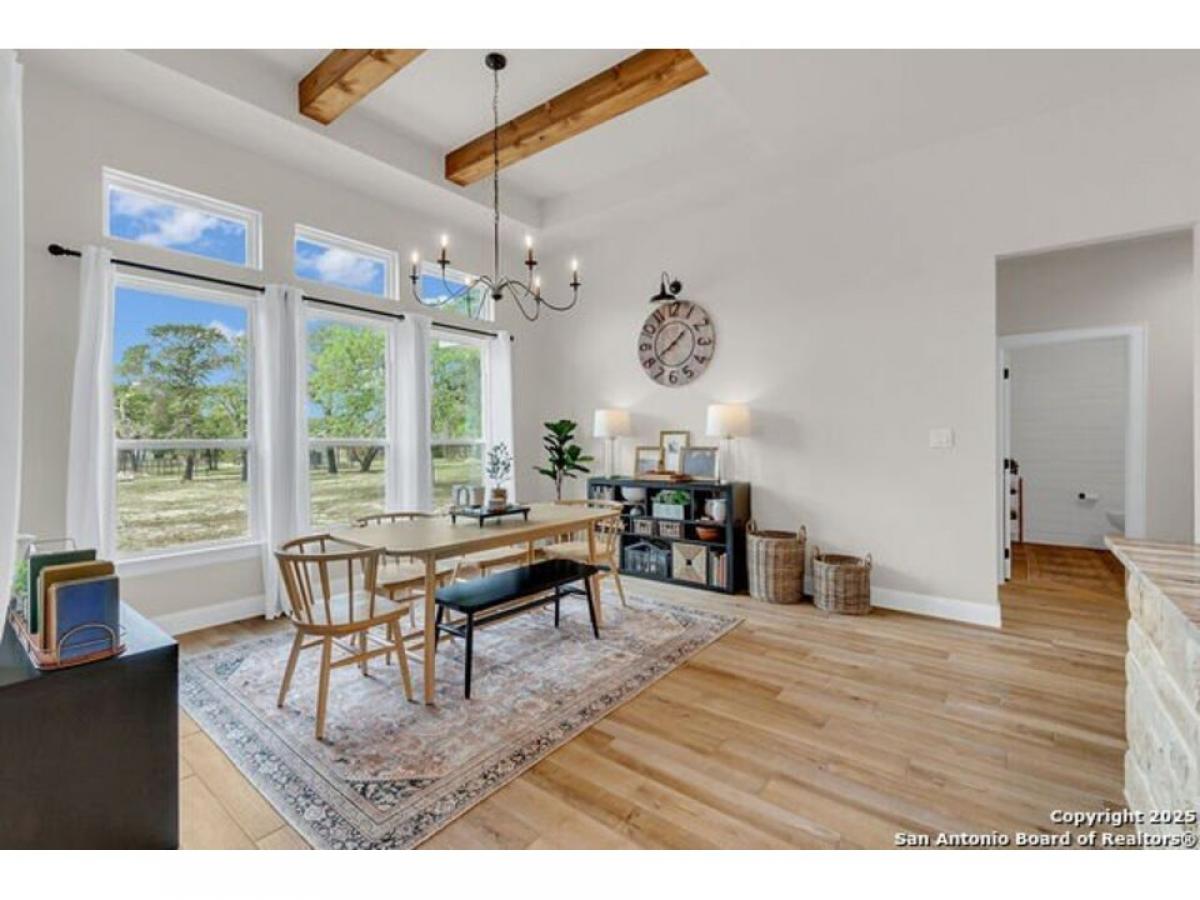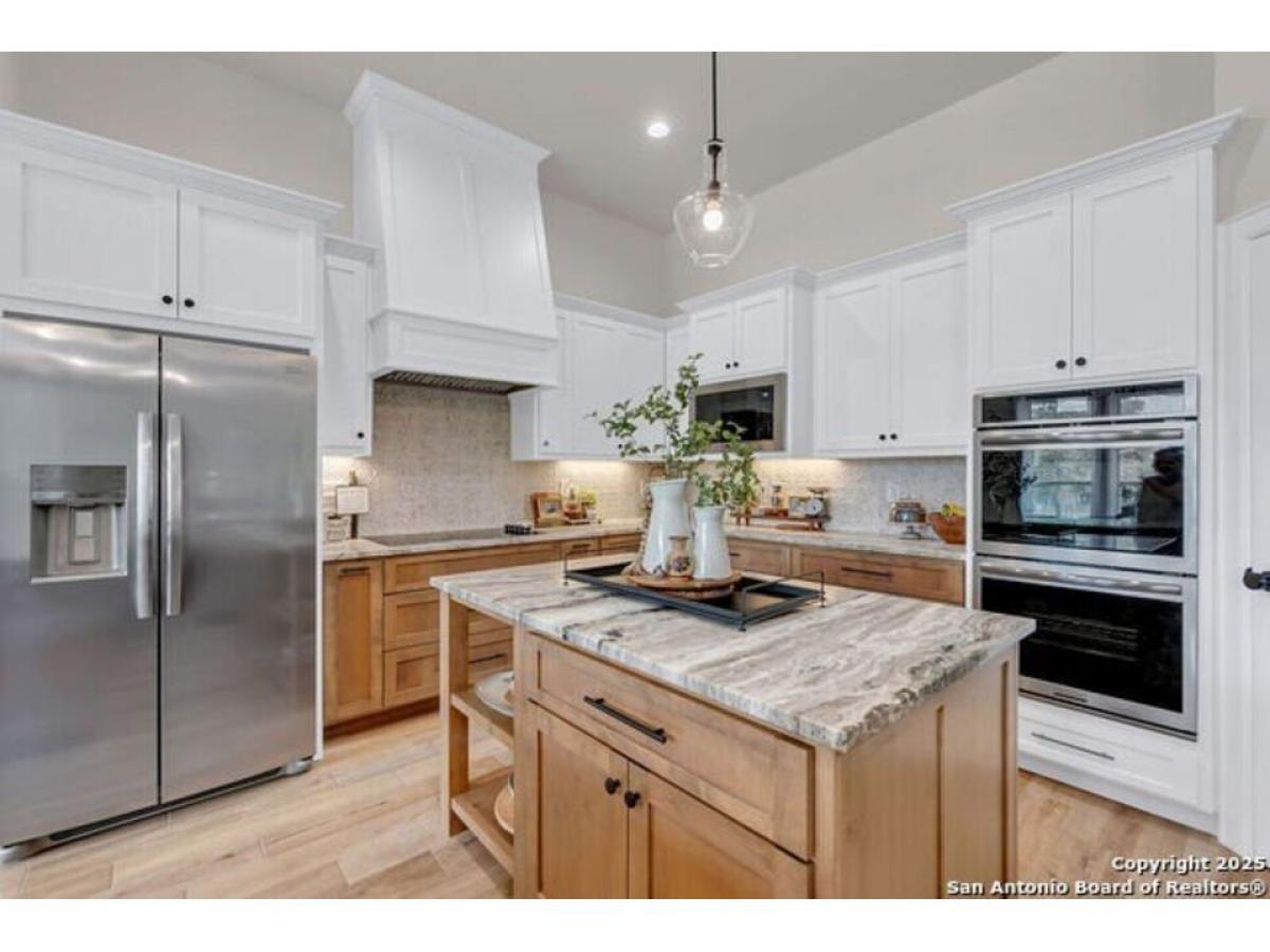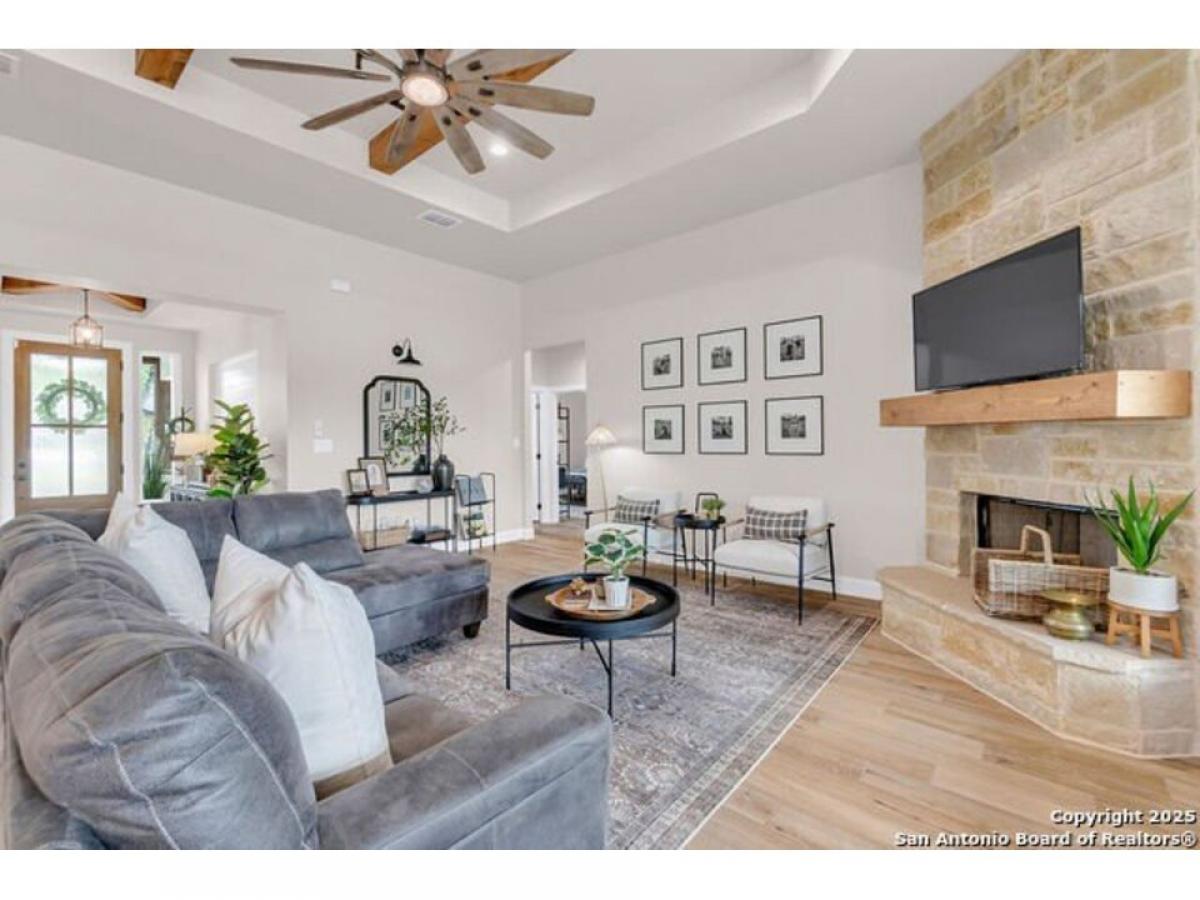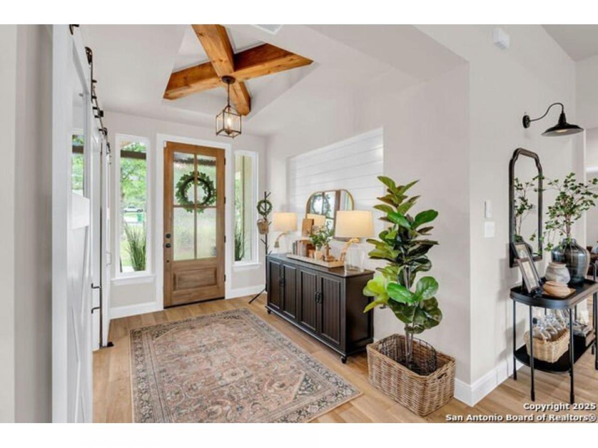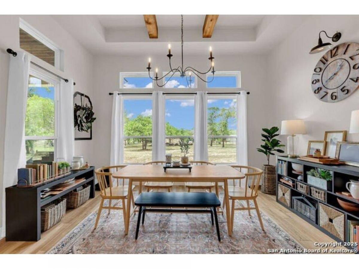 Step into the perfect blend of rustic charm and modern sophistication in this stunning 5-bedroom, 2.5-bath modern farmhouse located in the highly desirable Eden Crossing subdivision. Situated on a full one-acre lot with mature trees and roaming wildlife, this property offers an upscale country lifestyle just 30 minutes from downtown San Antonio. From the moment you arrive, you#039;ll be greeted by a welcoming exterior, complete with a thoughtfully designed landscape package, native Texas plants, and the peaceful ambiance of rural living. Inside, the open-concept floor plan was designed with both functionality and comfort in mind-ideal for growing families, entertainers, or those who simply love a spacious and airy layout. At the heart of the home is a chef#039;s kitchen built to impress. Enjoy upgraded finishes, a large center island prep station, custom cabinetry, stainless steel appliances, and a seamless flow into the living and dining areas. Gather around the stunning floor-to-ceiling rock fireplace, the focal point of the living room that adds both warmth and wow-factor. The primary suite is a true spa-like retreat, offering tranquility and luxury with a beautifully appointed en-suite bath featuring dual sinks, a soaking tub, and a huge walk-in shower designed to melt away the stress of the day. Four additional bedrooms provide flexibility for guests, home offices, or playrooms, and are positioned for privacy and convenience. Step outside to your personal outdoor haven-a covered patio with a fully equipped outdoor kitchen makes weekend grilling and evening entertaining a breeze. Whether you#039;re sipping coffee while watching deer wander through the trees or hosting friends for a barbecue, the outdoor space is just as inviting as the indoors. Built by a local, highly respected builder, this home was crafted with quality, attention to detail, and timeless design in mind. Every fixture, finish, and feature has been carefully selected to create a home that is both stylish and built to last. A few of the Additional highlights are designer light fixtures and finishes throughout, and oversized utility/mudroom, a Spacious two-car garage, tons of natural light and storage, and a Peaceful, nature-filled setting with room to expand! Eden Crossing is one of the areas most sought-after communities, known for its large lots, custom homes, and unbeatable location. With just a short commute into local towns and 30 minutes to San Antonio, this home offers the perfect balance of country serenity and city convenience. Don#039;t miss this opportunity to own a modern farmhouse masterpiece in a neighborhood where homes like this rarely become available!