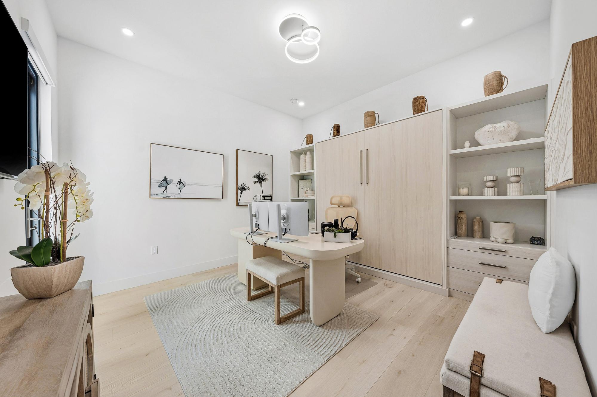 The primary suite offers a luxurious retreat complete with custom closets, designer wallpaper, spa-inspired finishes, and an electric toilet for elevated comfort. Secondary bedrooms also feature custom closet systems and en-suite baths with upgraded one-piece toilets. Even the office has been enhanced with a custom king-sized Murphy bed with integrated storage, offering versatility without sacrificing design.