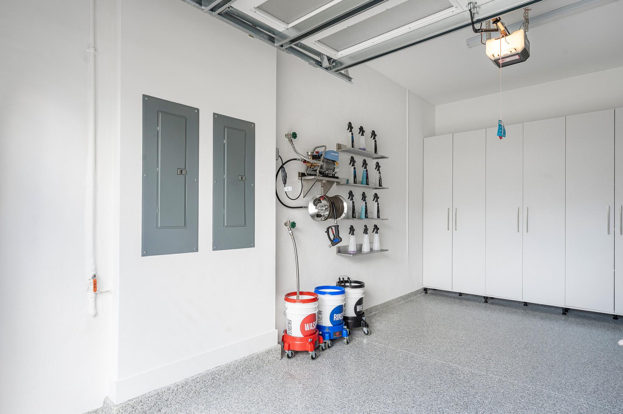 The garage itself reflects the same level of detail, featuring epoxy flooring, built-in cabinetry, a dedicated car washing station with pressure washer, and organized storage solutions.
