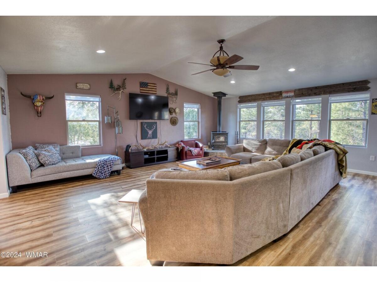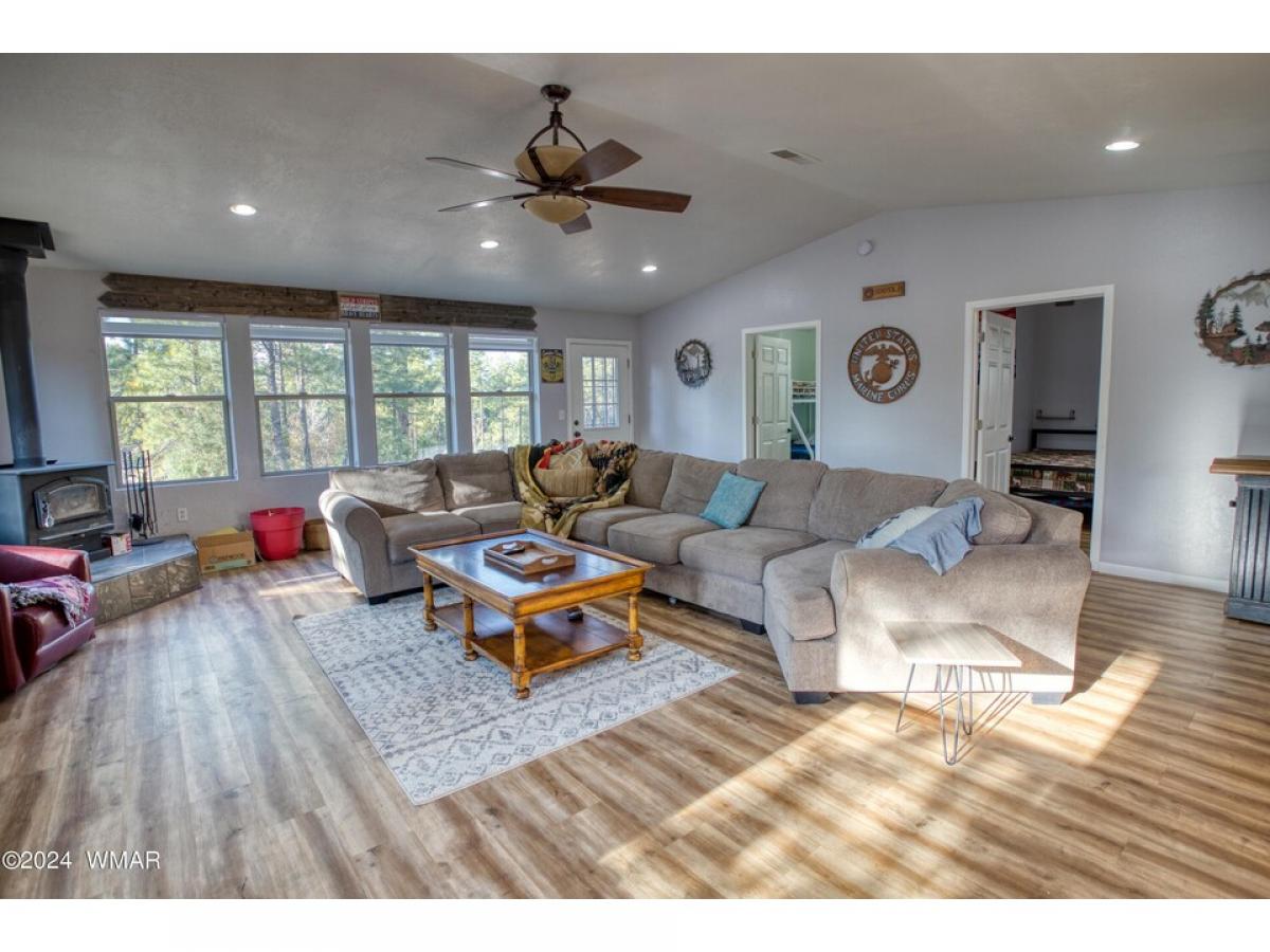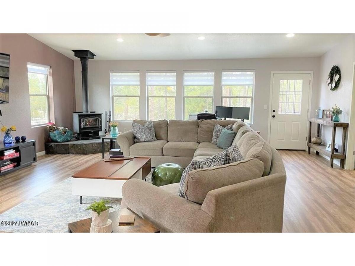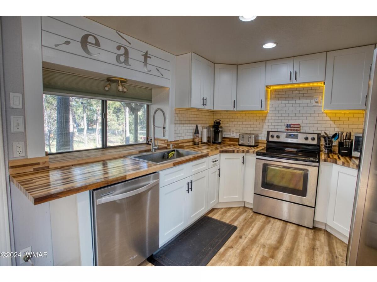 Price Improvement!! Gorgeously updated 4 bed 2 bath home on 1 fully fenced acre, nestled in the tall, cool pines! Don't let the year fool you, the list of new features throughout include: flooring, cabinets, butcher block countertops, stainless steel appliances, subway tile backsplash, sink and fixtures, window treatments, vanities & fixtures in the bathrooms, custom tile shower surrounds, and washer & dryer. This is a wonderfully spacious light and open, split bedroom floorpan! The home property has a workshop/storage building ,three decks, a covered patio and gazebo area. Fun for all ages! This property has a swing and a zip-line! Mostly Furnished!!2500 gal water tank with water delivery. Cash only sale, the original manufactured home is 1140 sq ft with a 864 sq add on.